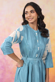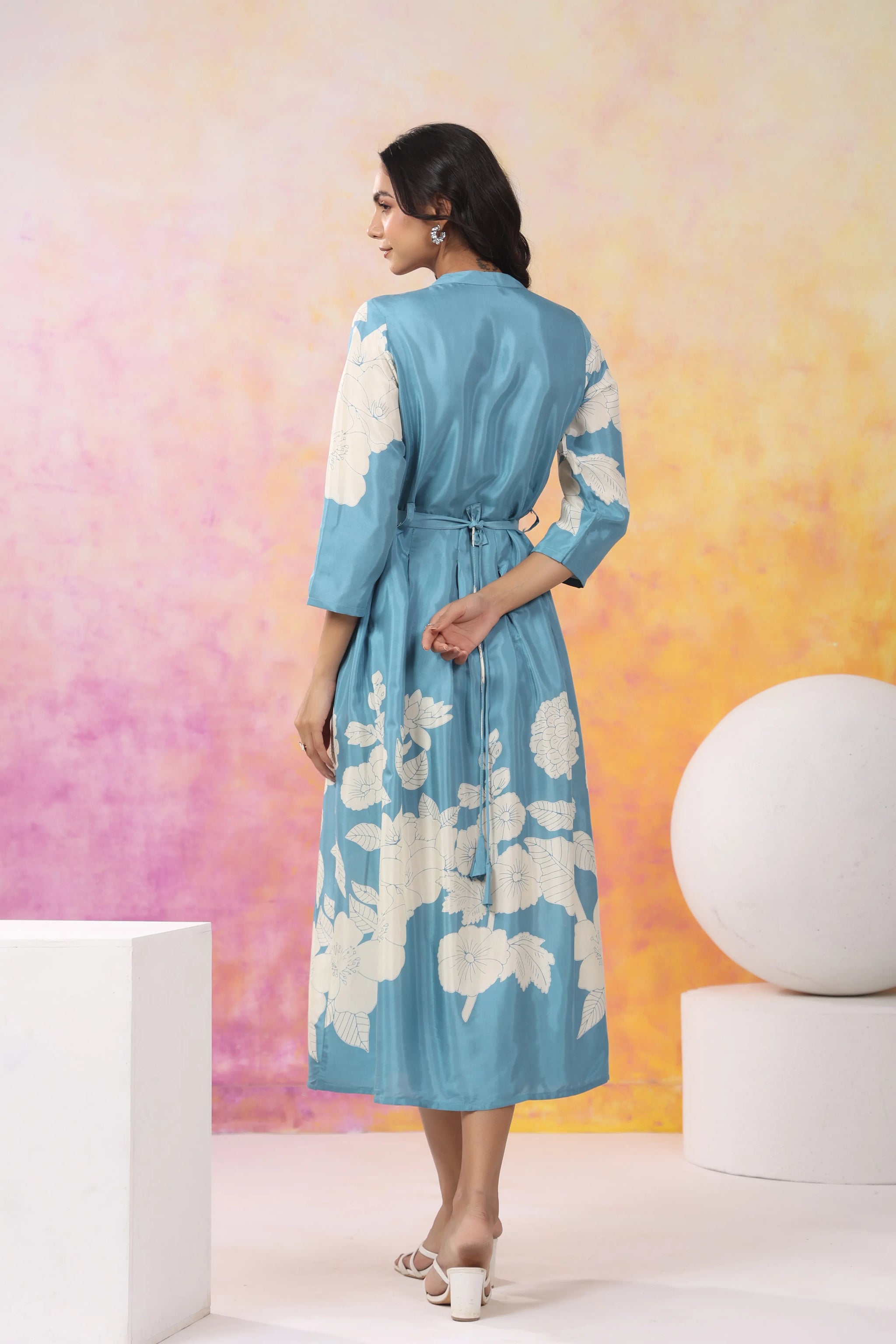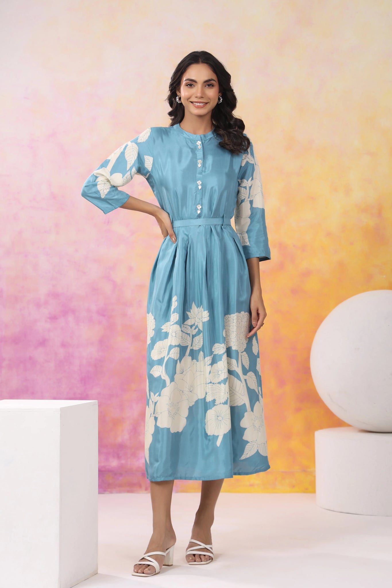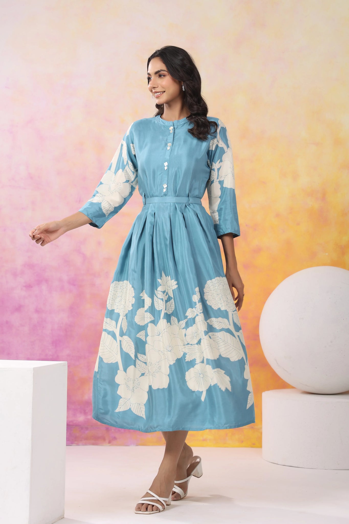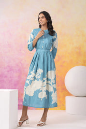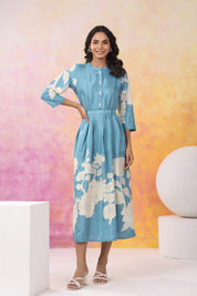 Step into elegance with this stunning aqua blue midi dress, crafted from luxurious Russian silk for a smooth and graceful drape. Featuring a cream-colored bold flower motif, this dress is designed with a classic round neckline, printed3/4th sleeves and  hem for a sophisticated finish. The front is adorned with shell buttons and a tie-back detail, creating a flattering silhouette that combines comfort with style.