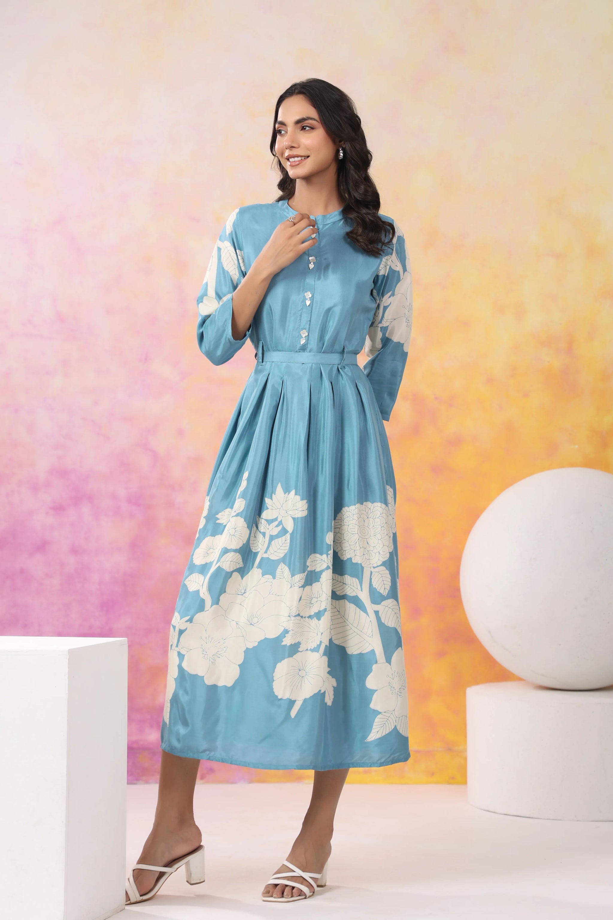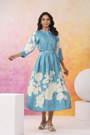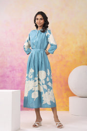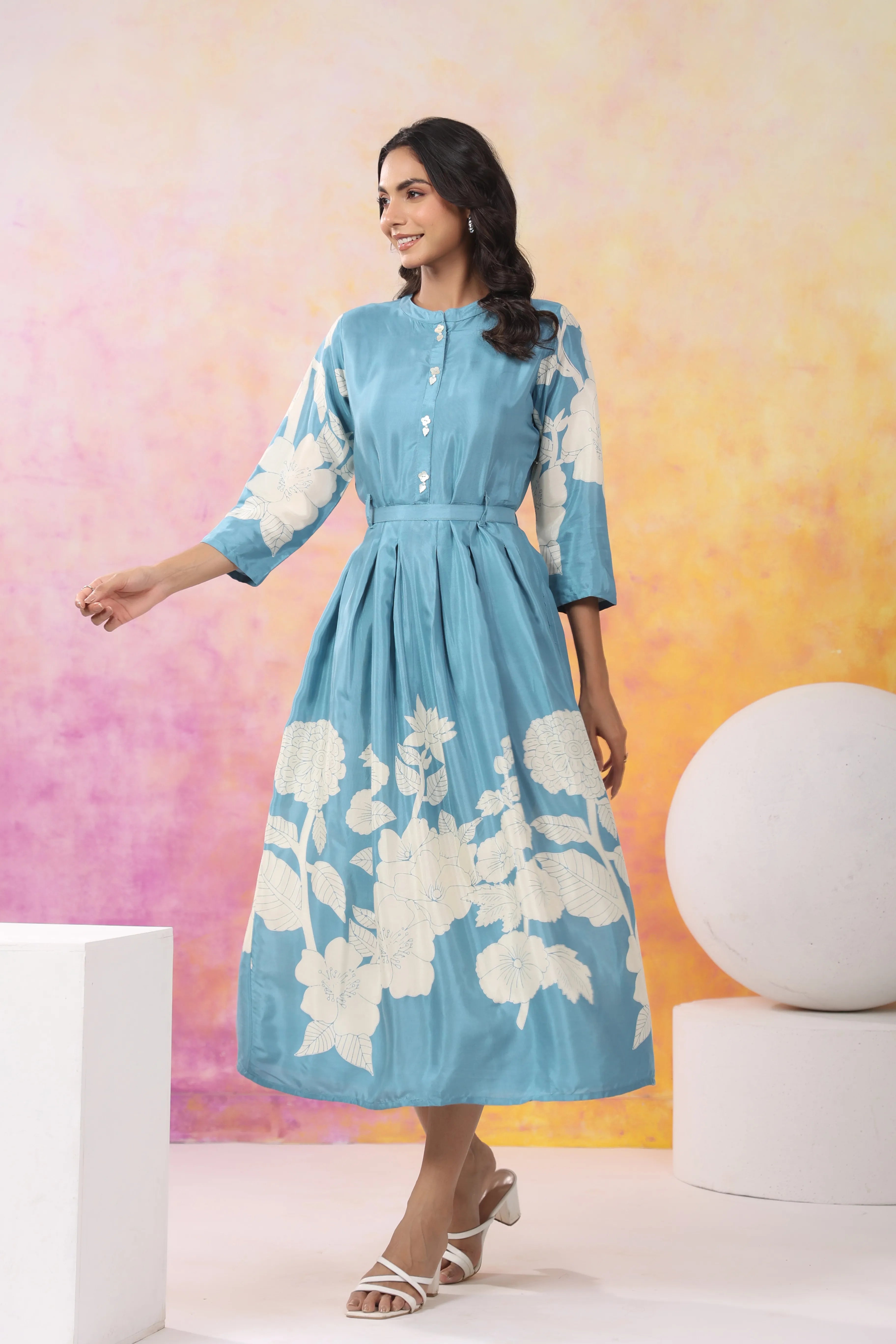 Aqua Blue Base With Cream Color Bold Flower Motif Midi Dress