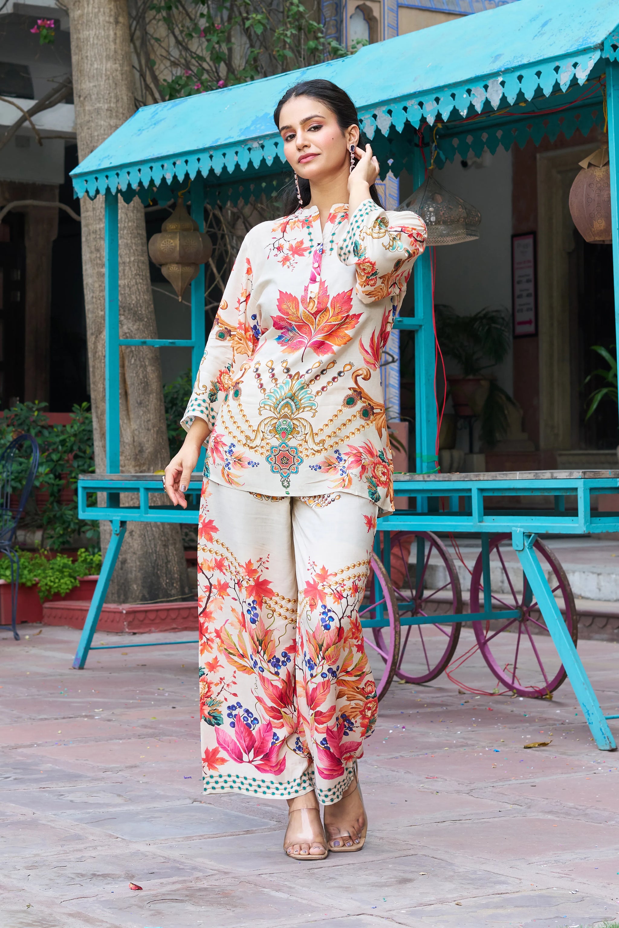 Step into regal grace with the Ornate Bloom co-ord set—crafted in breathable beige muslin and adorned with bold tropical and ornate placement prints. Delicate golden beadwork on the yoke adds shimmer and artistry to the ensemble. The mandarin collar kurti features fabric-covered buttons, elegant 3/4th sleeves, and pairs with matching straight-fit pants designed with an elasticated waist for all-day ease.