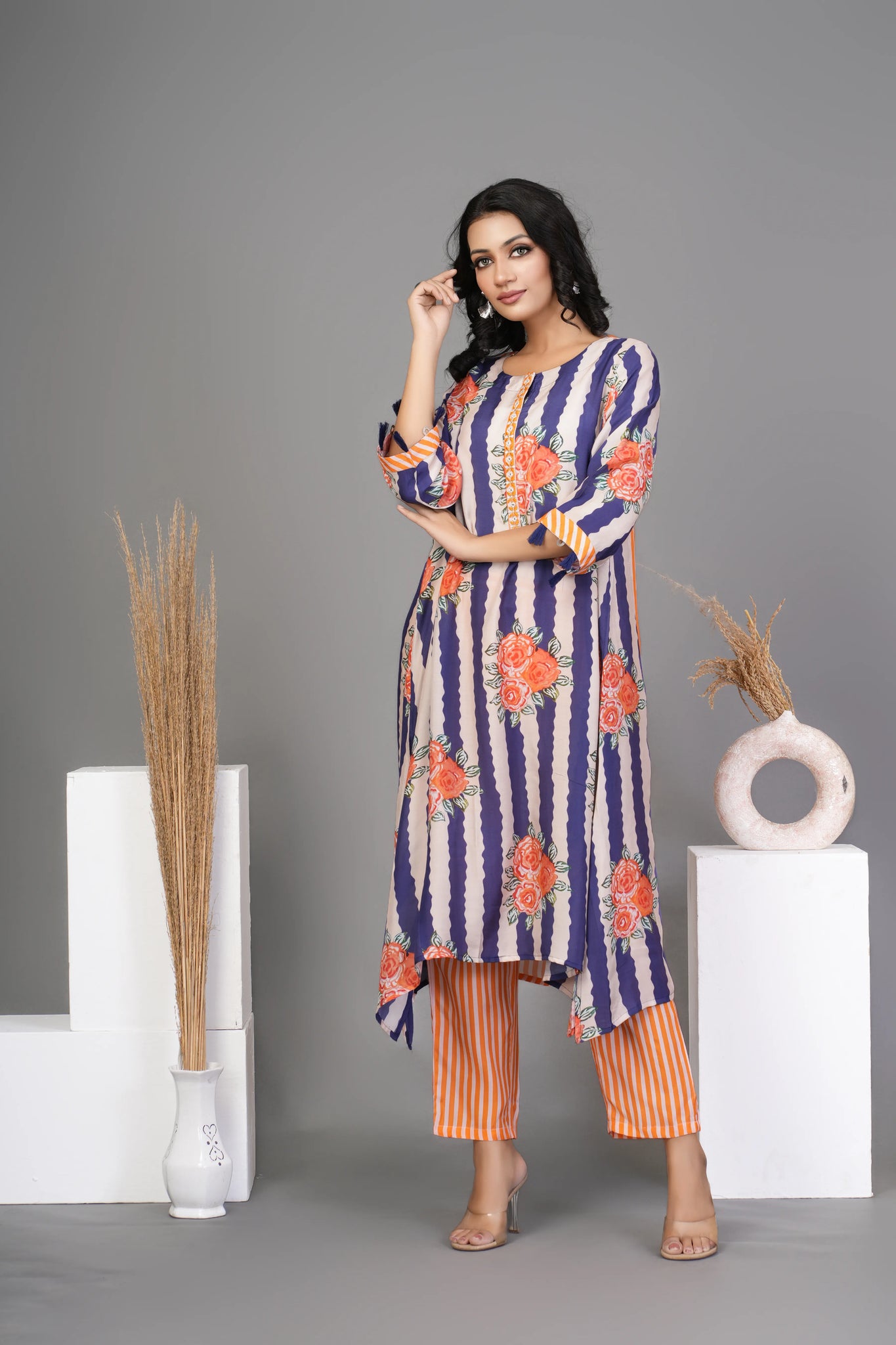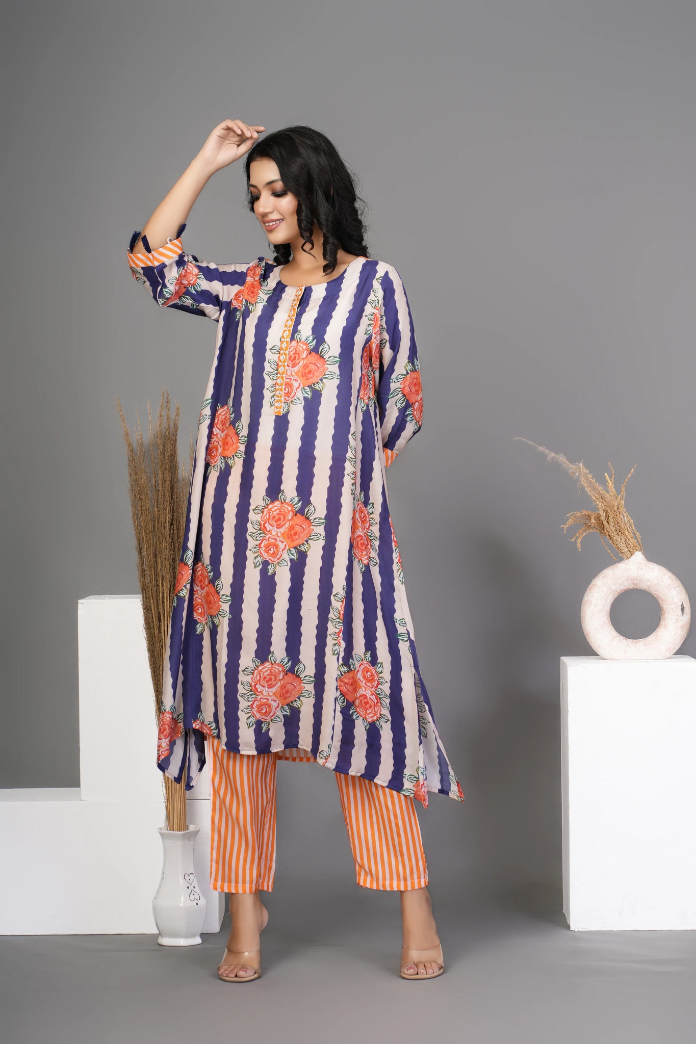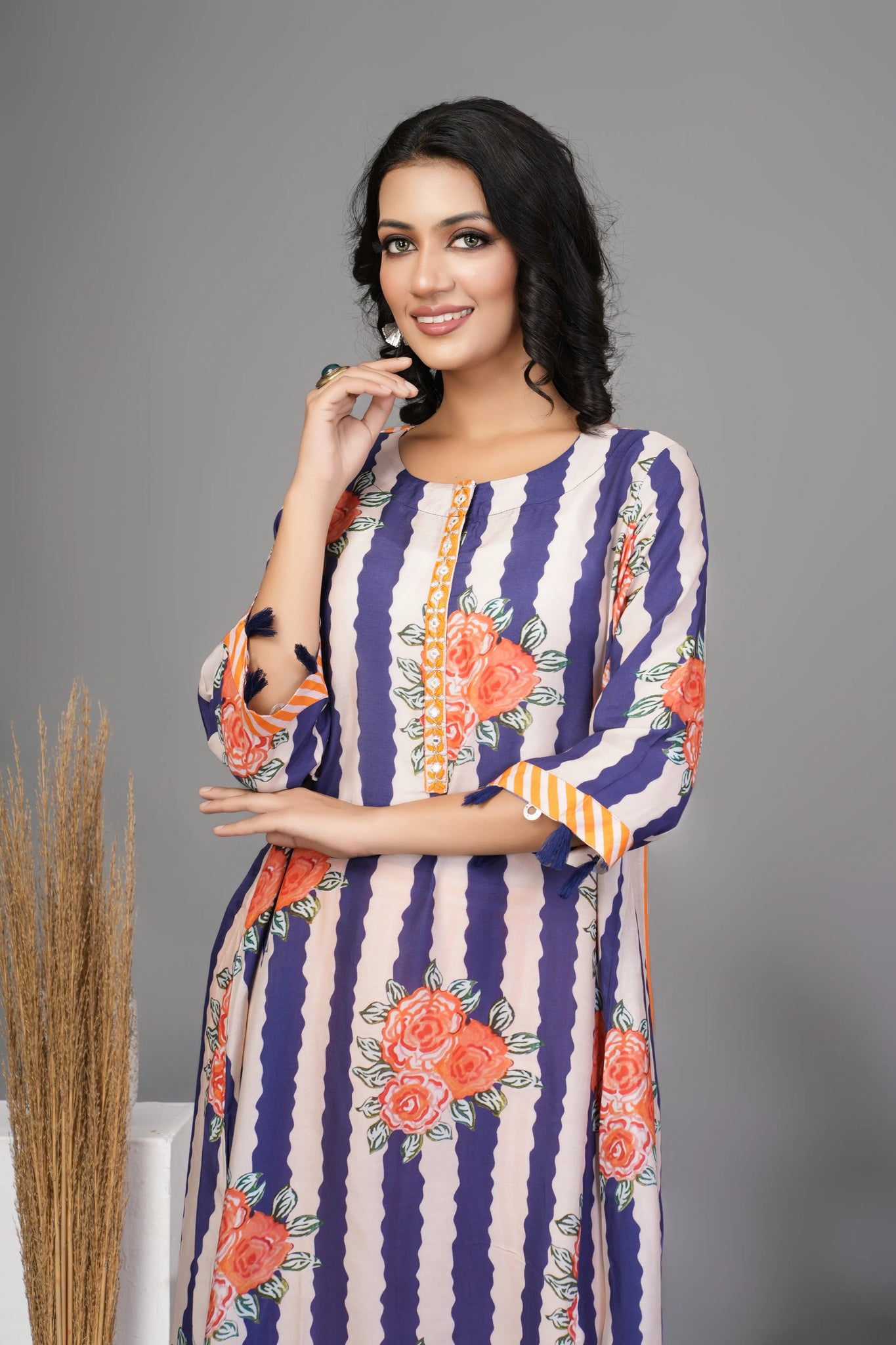 Elevate your ethnic wardrobe with this stunning beige and navy blue kurta set, designed to make a statement. Featuring an A-line silhouette with cream and navy blue stripes, the kurta is adorned with bold floral prints, intricate lace detailing, and a stylish V-neck enhanced with tassels and Moti work. Paired with matching  stripe printed pants, this full sleeve ensemble blends elegance and vibrant design for a standout look.