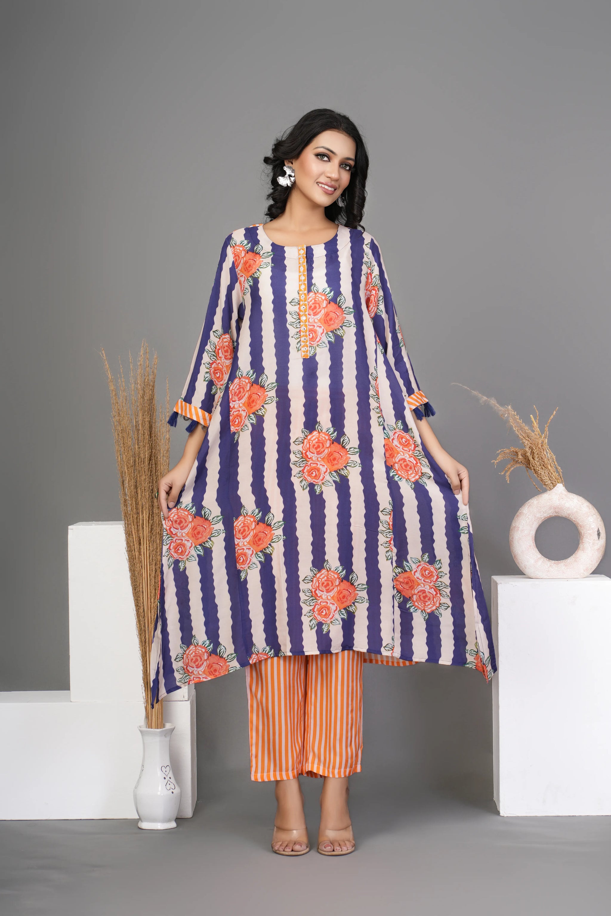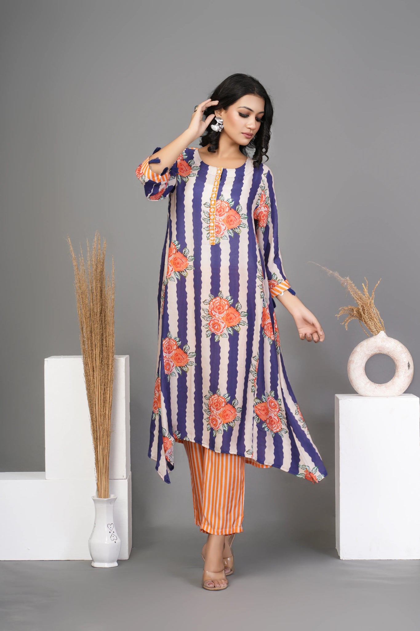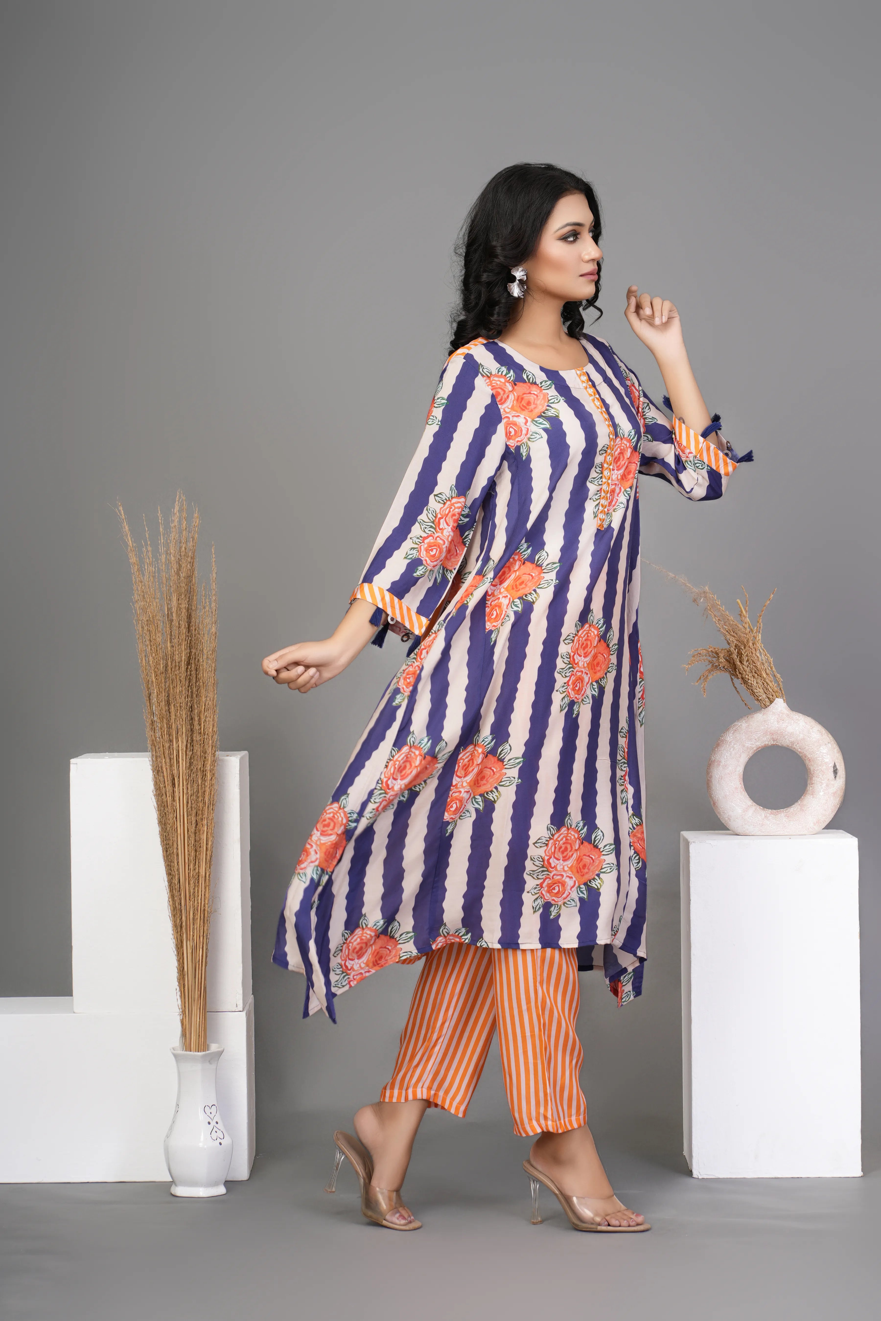 Elevate your ethnic wardrobe with this stunning beige and navy blue kurta set, designed to make a statement. Featuring an A-line silhouette with cream and navy blue stripes, the kurta is adorned with bold floral prints, intricate lace detailing, and a stylish V-neck enhanced with tassels and Moti work. Paired with matching  stripe printed pants, this full sleeve ensemble blends elegance and vibrant design for a standout look.