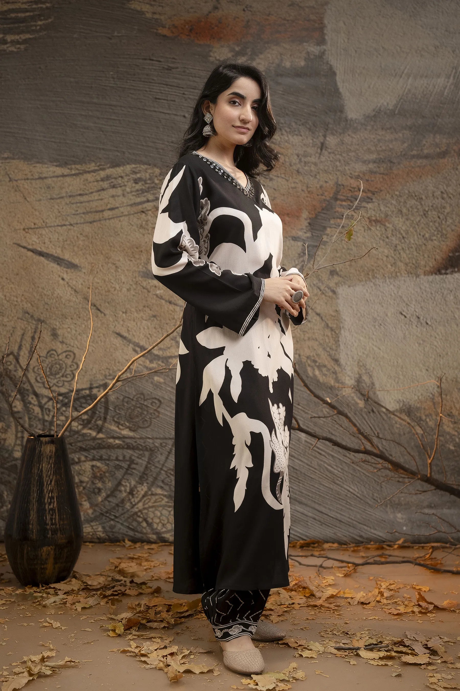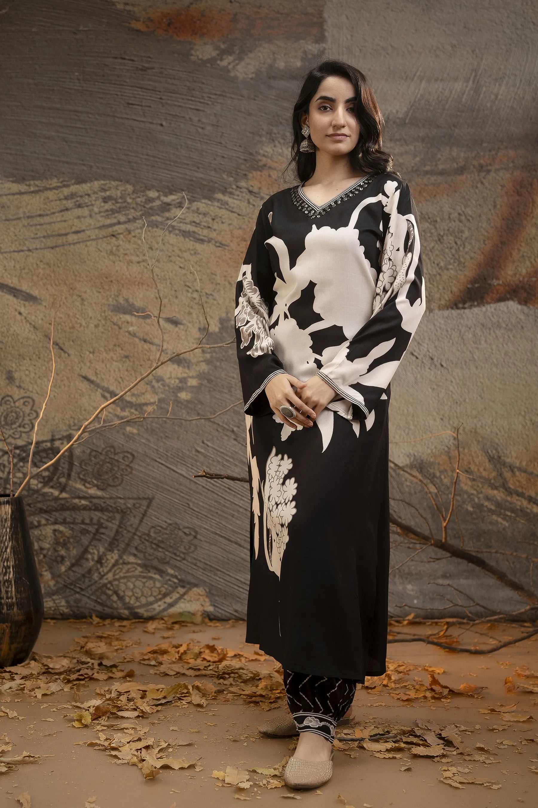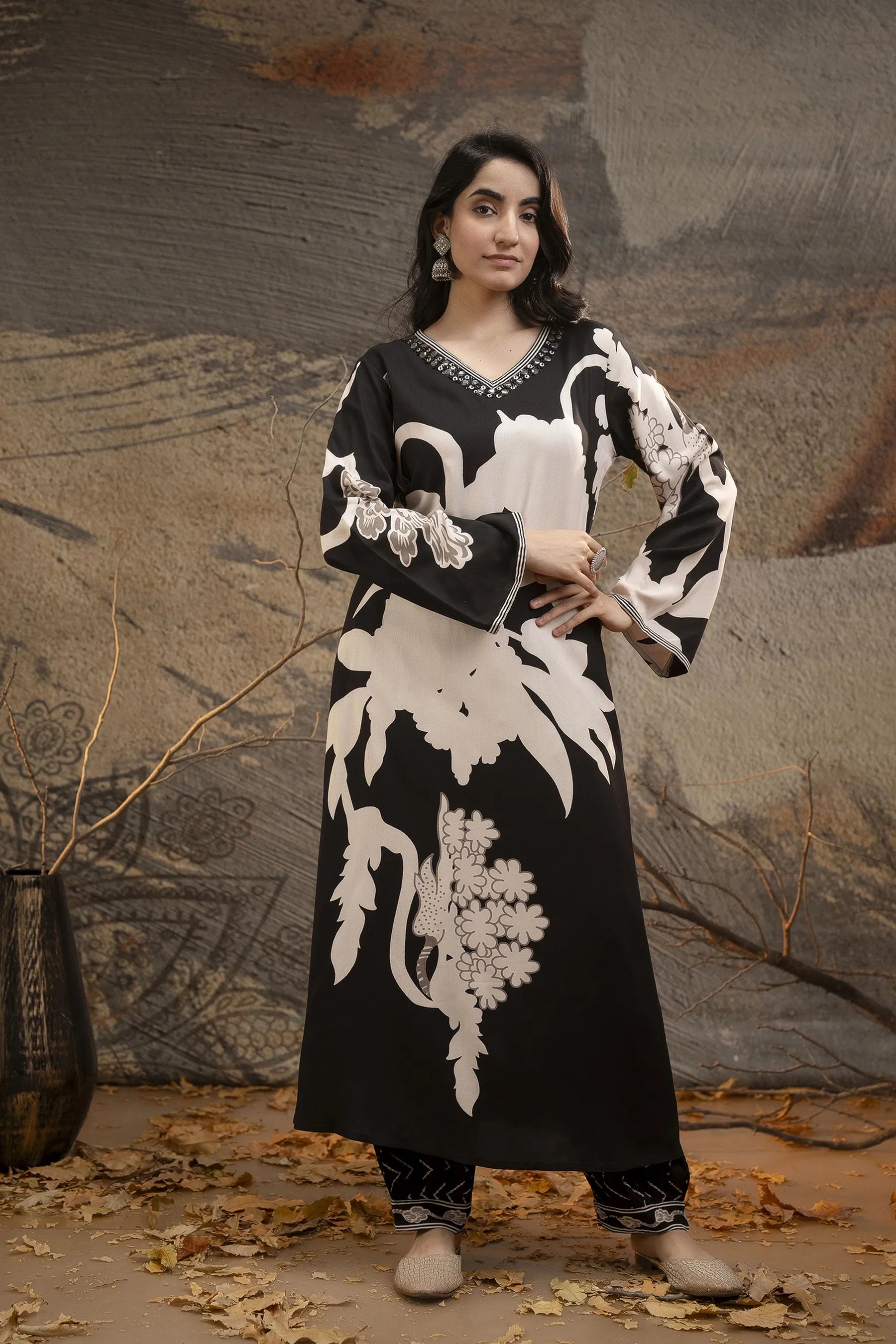 The kurta boasts an embellished V-neckline, a flattering long straight silhouette, and a refined straight hem, exuding effortless charm. Paired with printed salwar-fit trousers that offer a comfortable slip-on closure with a partially elasticated waistband and drawstring, this ensemble ensures ease of movement while maintaining a chic aesthetic.
