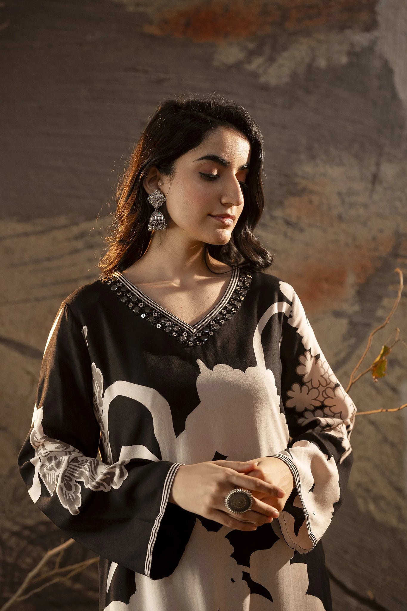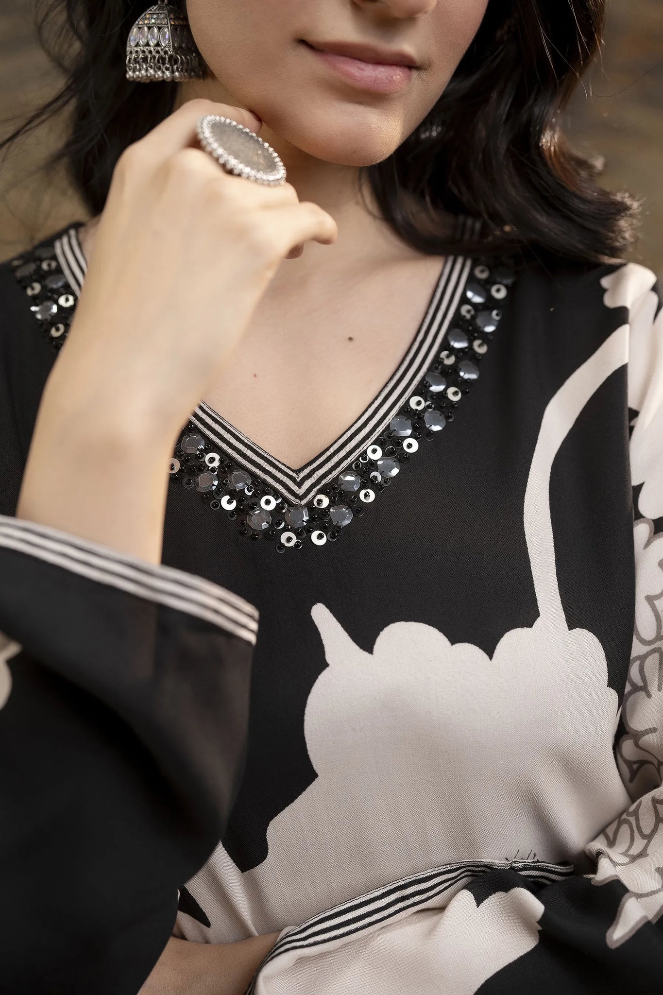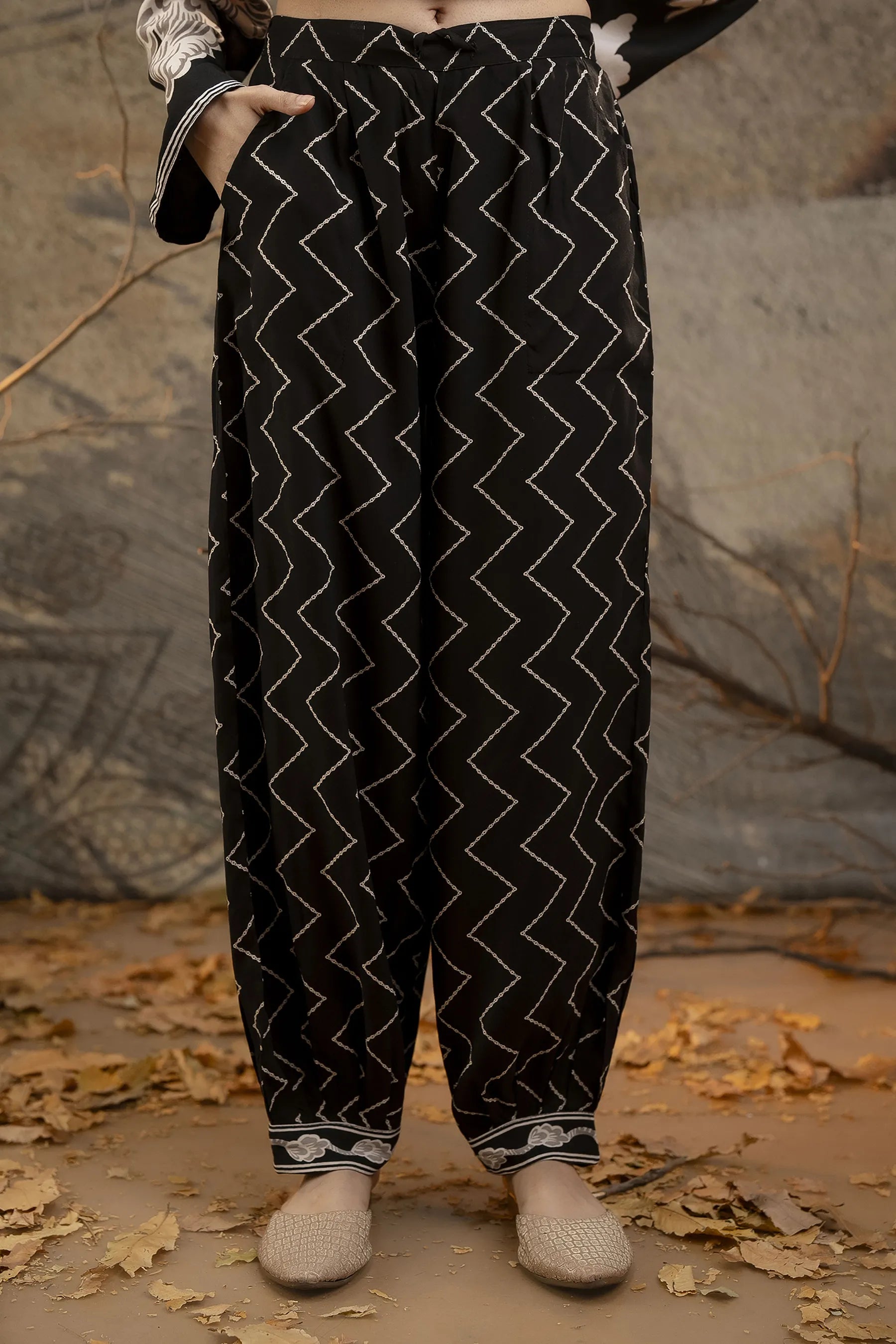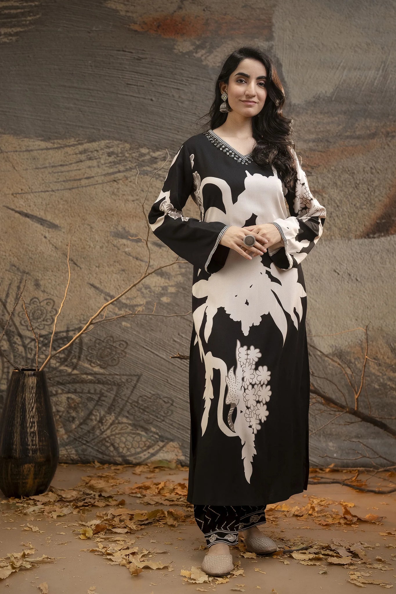 The kurta boasts an embellished V-neckline, a flattering long straight silhouette, and a refined straight hem, exuding effortless charm. Paired with printed salwar-fit trousers that offer a comfortable slip-on closure with a partially elasticated waistband and drawstring, this ensemble ensures ease of movement while maintaining a chic aesthetic.