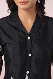 This Black Bold Palm Russian Silk Print Co-Ord Set offers the perfect fusion of tropical elegance and luxurious comfort. Ideal for both casual outings and semi-formal events.