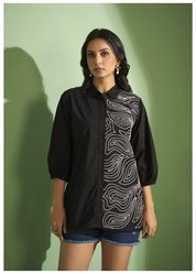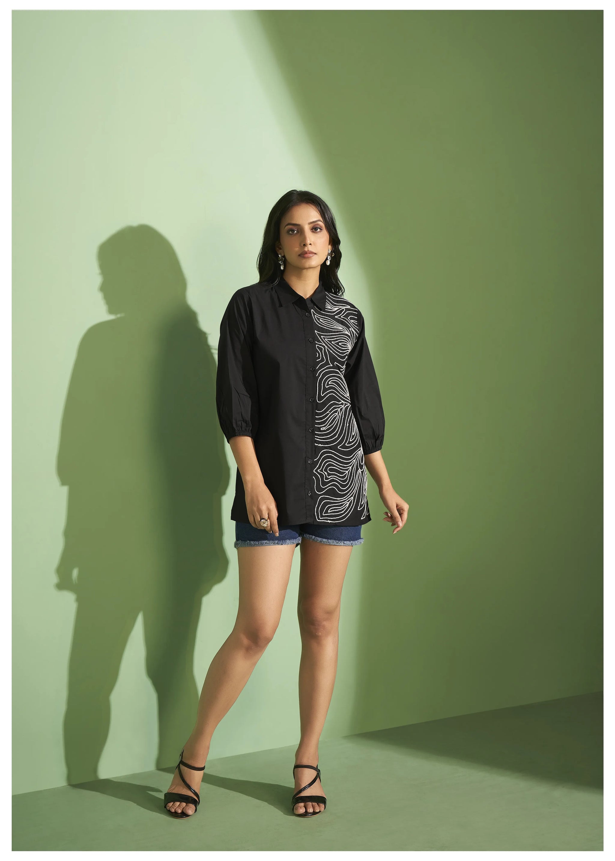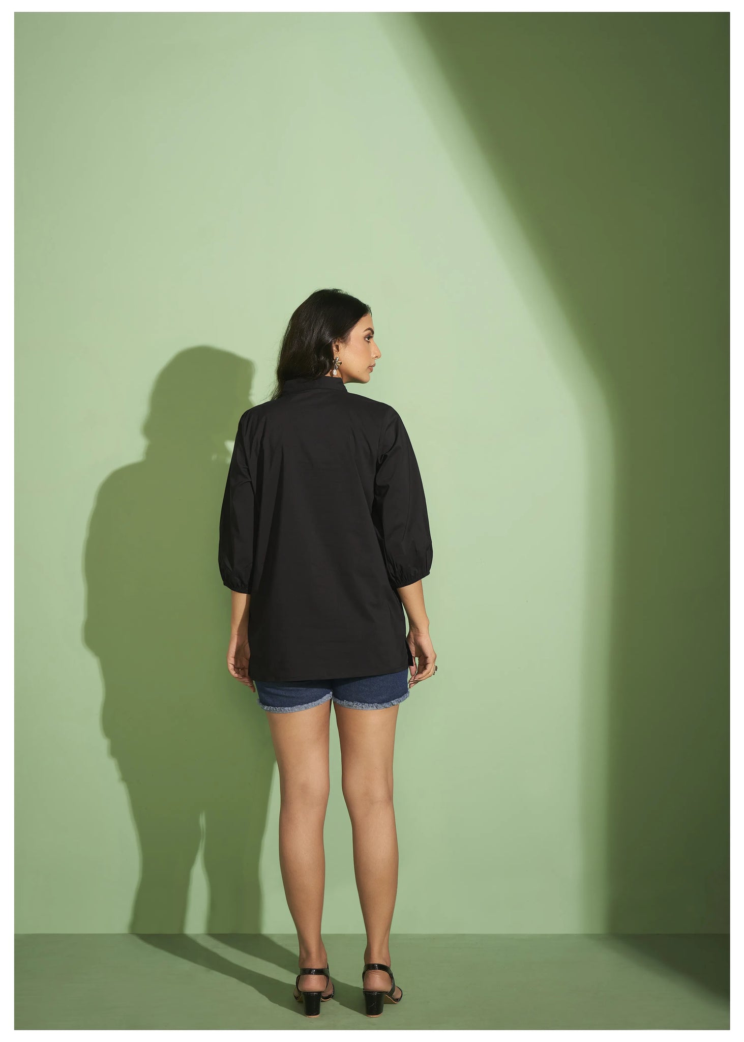 Elevate your everyday wardrobe with this black cotton poplin shirt, beautifully adorned with intricate cord embroidery. The classic shirt collar and 3/4th elasticized sleeves offer a flattering and comfortable fit, while the detailed embroidery adds a sophisticated touch of artistry.