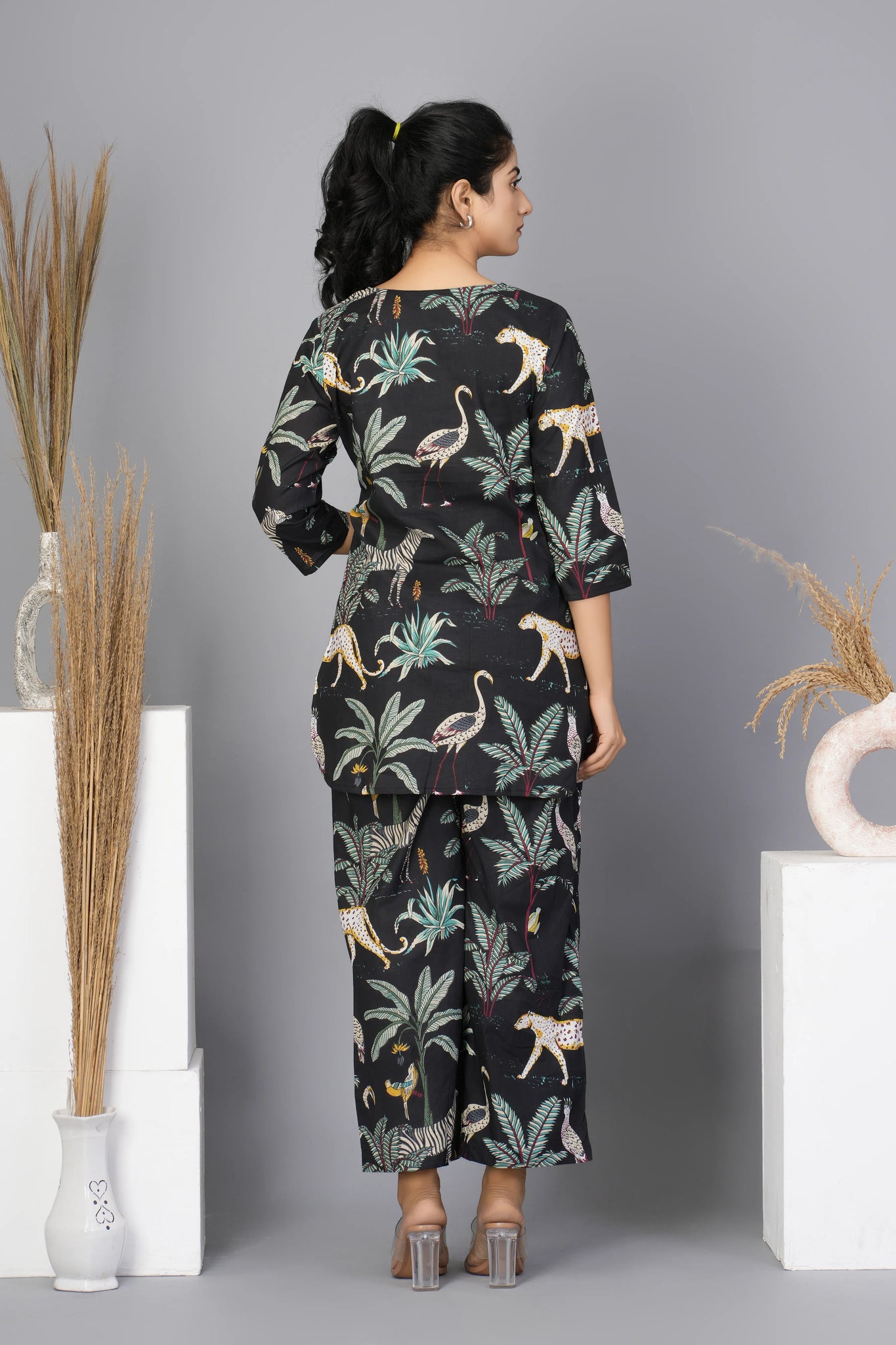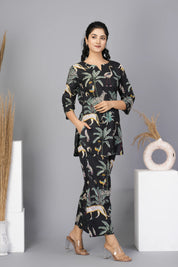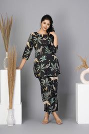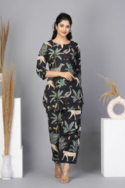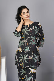 Black Floral Printed Cotton Short Kurta Set