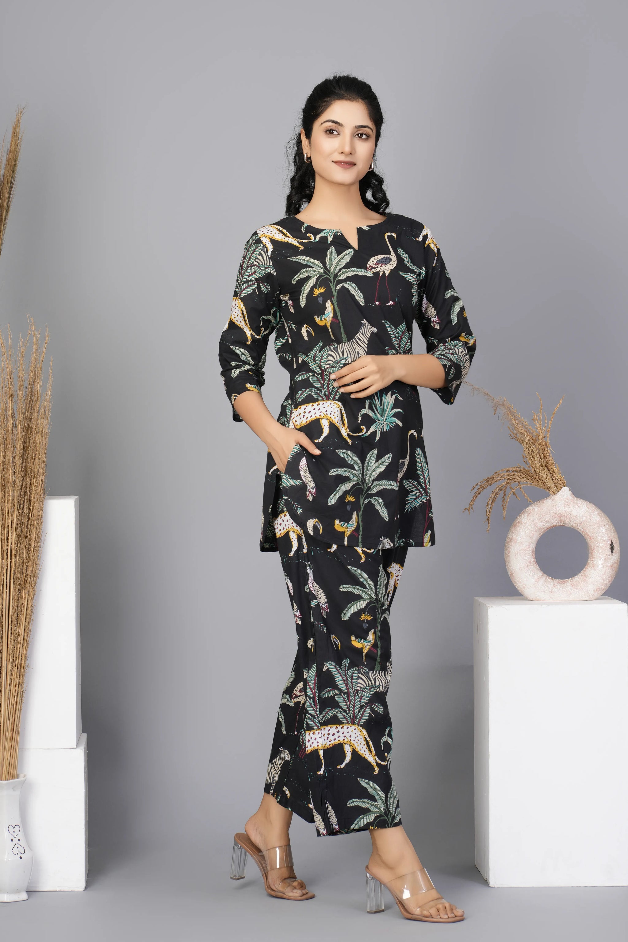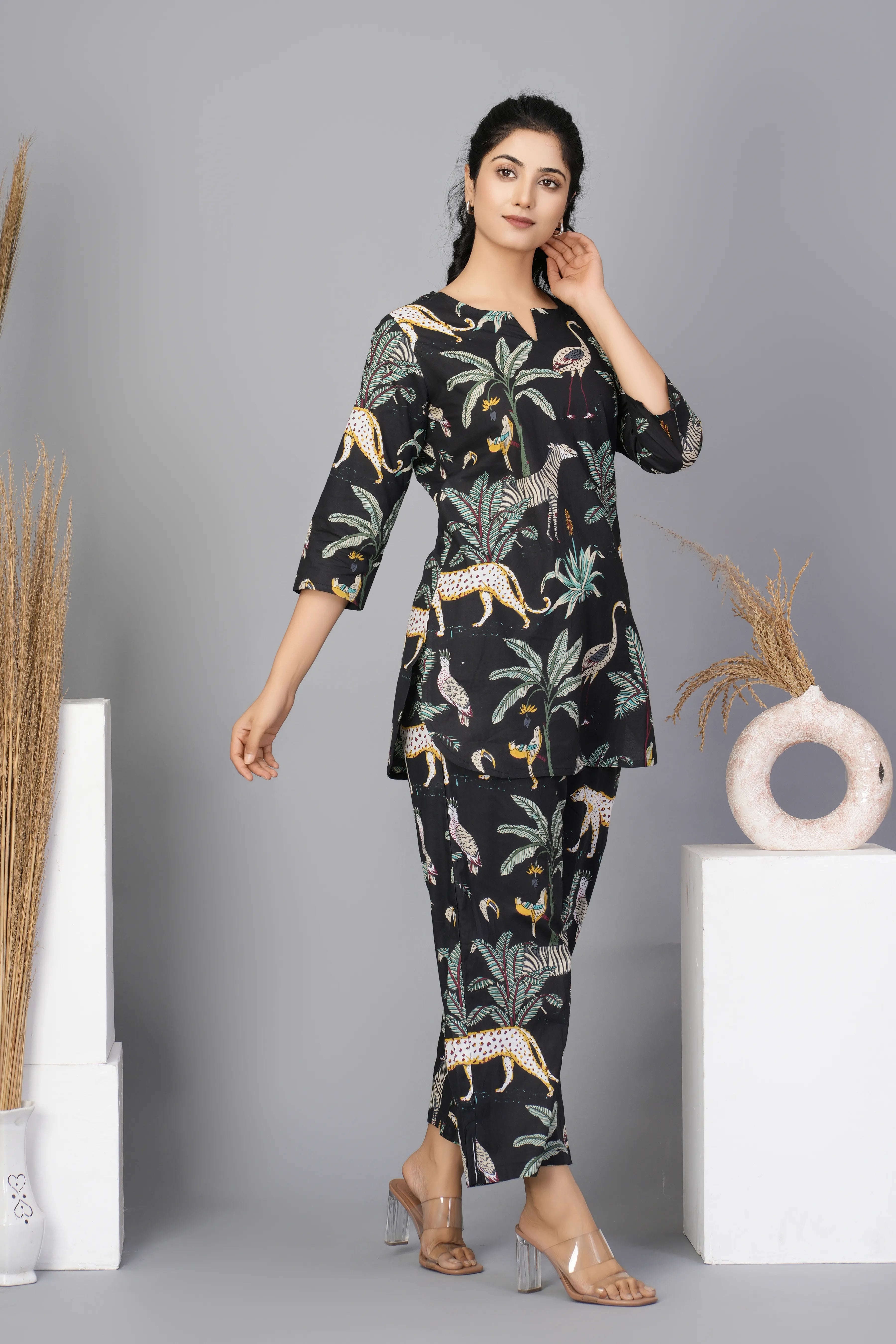 This Black Floral Printed Cotton Short Kurta Set features a chic black base with intricate floral prints, adding a touch of elegance to your wardrobe. Designed with 3/4 sleeves, the kurta offers a relaxed yet stylish fit. Made from breathable cotton fabric, it’s an ideal choice for warm weather and casual occasions.