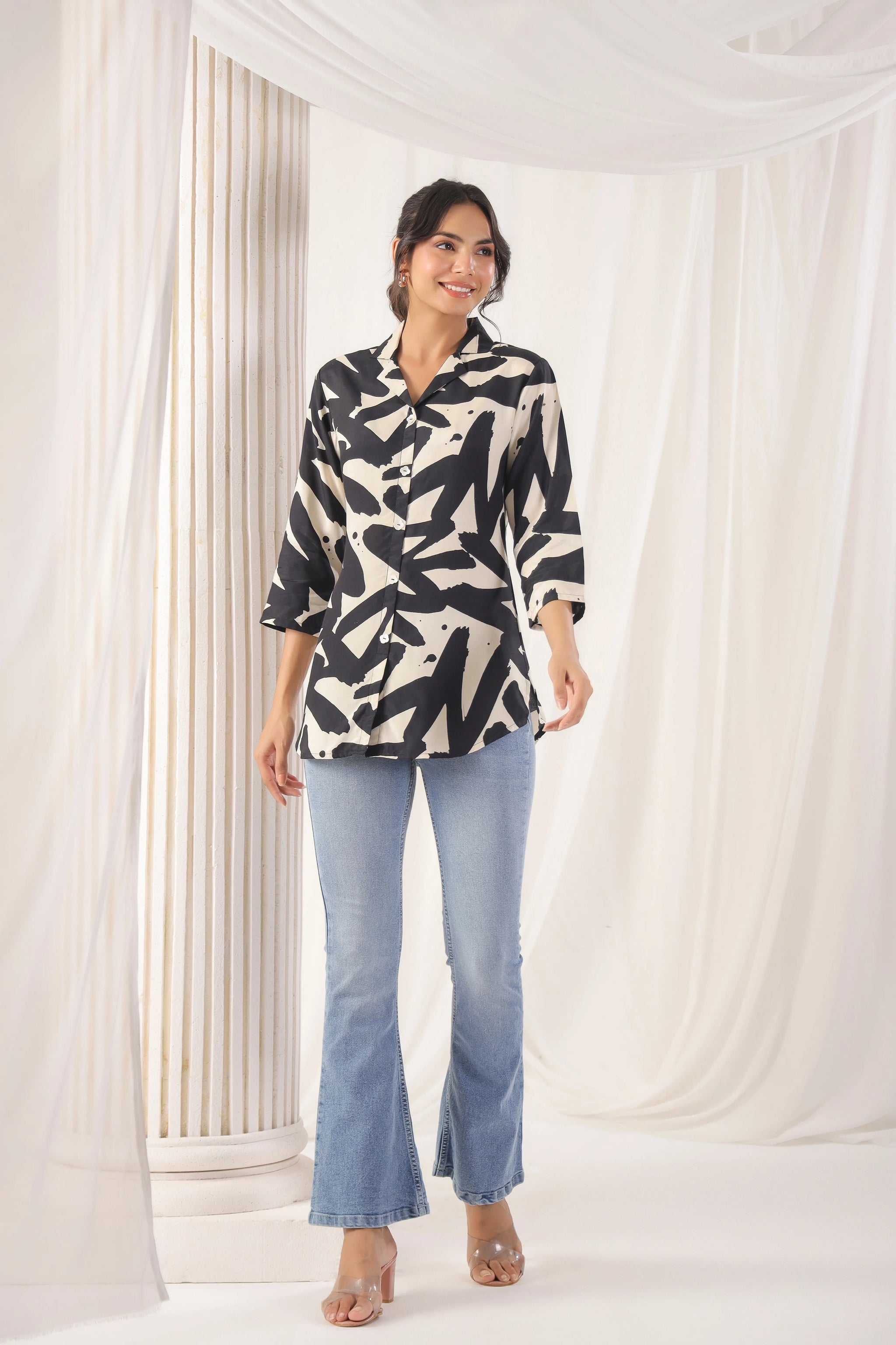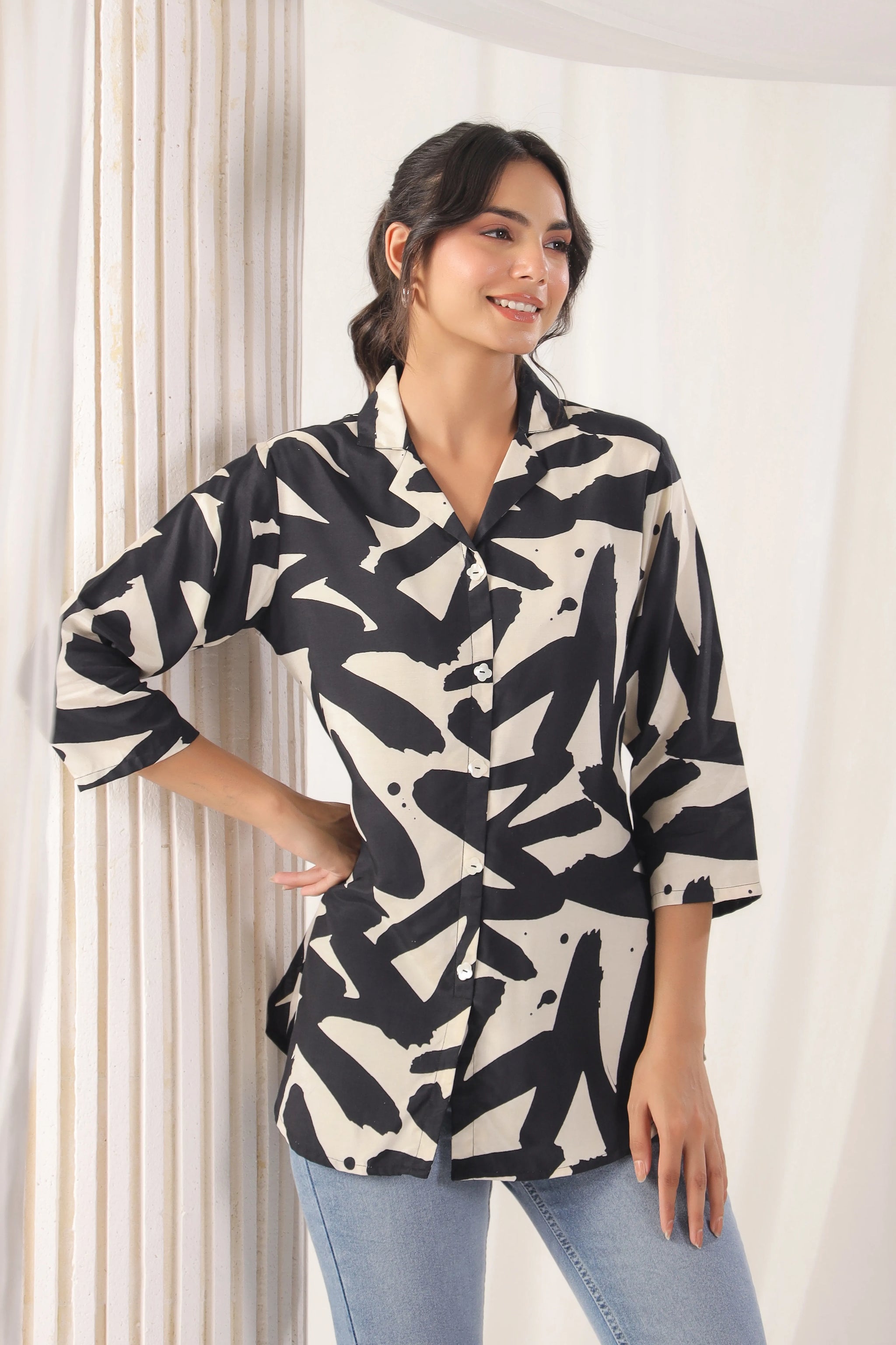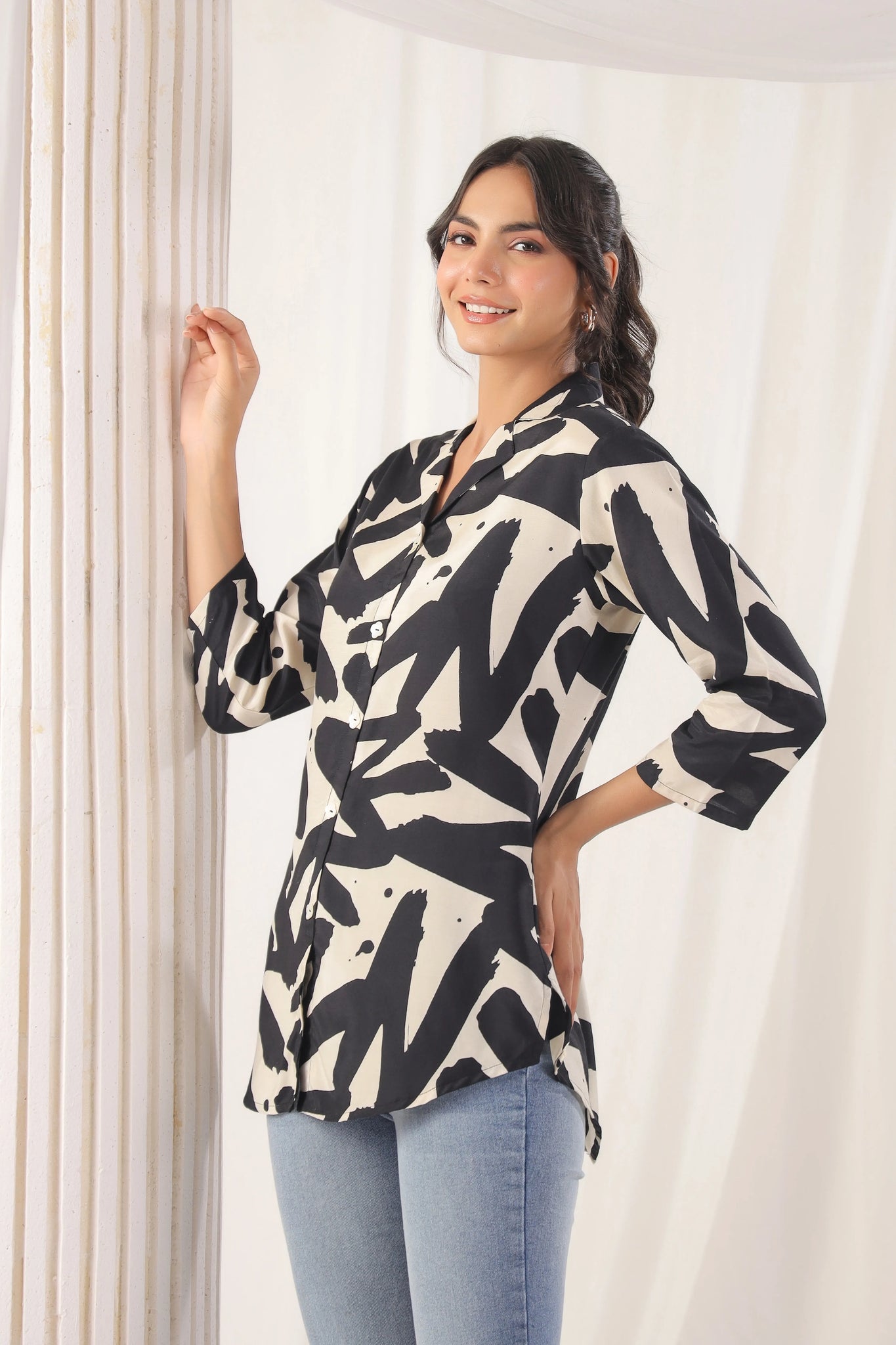 Make a statement with this elegant black and cream abstract floral top, crafted from premium Russian silk for a luxurious and comfortable fit. Featuring a stylish notch collar, shell buttons, and 3/4th sleeves, this top blends classic design with modern sophistication. The eye catching print and tailored silhouette make it perfect for casual outings or chic daywear.