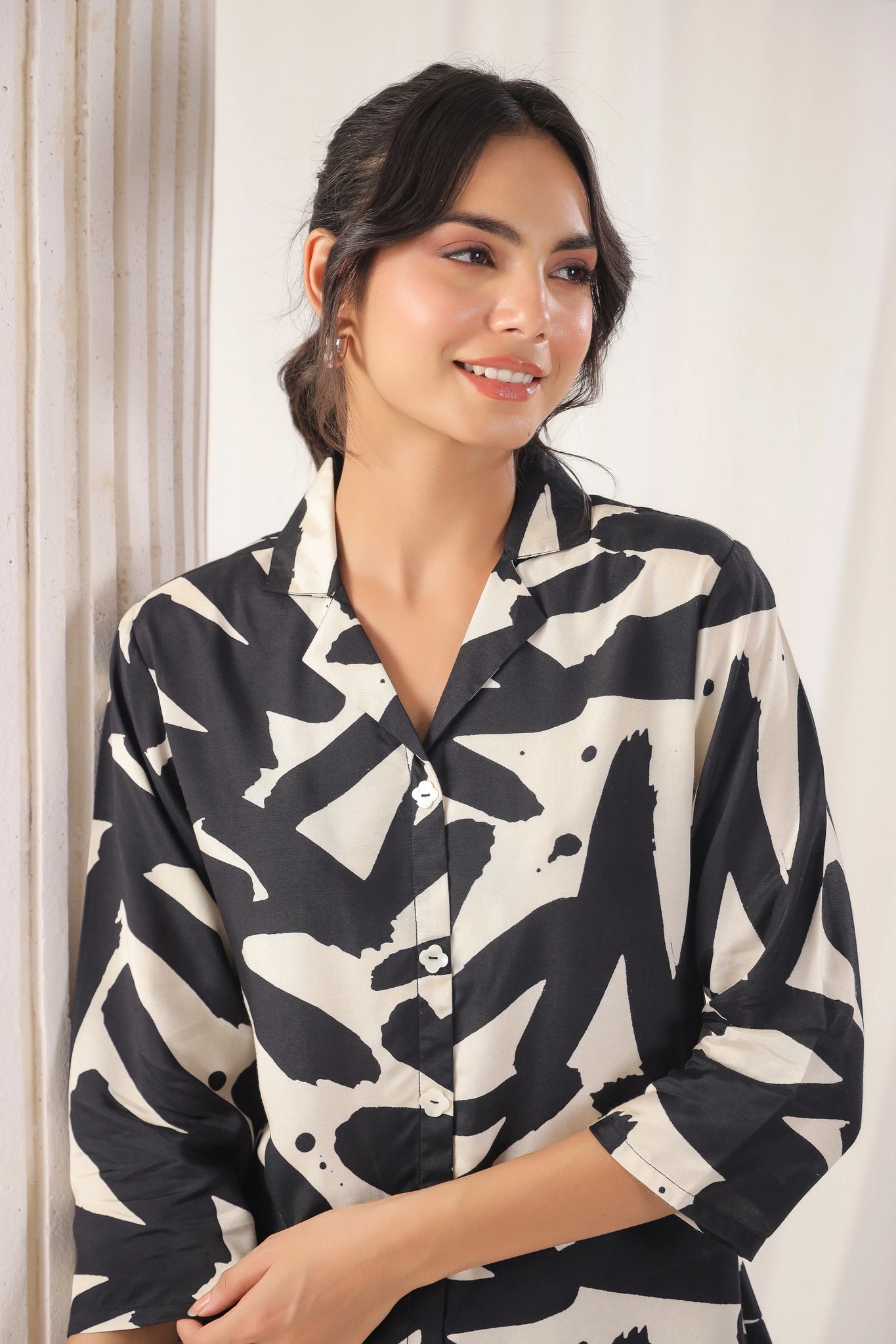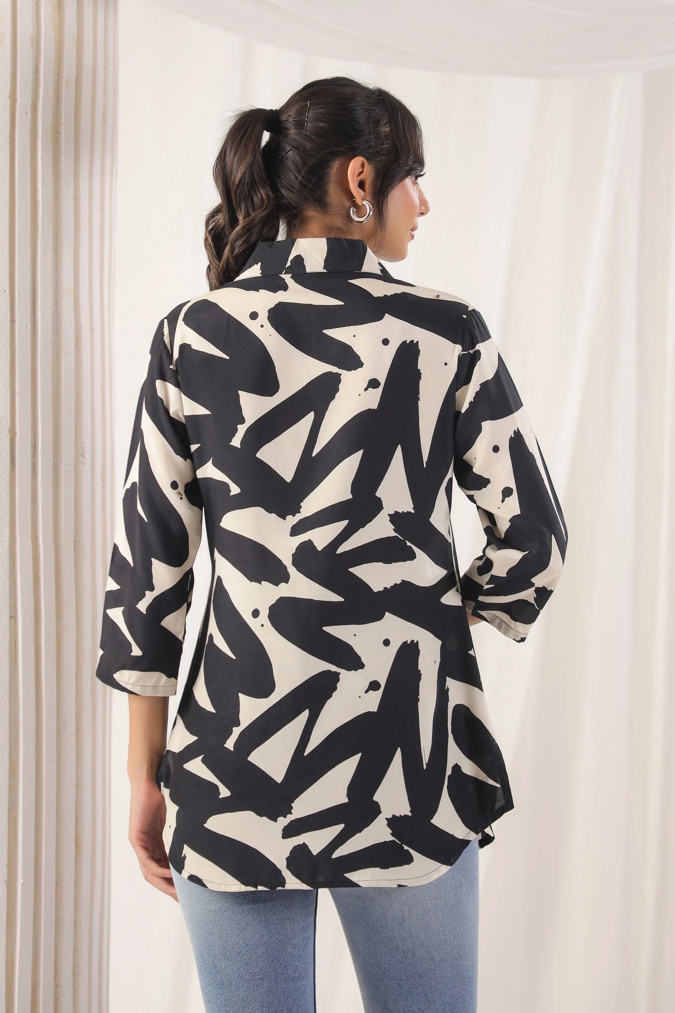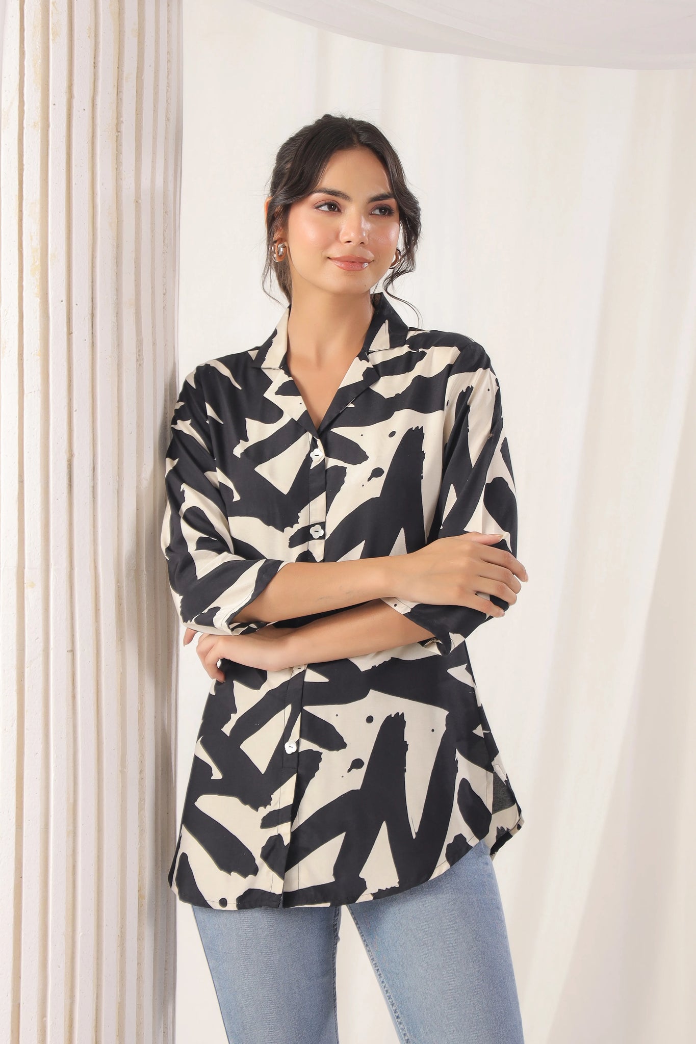 Make a statement with this elegant black and cream abstract floral top, crafted from premium Russian silk for a luxurious and comfortable fit. Featuring a stylish notch collar, shell buttons, and 3/4th sleeves, this top blends classic design with modern sophistication. The eye catching print and tailored silhouette make it perfect for casual outings or chic daywear.