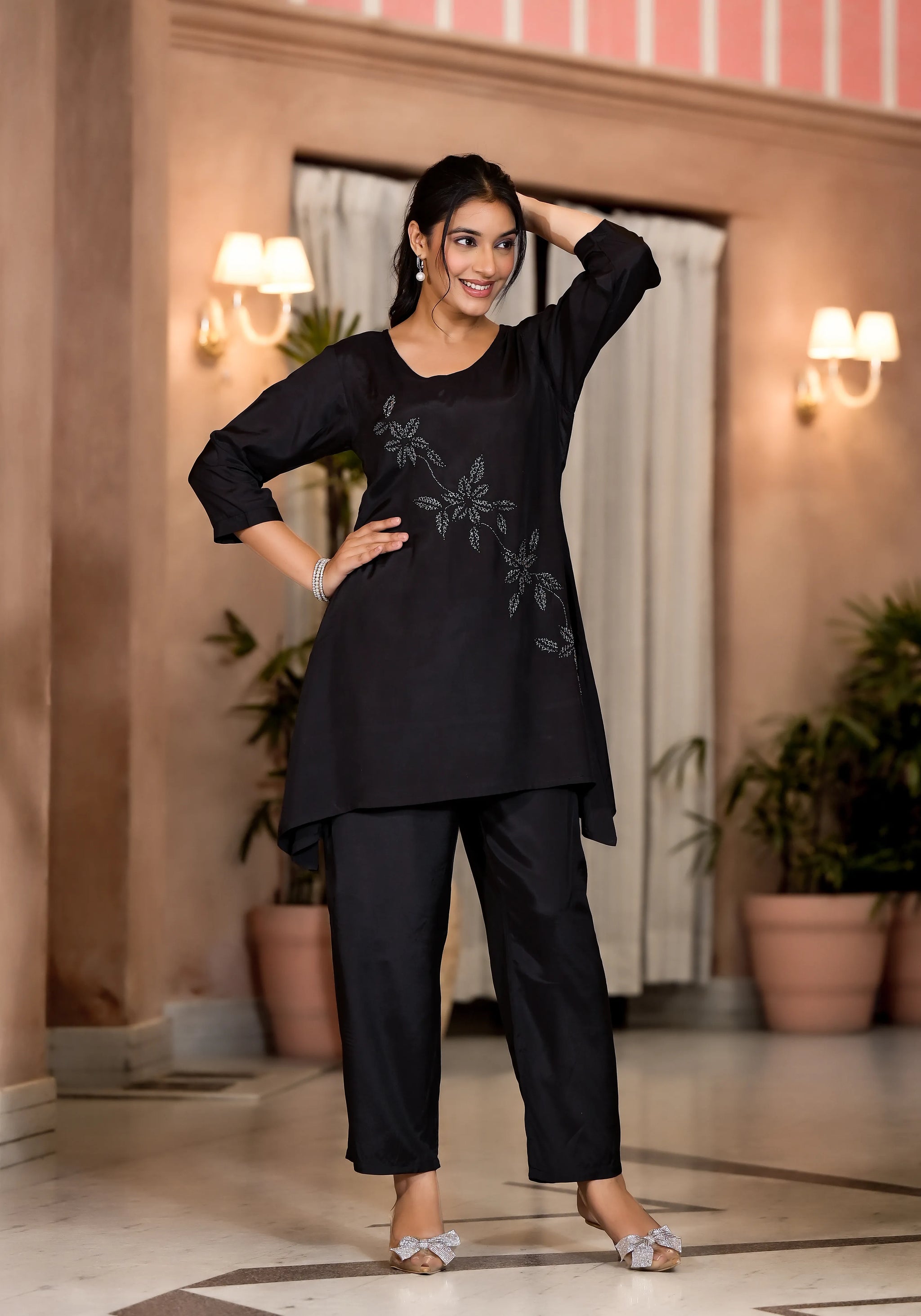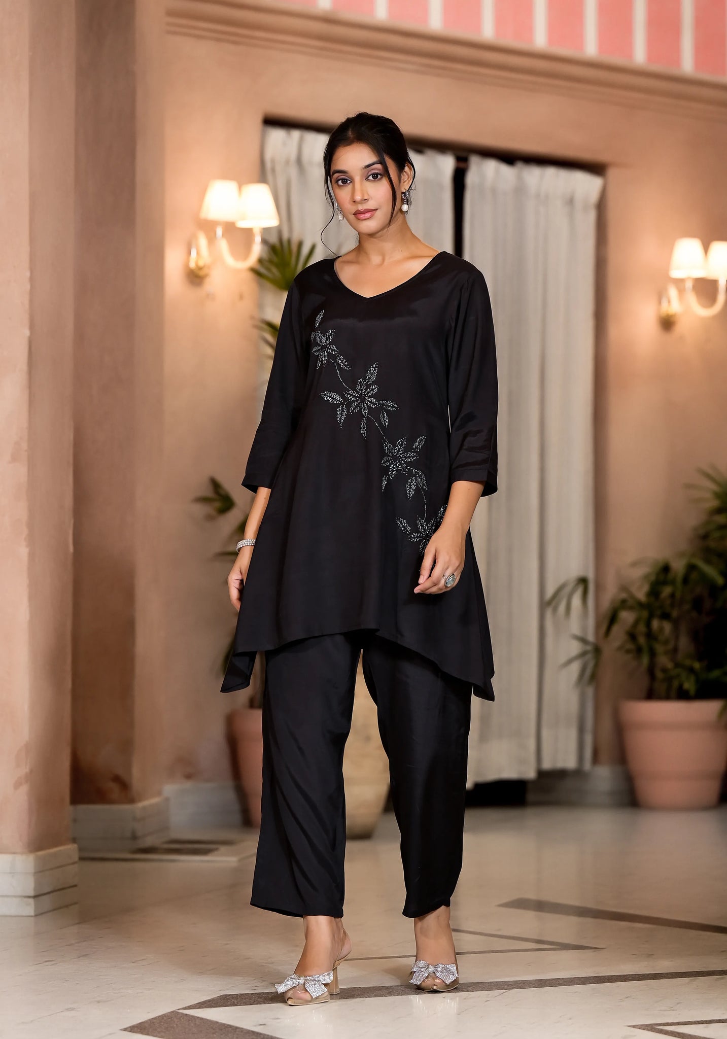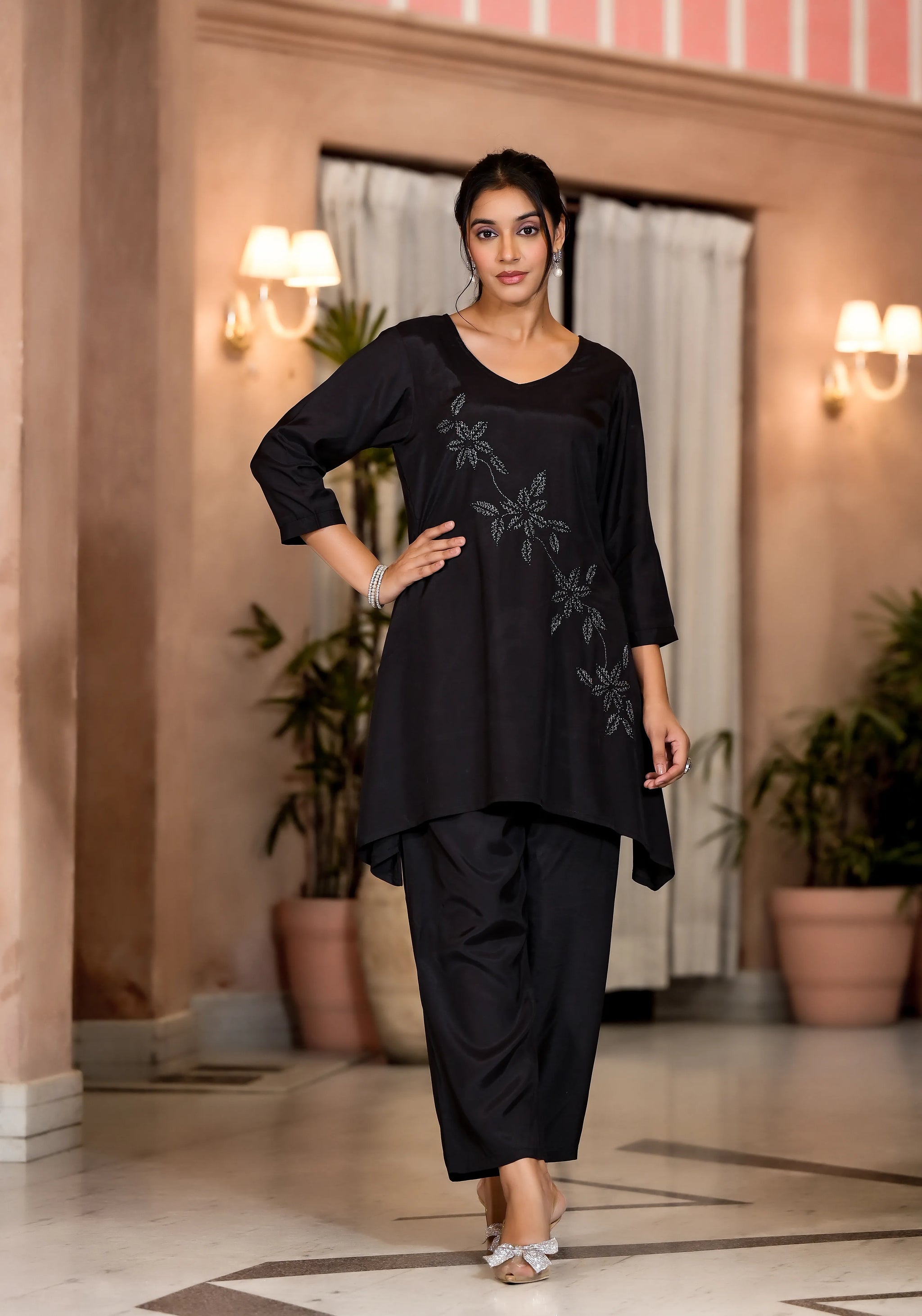 Elevate your wardrobe with this stunning co-ord set crafted from luxurious viscose silk. Featuring bold floral motifs and intricate diagonal bell handwork, this ensemble offers a unique blend of elegance and style. The round neck and 3/4th sleeves provide a chic, comfortable fit, perfect for any occasion.