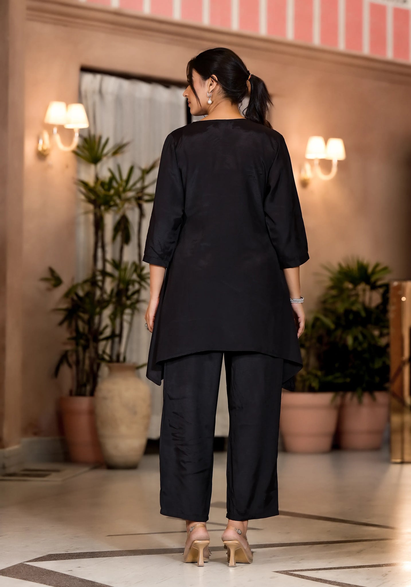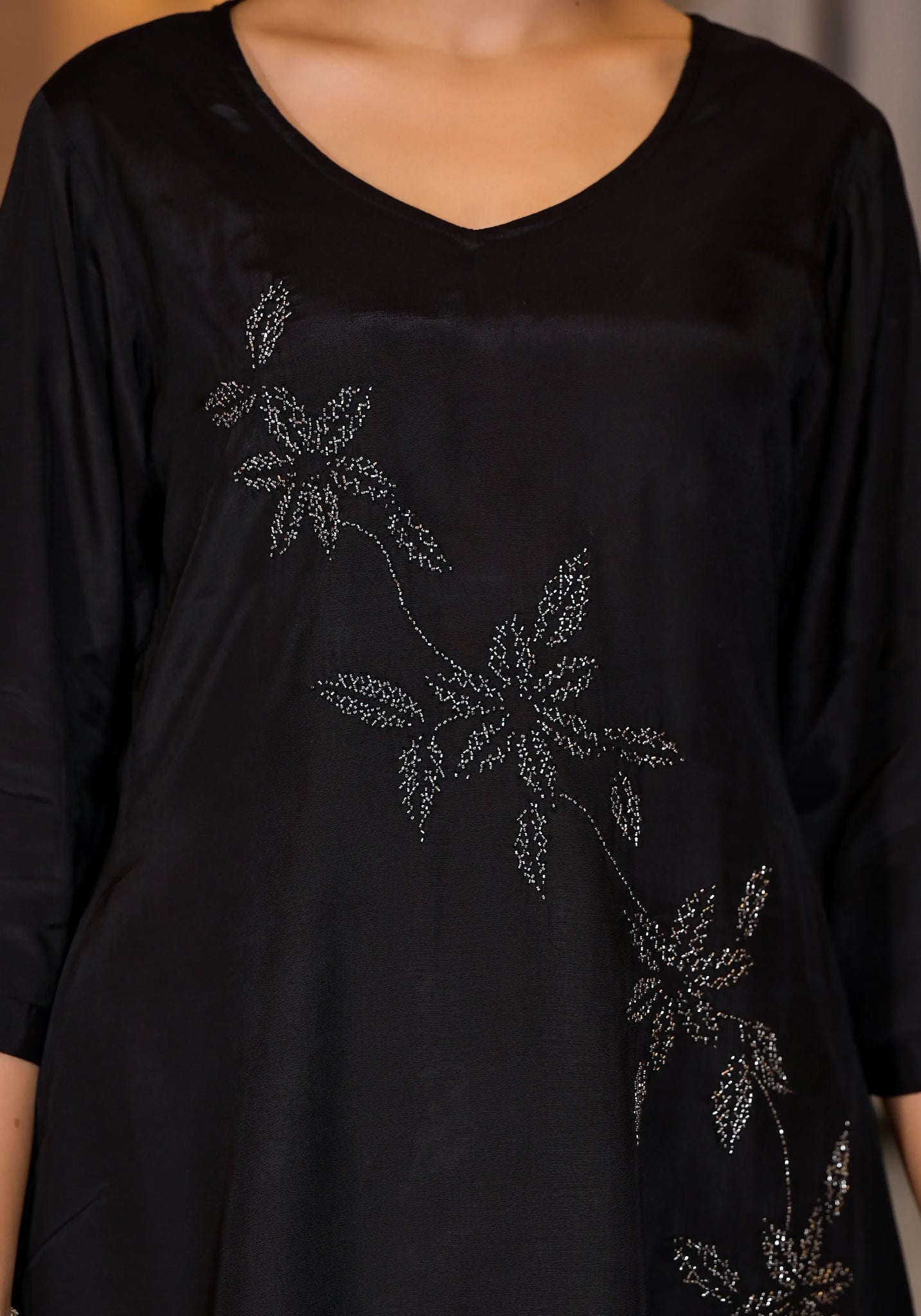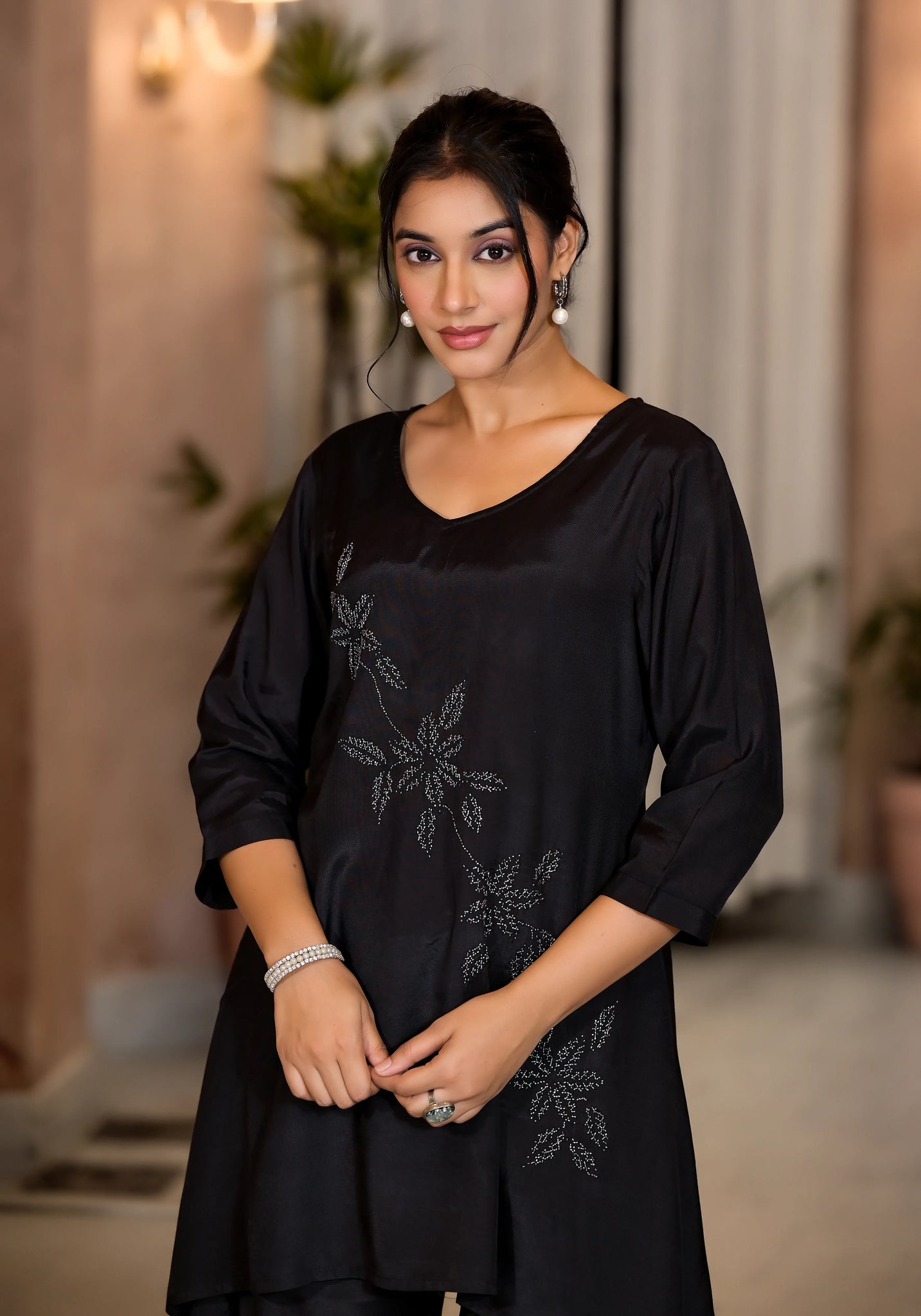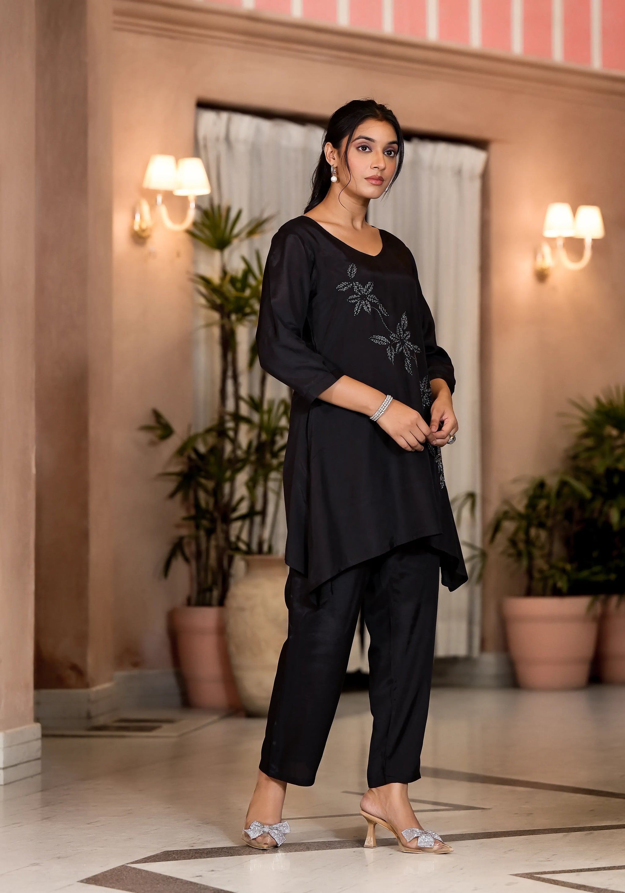 Elevate your wardrobe with this stunning co-ord set crafted from luxurious viscose silk. Featuring bold floral motifs and intricate diagonal bell handwork, this ensemble offers a unique blend of elegance and style. The round neck and 3/4th sleeves provide a chic, comfortable fit, perfect for any occasion.