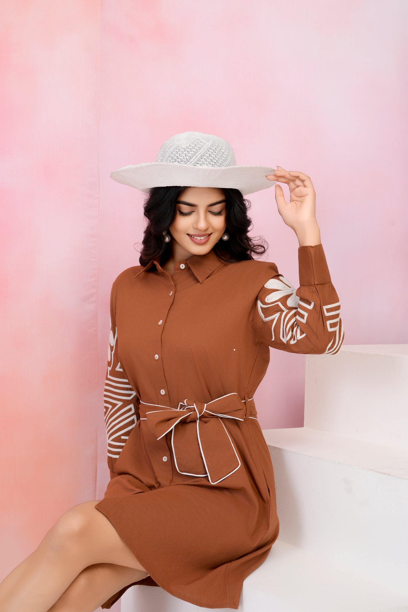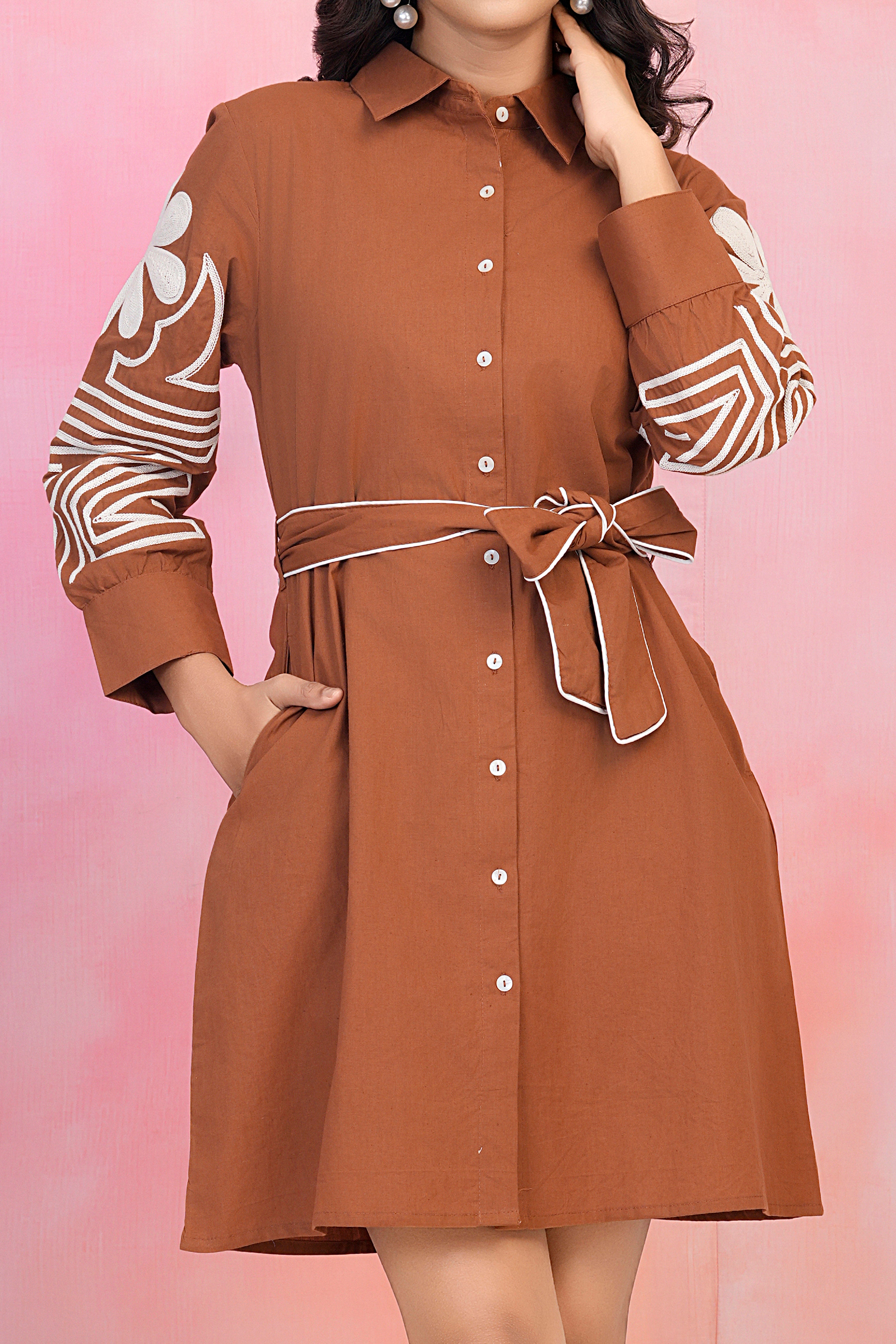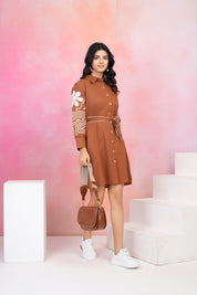 Step into effortless elegance with the Brown Thread-Embroidered Mini Dress, a perfect fusion of sophistication and comfort. Made from breathable cotton poplin, this dress is designed for all-day ease while exuding a refined aesthetic. The delicate threadwork embroidery adds a handcrafted touch, while the full sleeves and button-front design enhance its classic appeal. The adjustable belt cinches the waist, ensuring a flattering and structured fit.