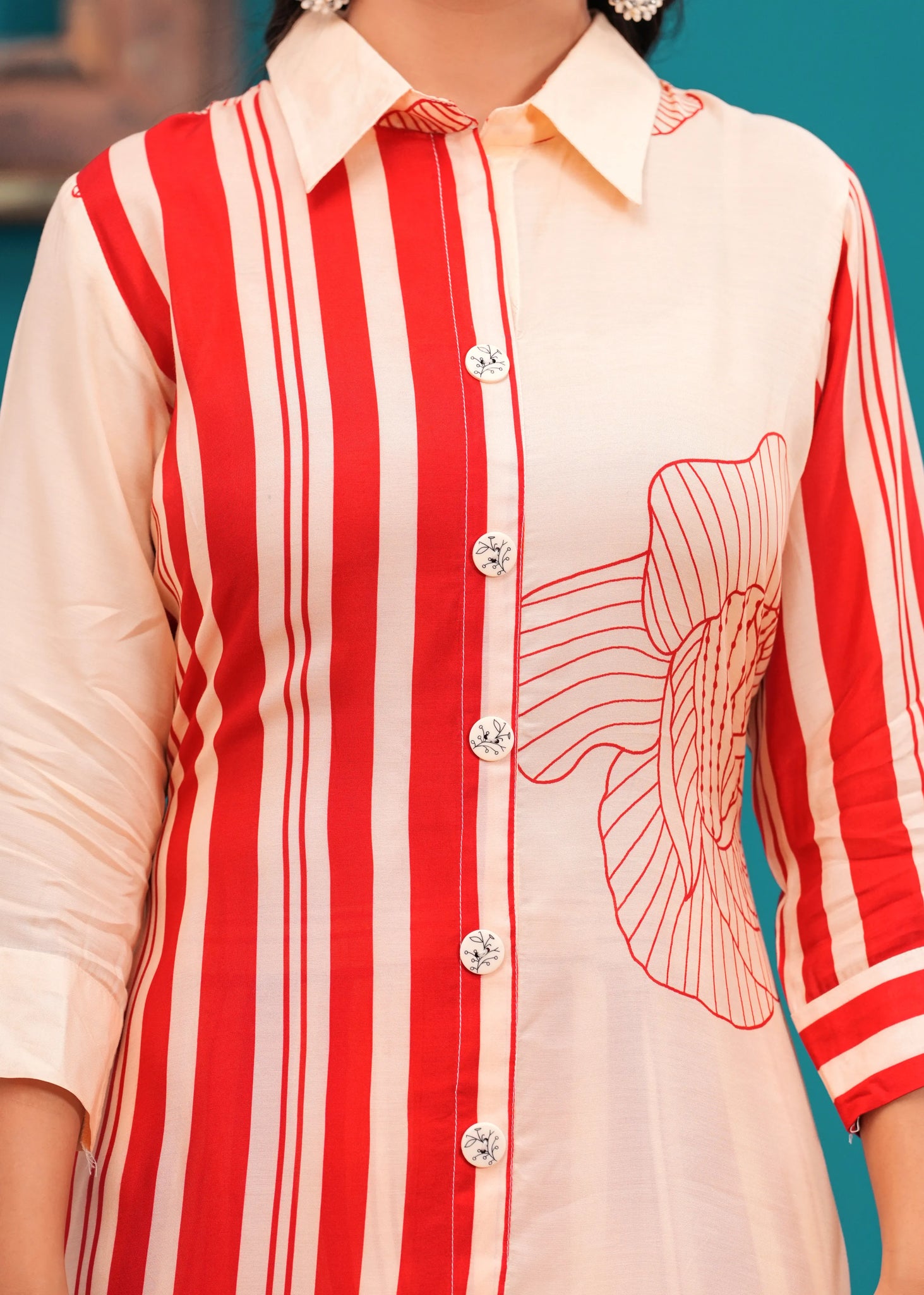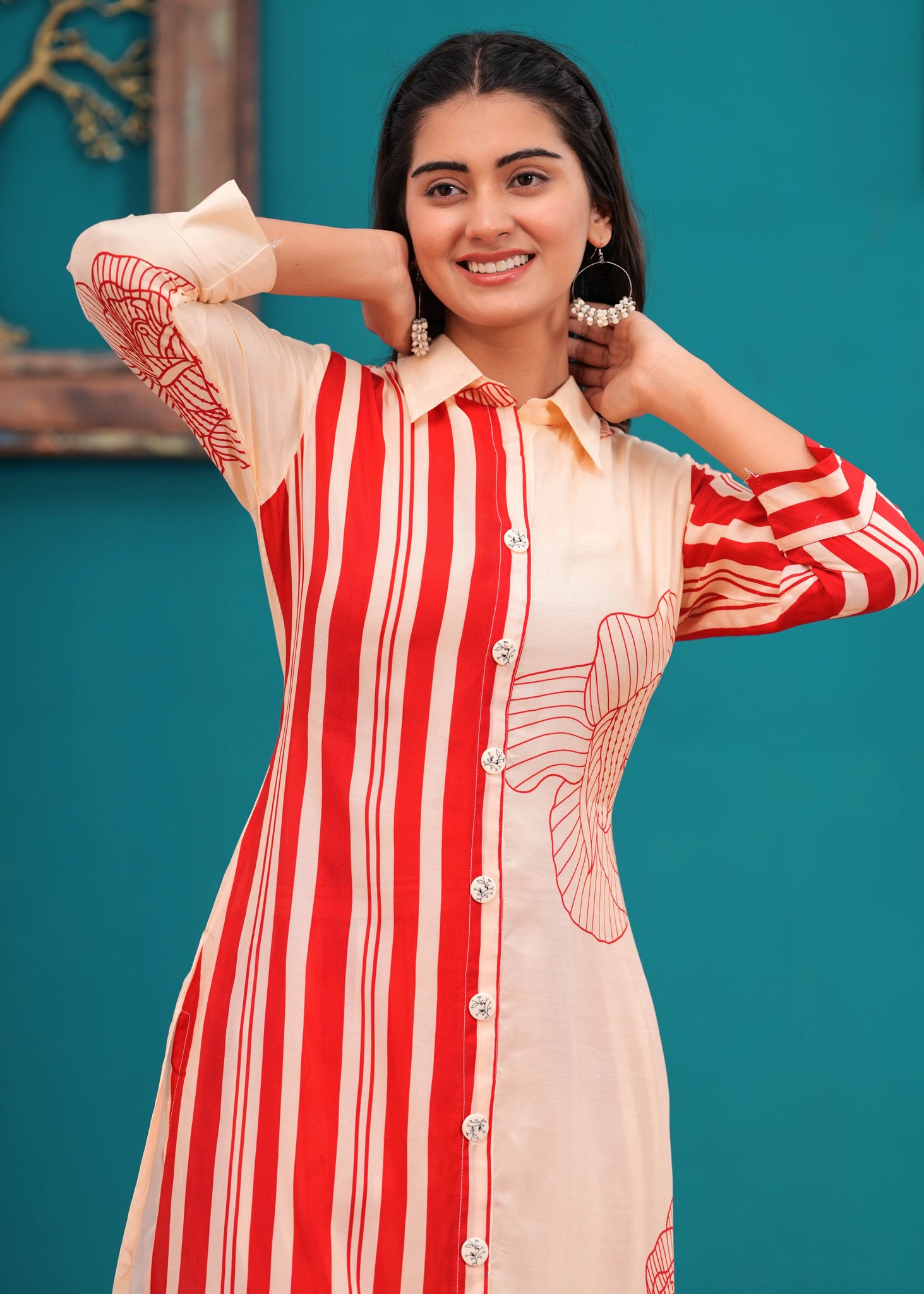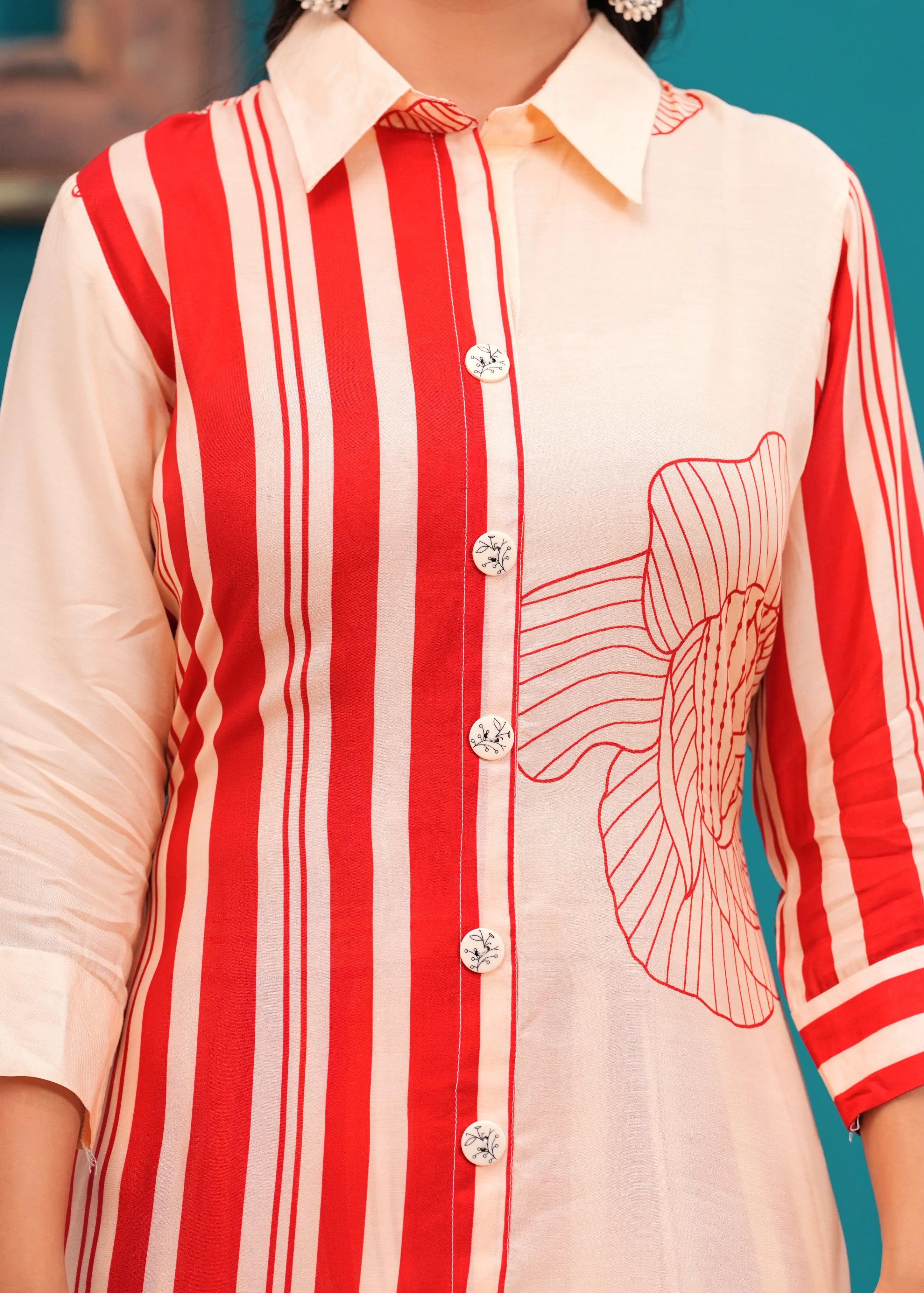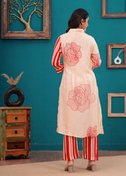 Cream Bold Red Floral Printed Front Stripe Muslin Kurta Set