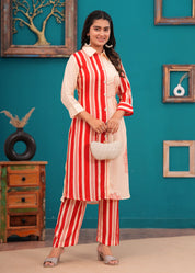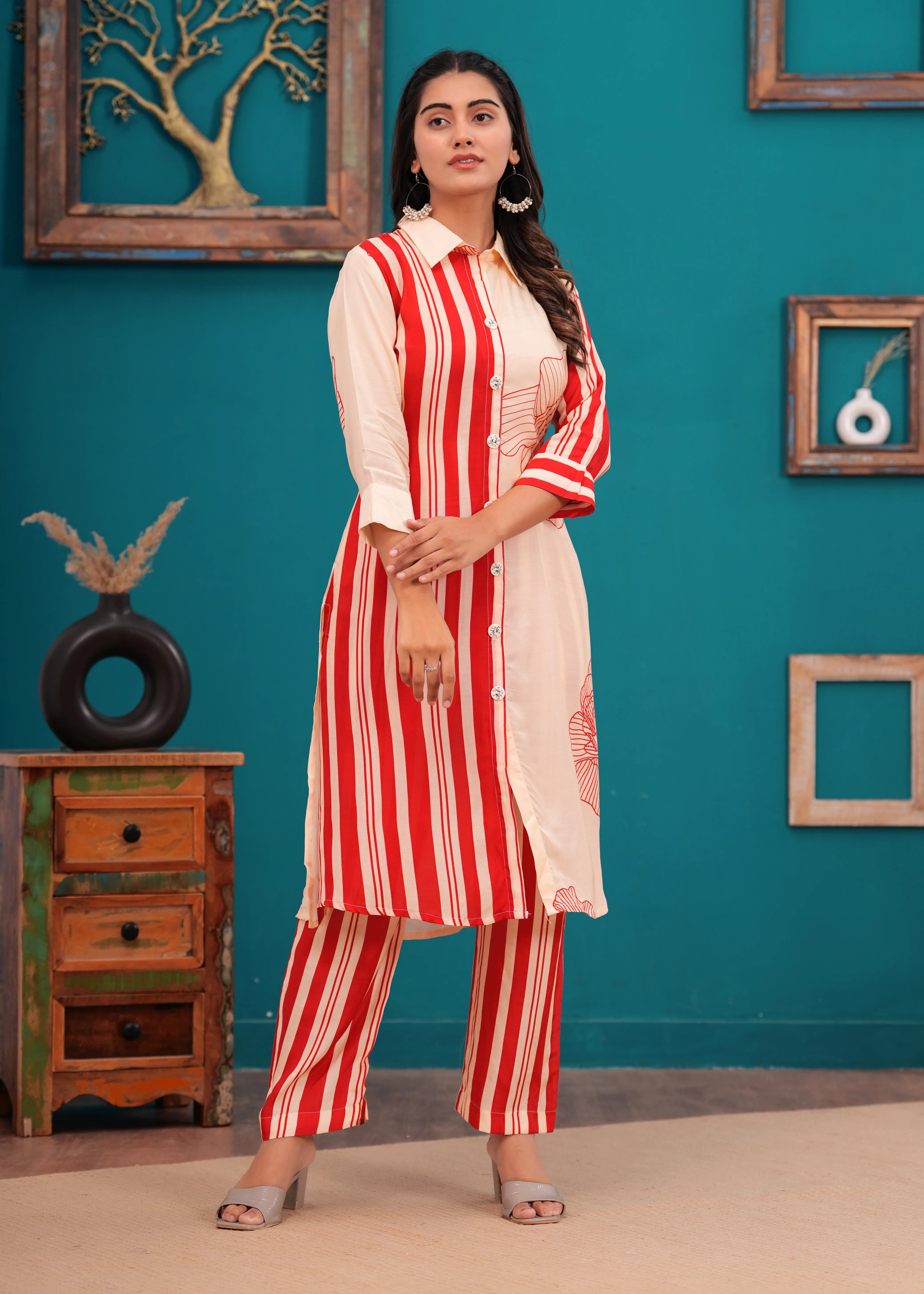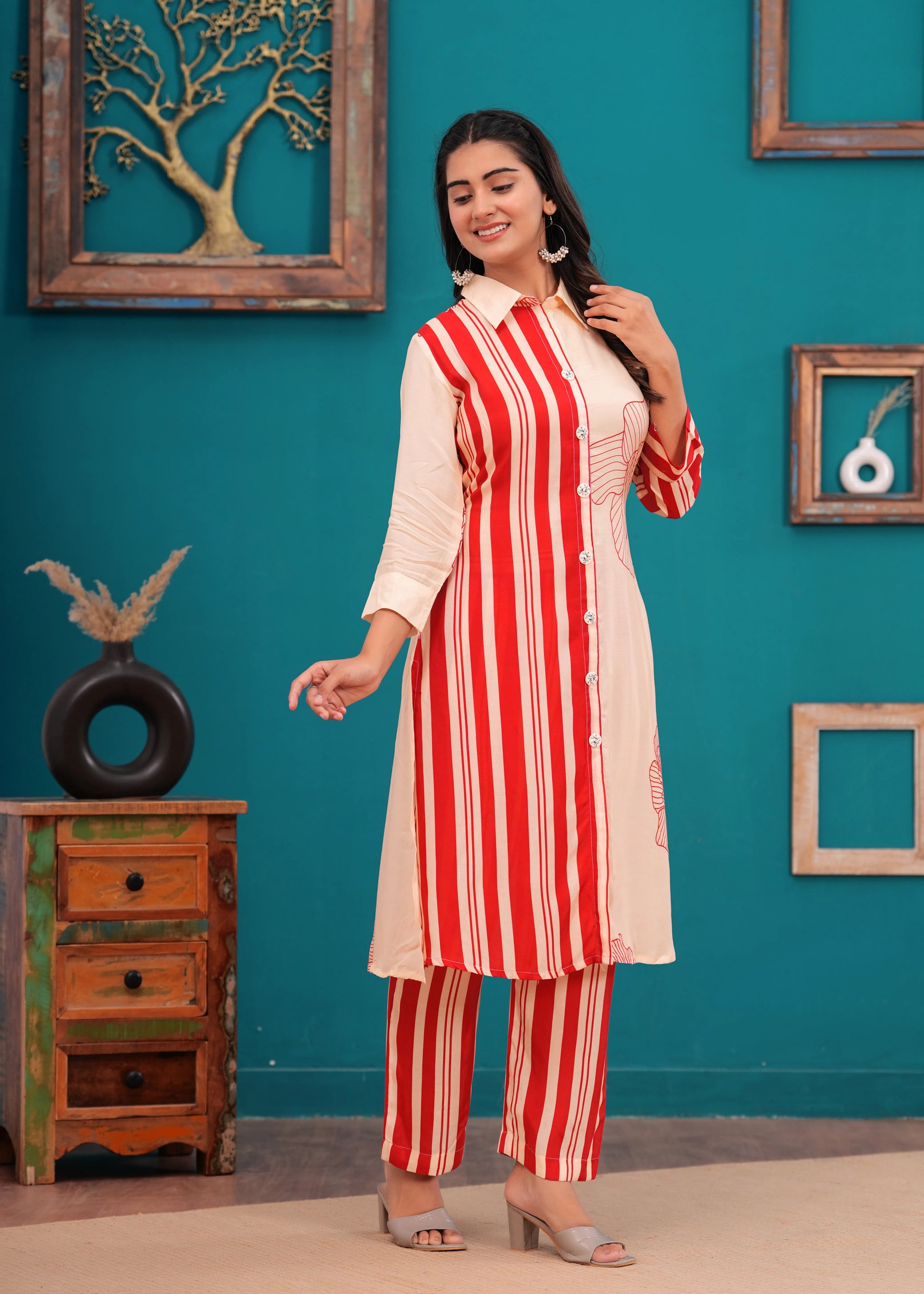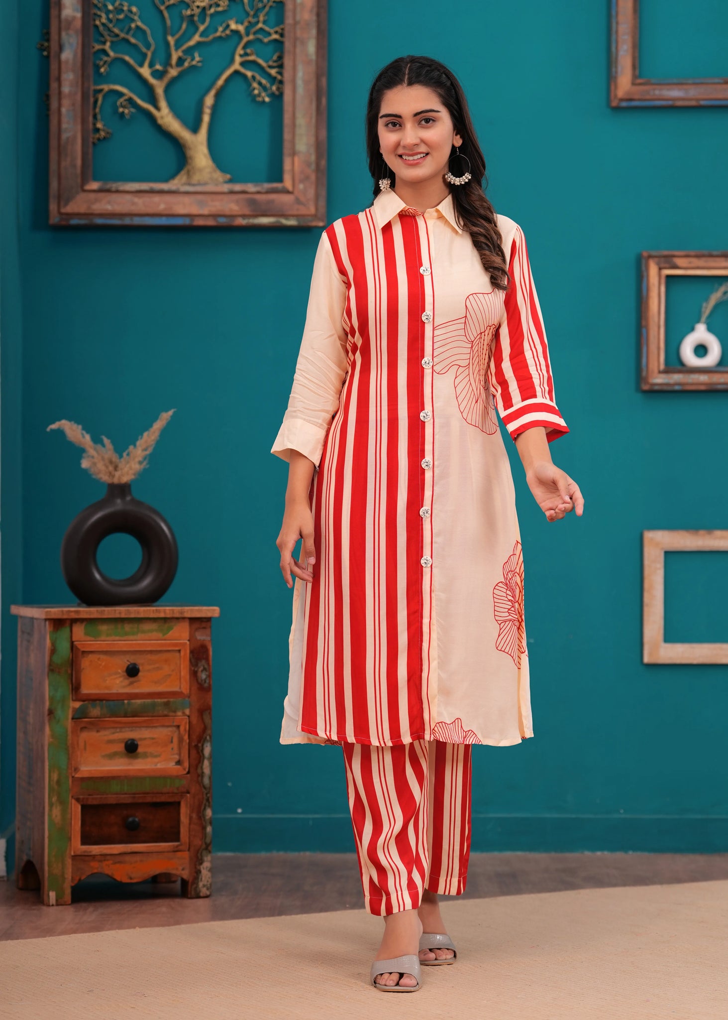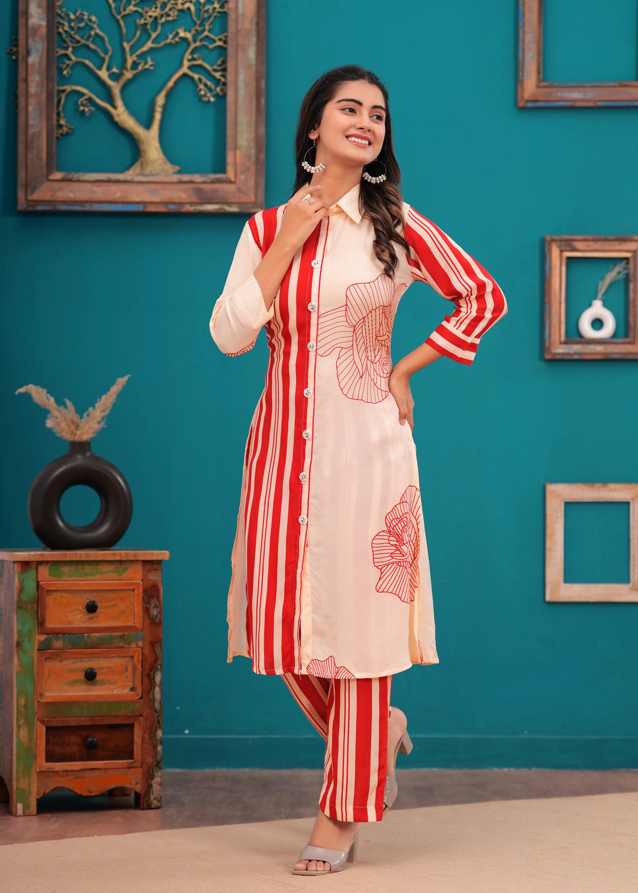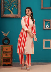 Turn heads with this vibrant cream and red floral printed kurta set, designed to radiate elegance and charm. The A-line kurta features bold floral prints, front stripe detailing, and delicate. The V-neckline is elevated adding a touch of sophistication. Paired with stripe printed pants, this 3/4th sleeve ethnic ensemble is perfect for festive occasions or stylish casual outings.