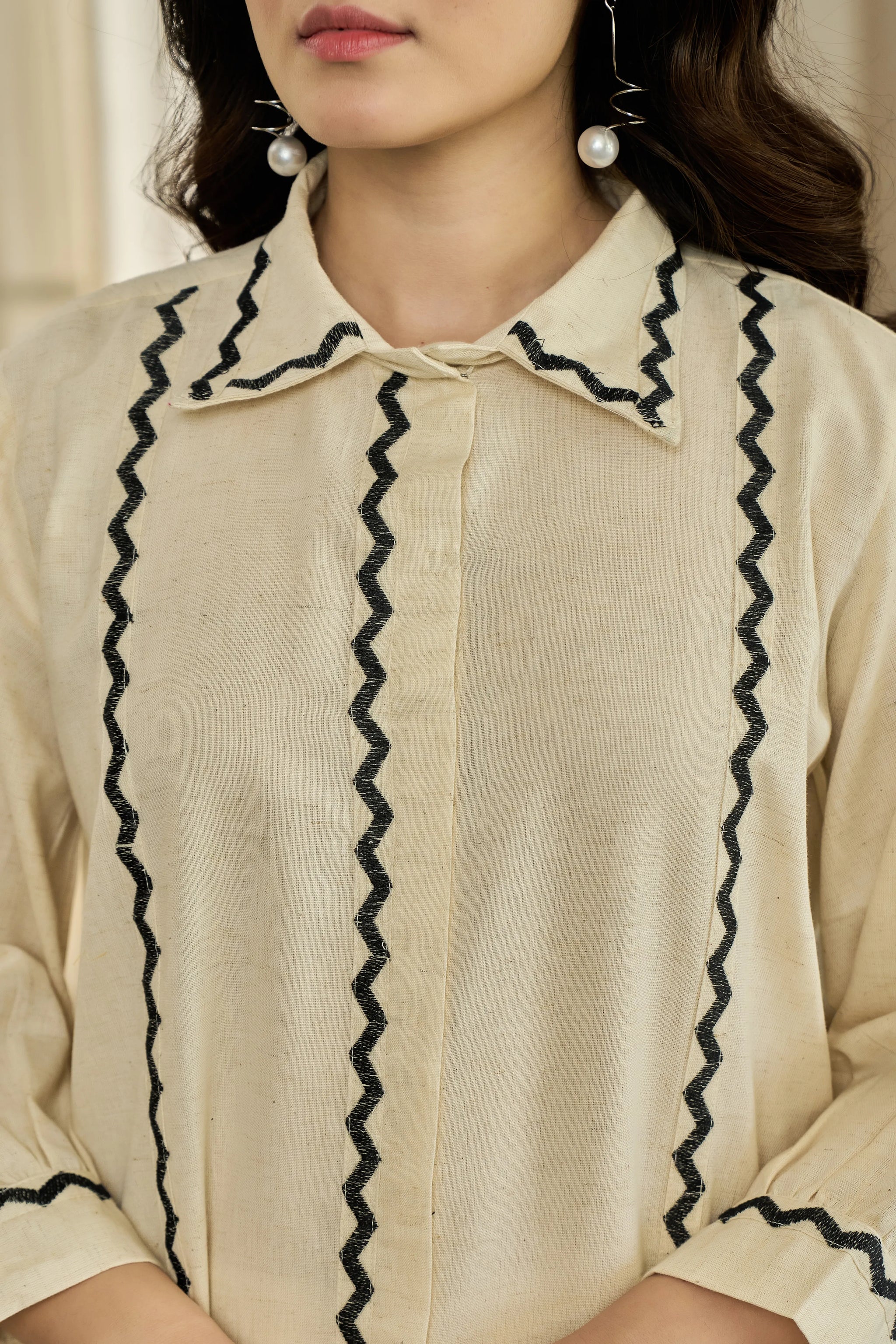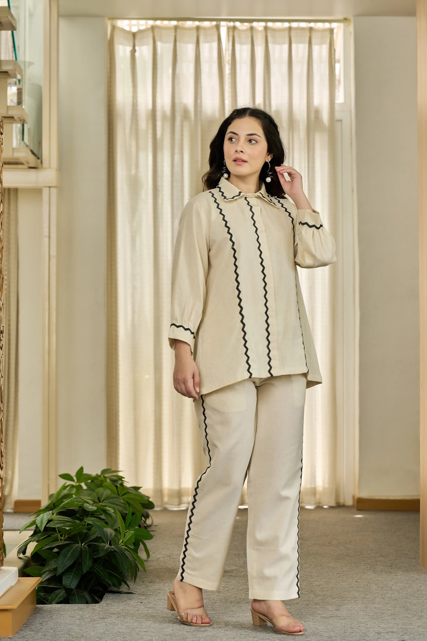 Ivory Motion: Cream Zigzag Embroidered Co-ord Set in Cotton Flex