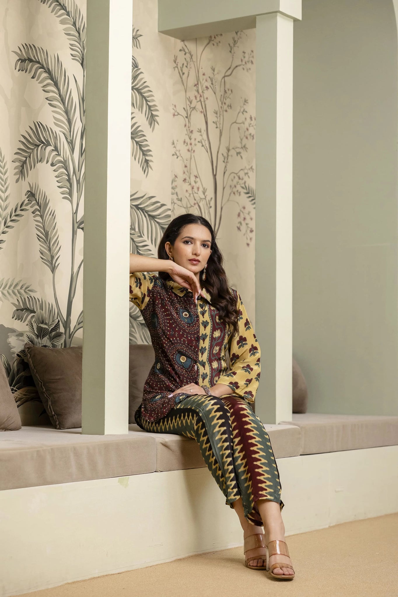 The shirt-style top features a collared neckline with button fasteners, 3/4th sleeves, and a playful mix of mandala and floral prints, adorned with delicate mirror embroidery for a subtle shimmer. The coordinated pants come with an elasticated waistband and bold chevron-inspired print panels, ensuring both comfort and style in every step.
