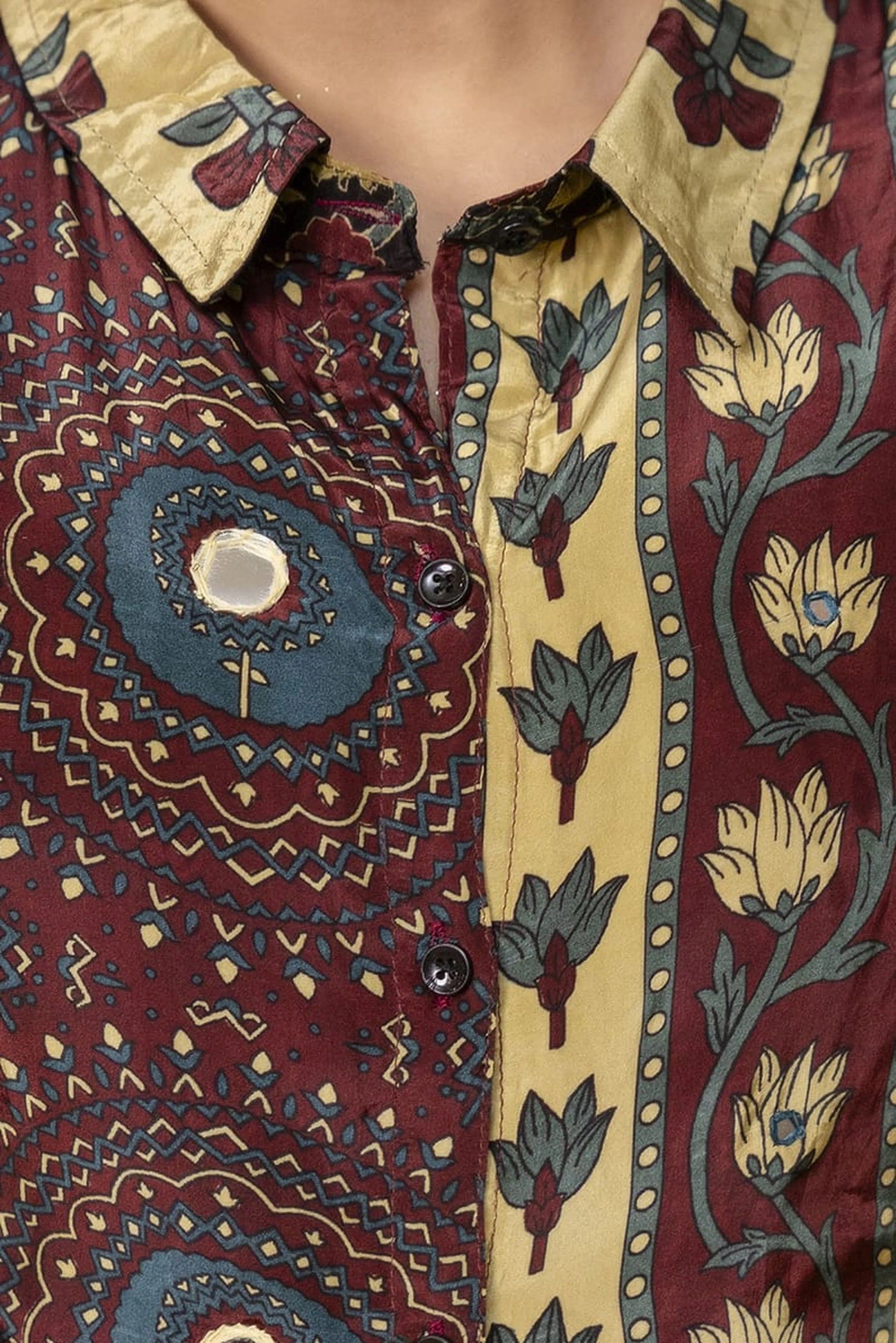 • Top Design: Shirt collar, front button fasteners, 3/4th sleeves, half mandala and half floral print, finished with hand-done mirror embroidery