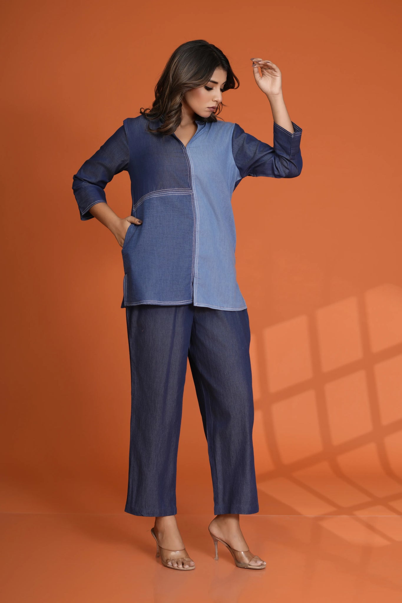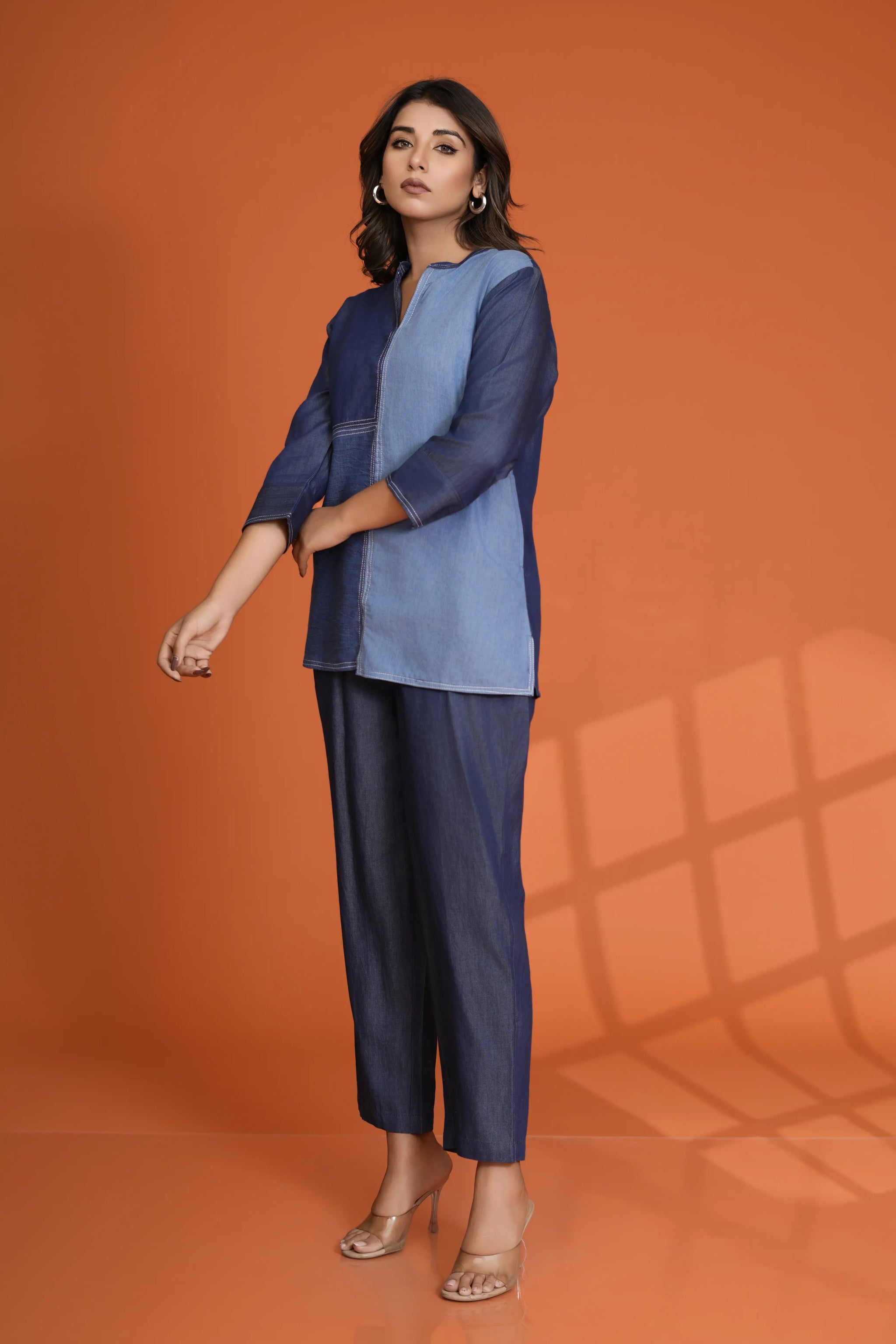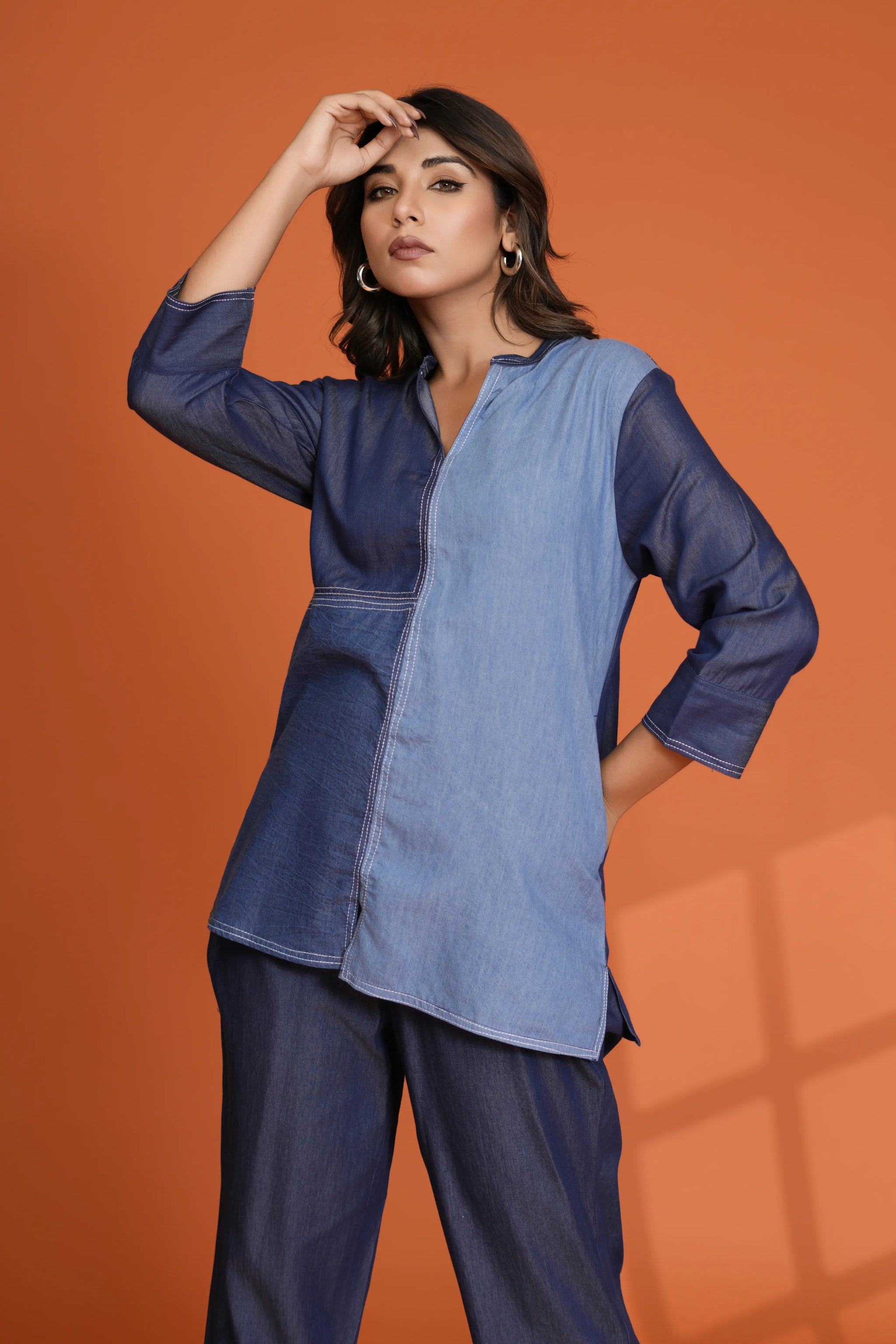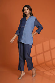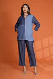 Add a modern edge to your wardrobe with this Denim Mismatch Top crafted in pure cotton denim. Designed with a unique mismatch denim panel look, it features a classic round neck, 3/4th sleeves, and eye-catching white topstitch detailing that adds structure and style to this casual essential.
