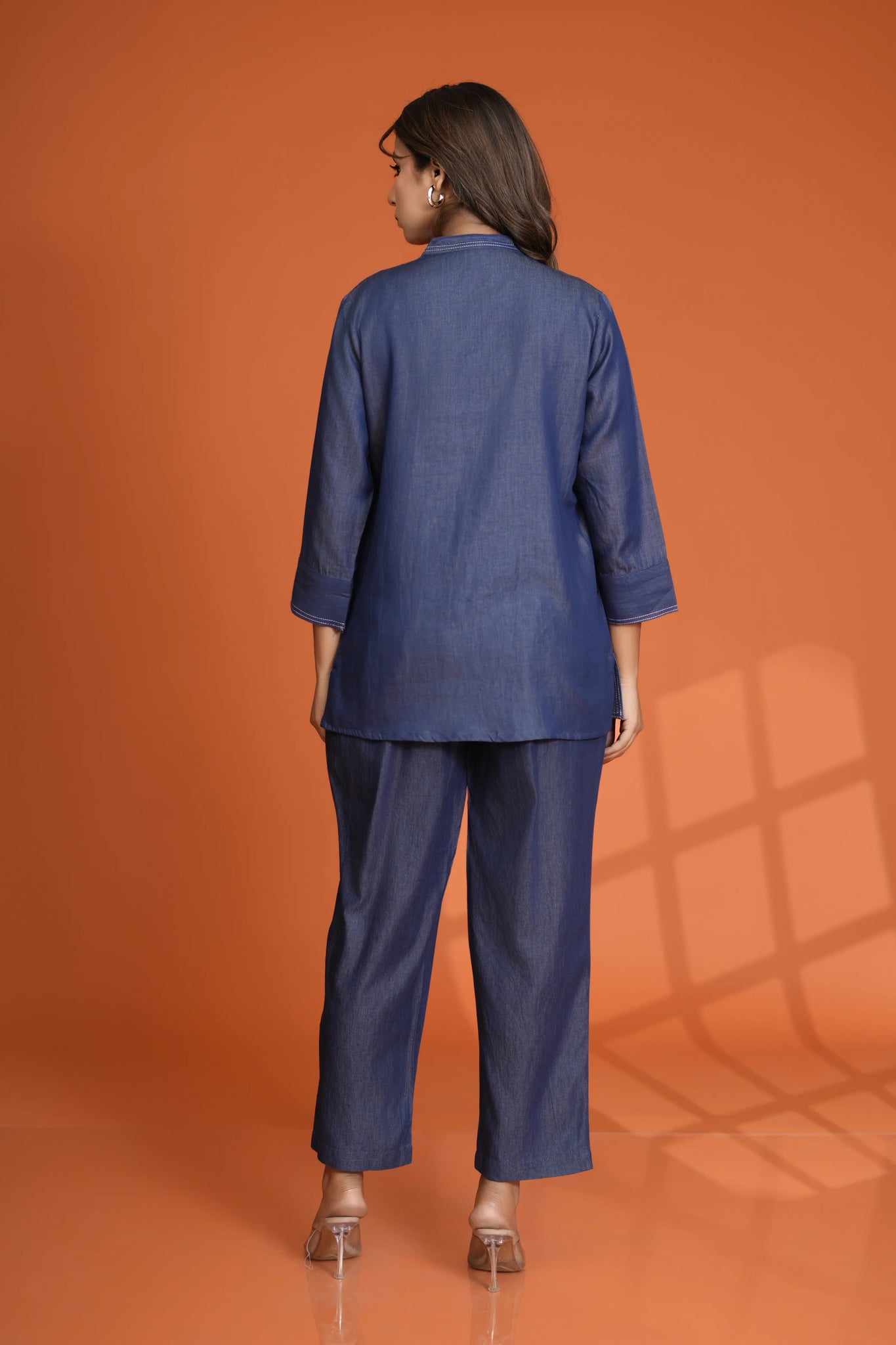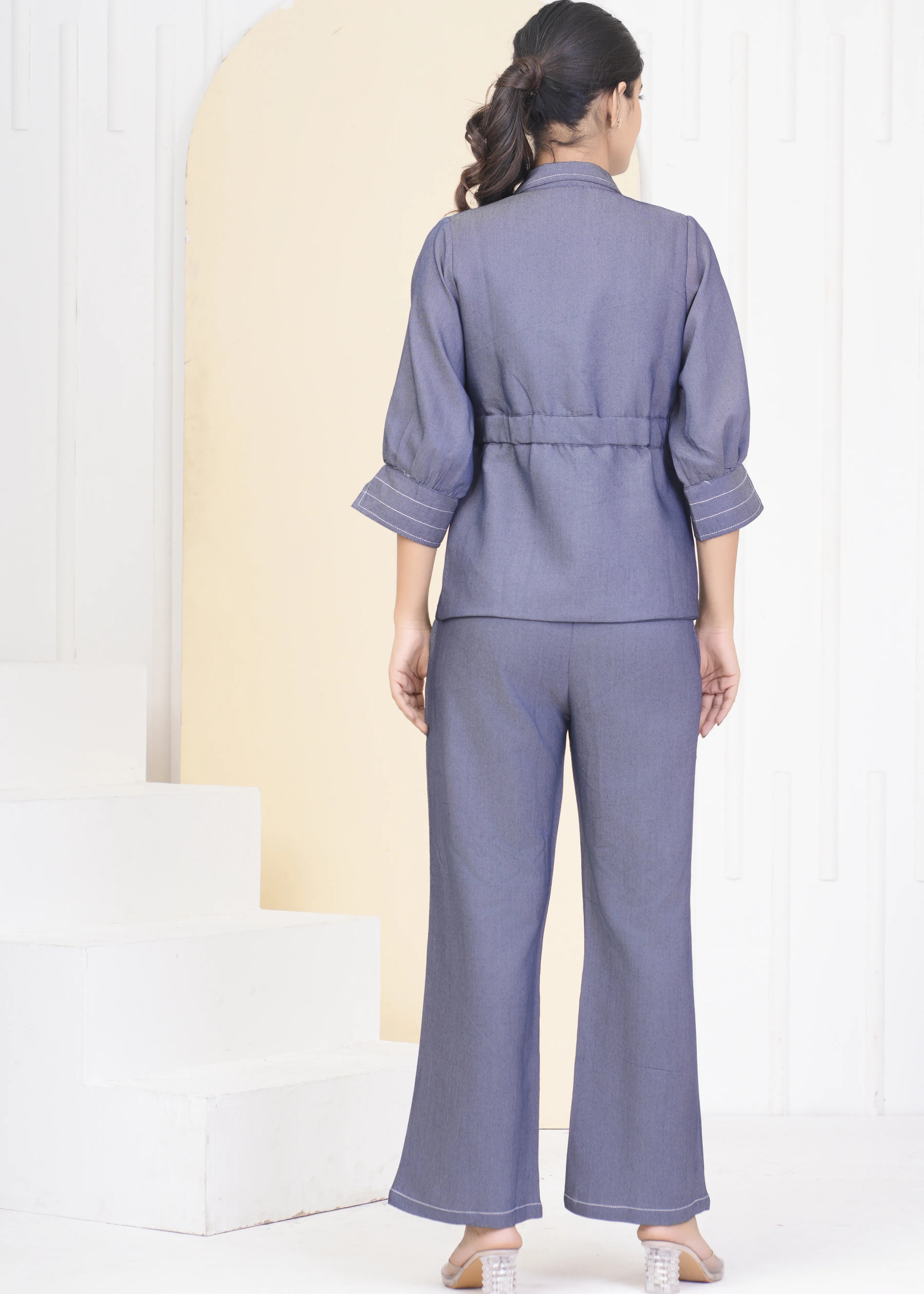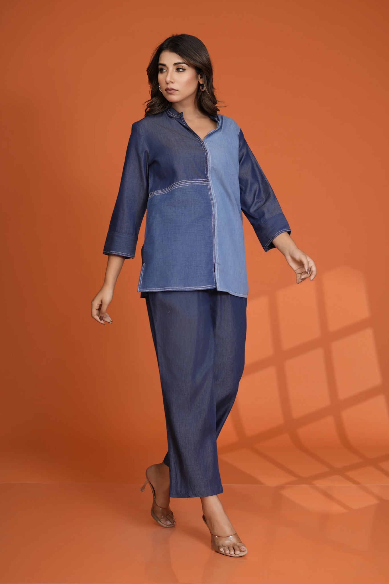 Add a modern edge to your wardrobe with this Denim Mismatch Top crafted in pure cotton denim. Designed with a unique mismatch denim panel look, it features a classic round neck, 3/4th sleeves, and eye-catching white topstitch detailing that adds structure and style to this casual essential.