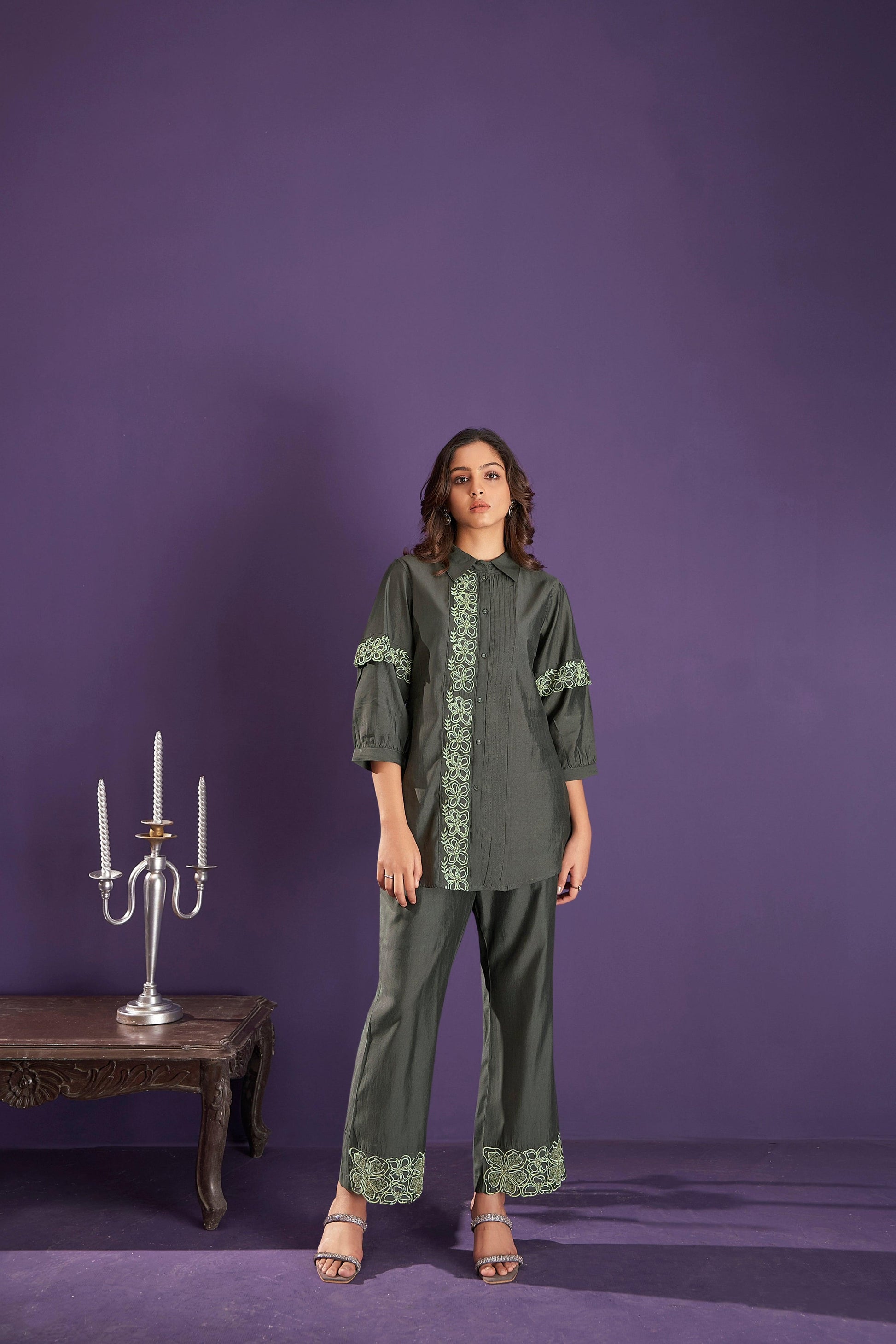 Green Embroidered Muslin Tunic & Trouser Co-Ord Set