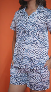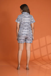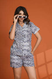 Grey & Blue Abstract Batik Printed Cotton Cambric Shirt & Shorts Set