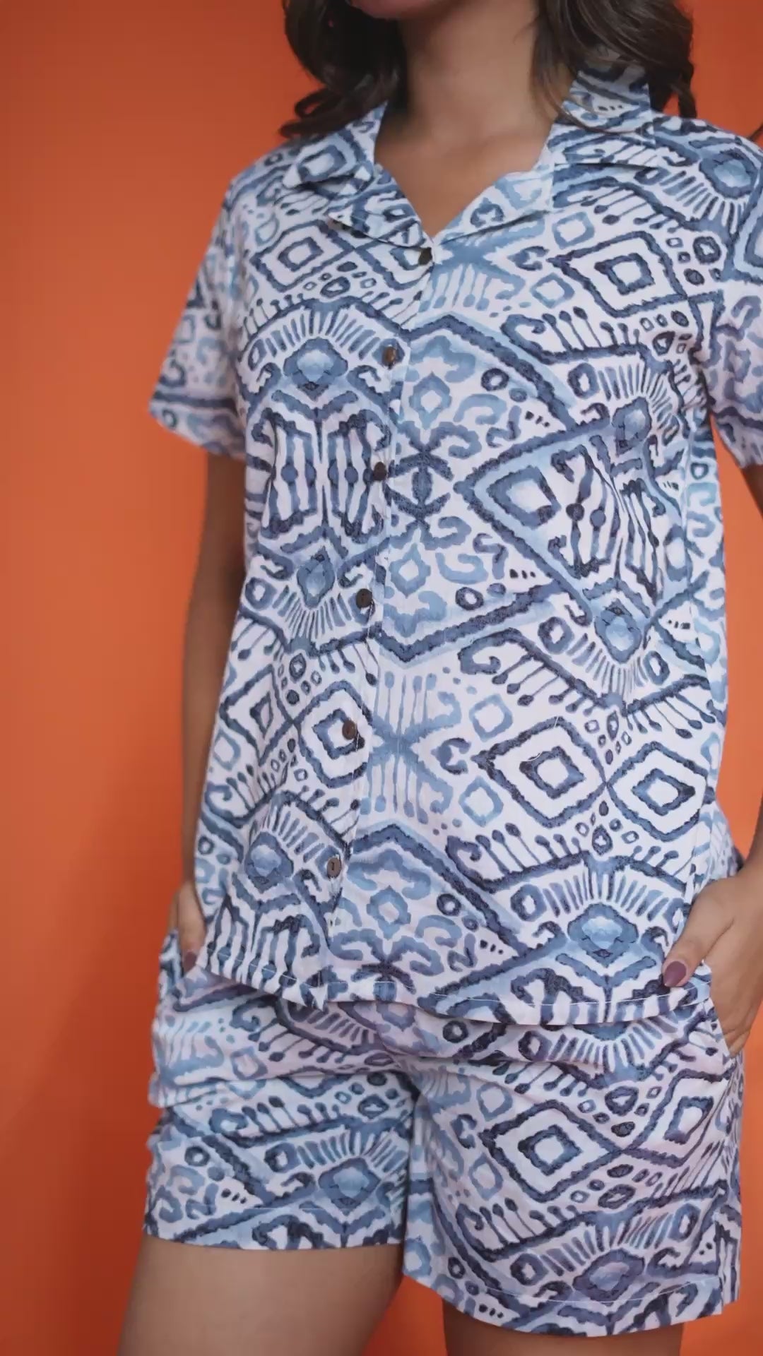 Step into effortless summer style with this Grey & Blue Abstract Batik Printed Shirt & Shorts Set. Crafted from breathable cotton cambric, this co-ord features a shirt collar button-down top with half sleeves, paired with matching relaxed-fit shorts—perfect for brunches, vacations, or lounging in style.