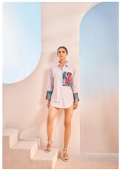 Make a bold statement with this powder pink cotton shirt, designed to elevate your casual wardrobe. Featuring striking abstract print patches paired with shimmering rhinestone accents, this shirt exudes a modern edge while maintaining timeless appeal. The curved hem and slightly loose fit offer both comfort and style, while the straight full sleeves with rhinestone-embellished cuffs add a unique flair. Crafted from premium poplin fabric, it’s perfect for adding an artistic touch to your everyday look.