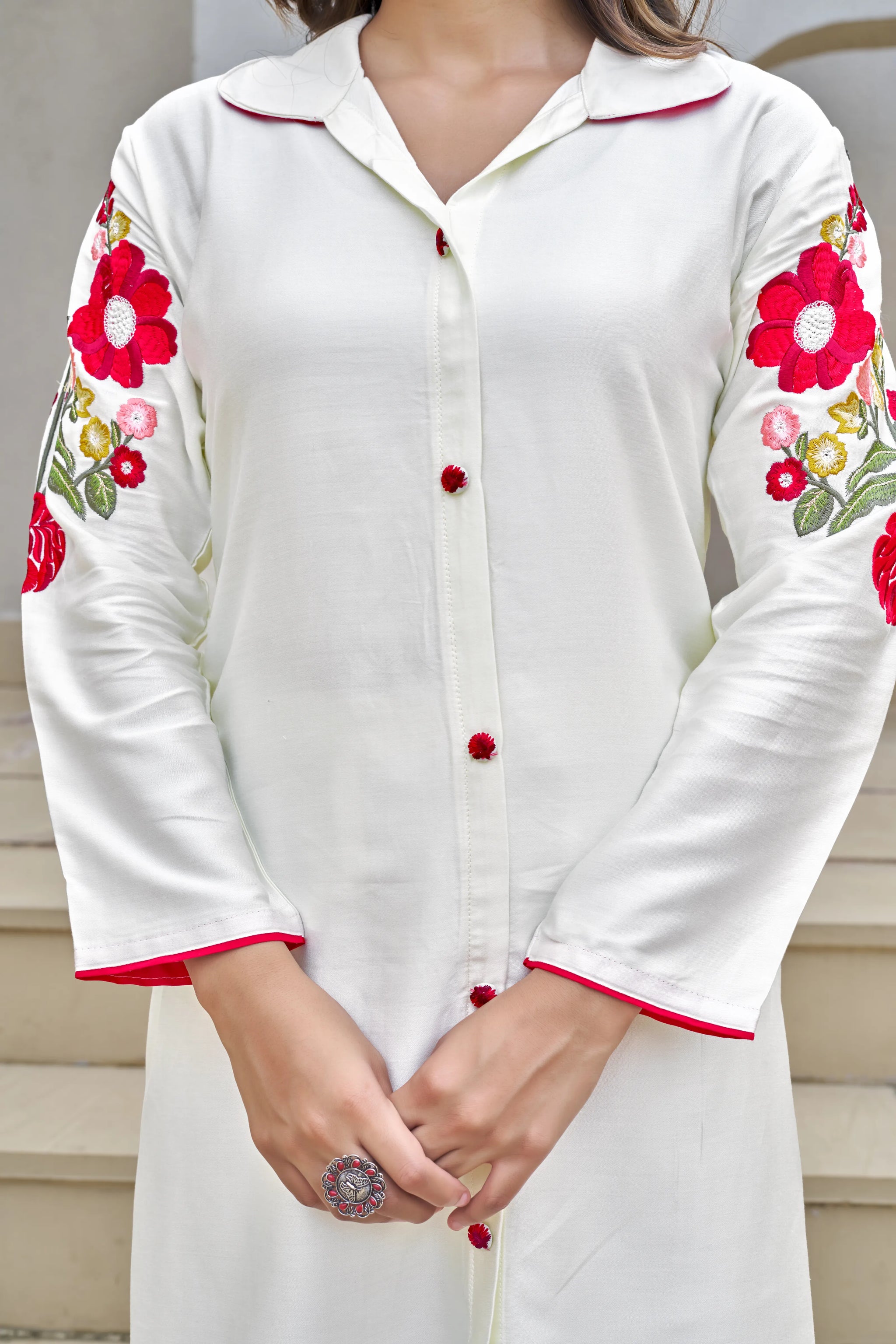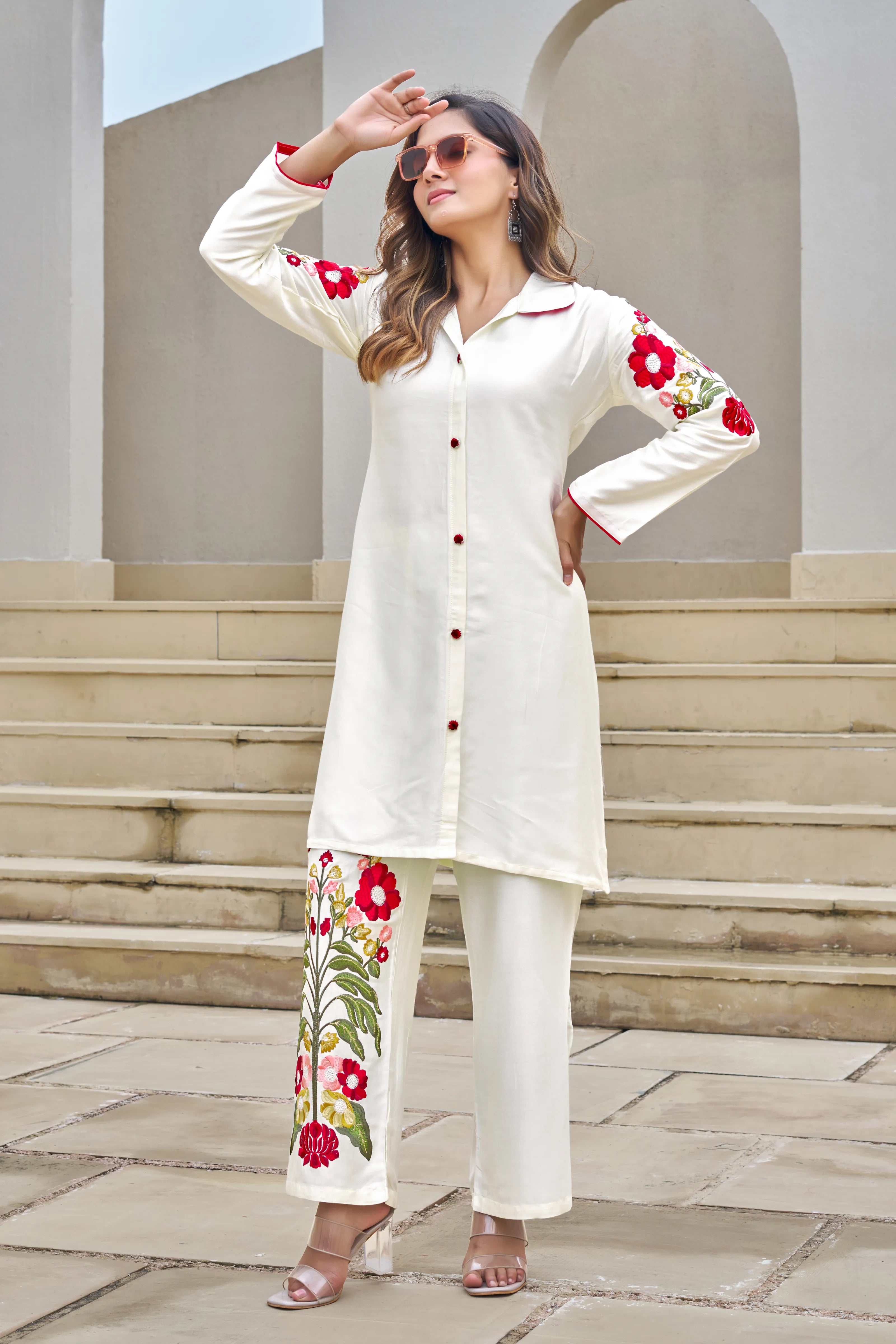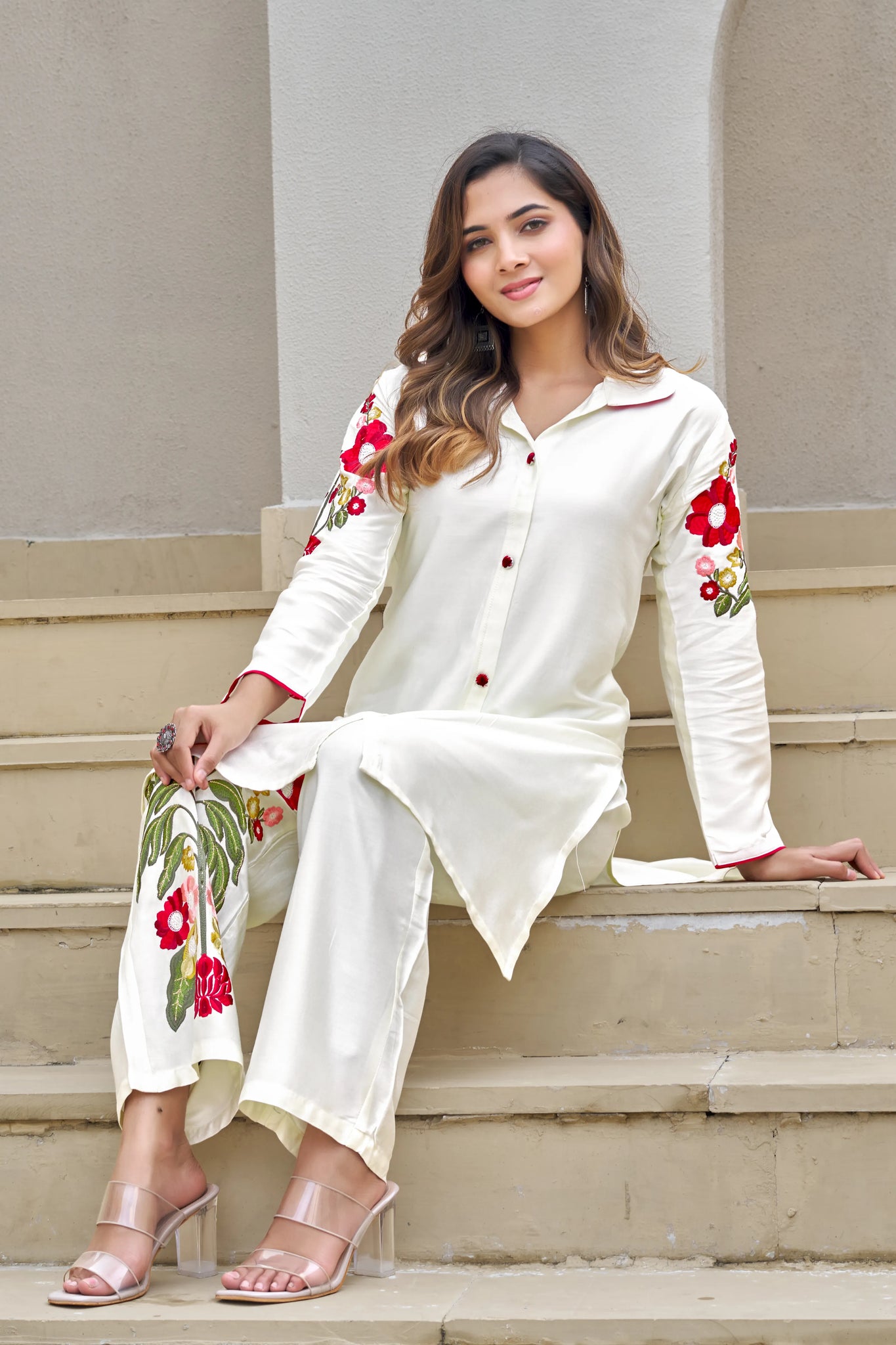 Ivory Bloom: Embroidered Floral Viscose Silk Co-ord Set