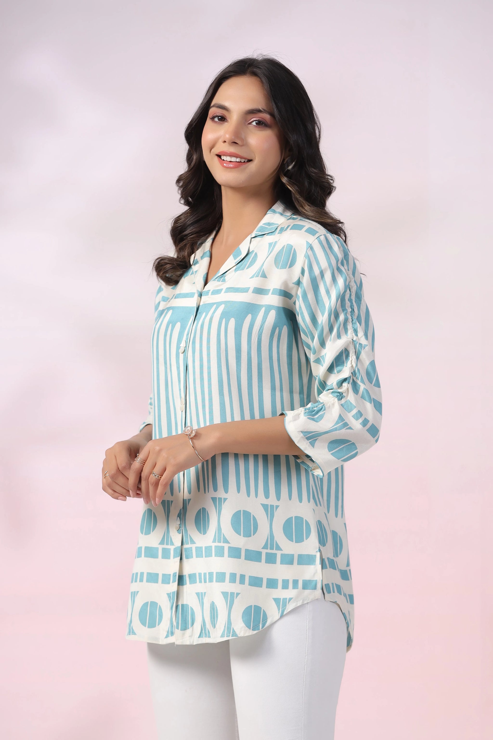 The lapel collar adds a structured touch, while the faux front placket is adorned with delicate shell embellishments for a subtle hint of elegance. The ruched 3/4th sleeves and curved hemline create a flattering, relaxed fit—making this tunic an ideal choice for casual outings, workwear, or stylish daywear.
