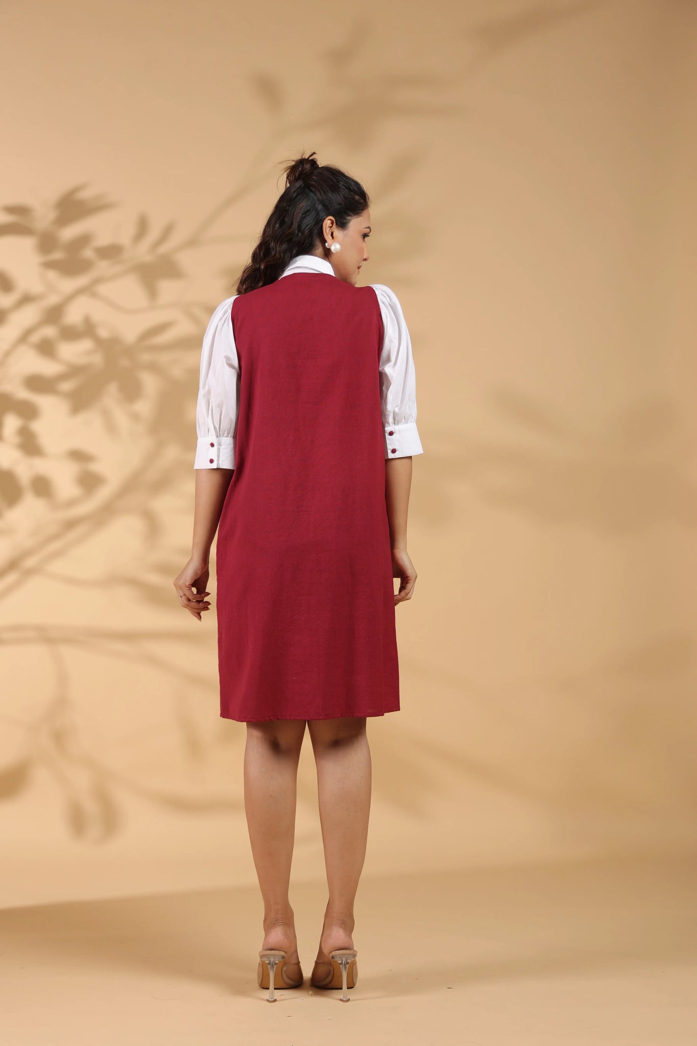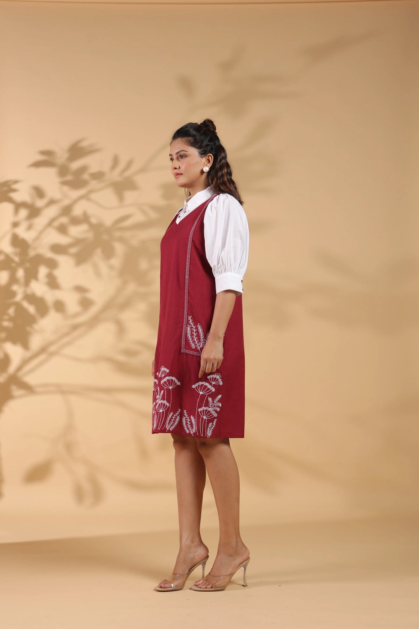 Upgrade your style game with this maroon embroidered mini shirt dress—a versatile piece that effortlessly transitions from day to night.
