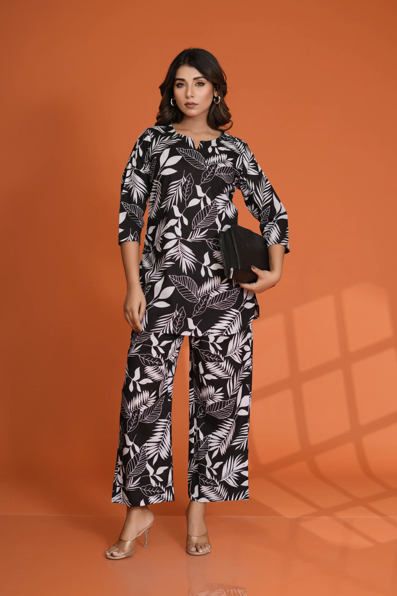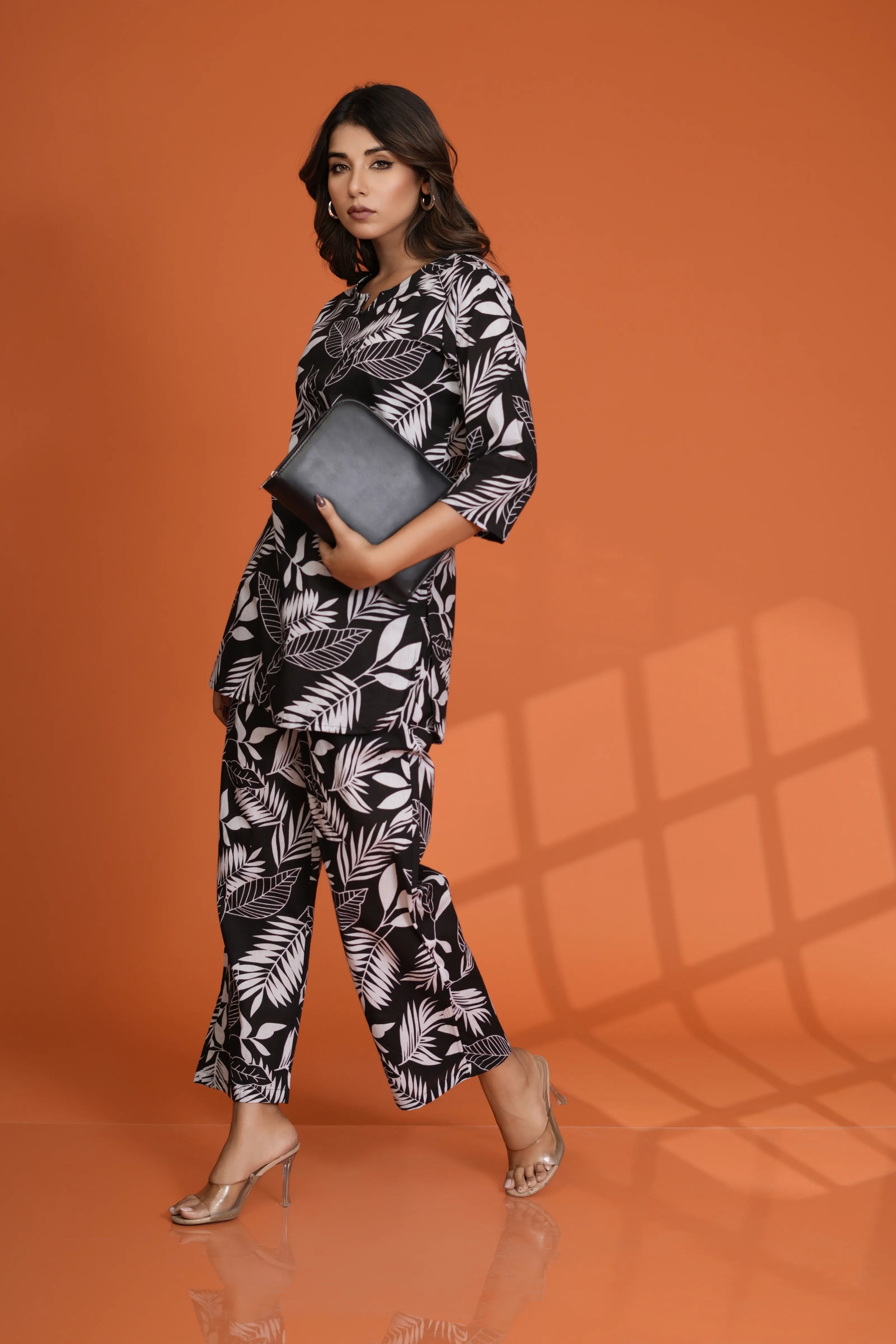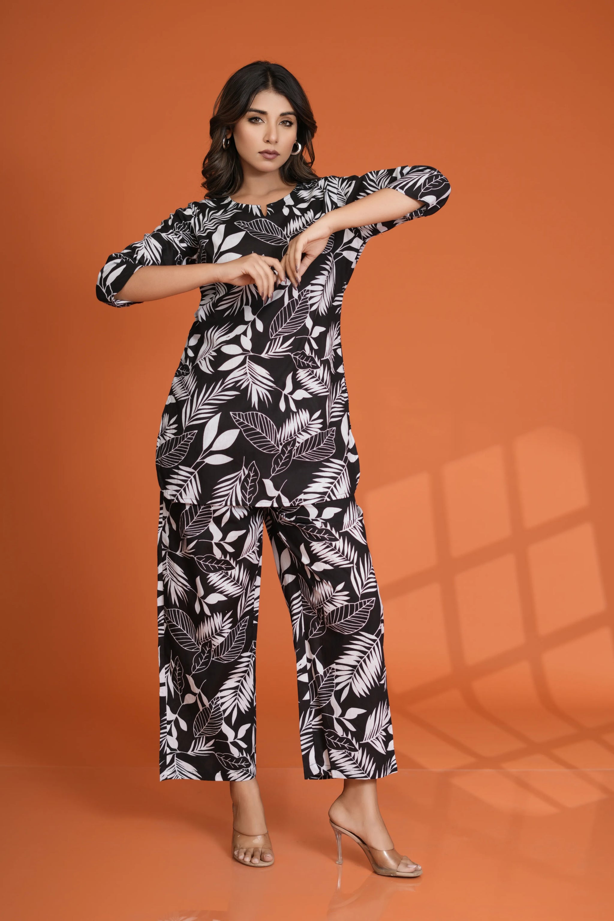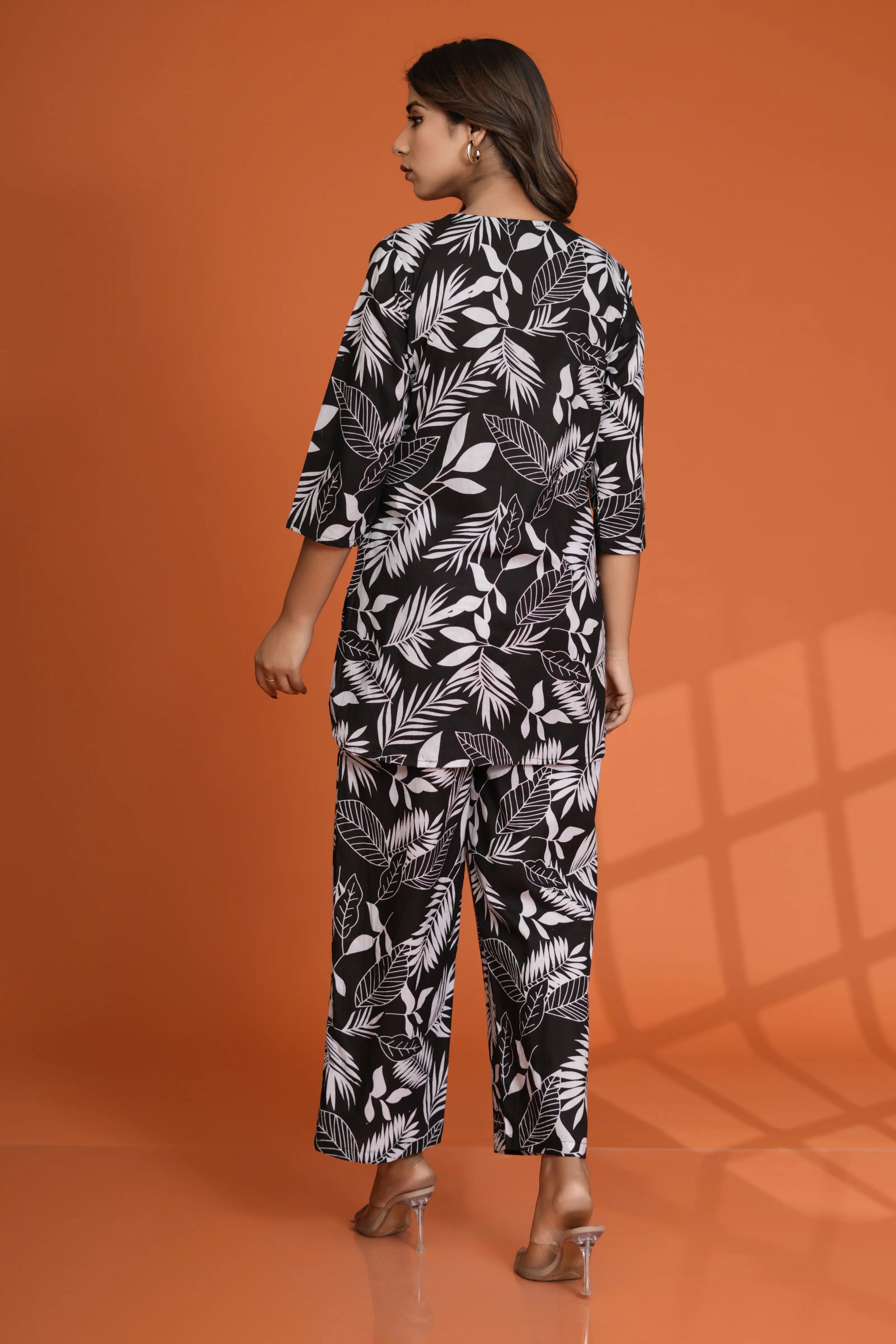 Monochrome Bold Leaf Printed Cotton Cambric Co-Ord Set