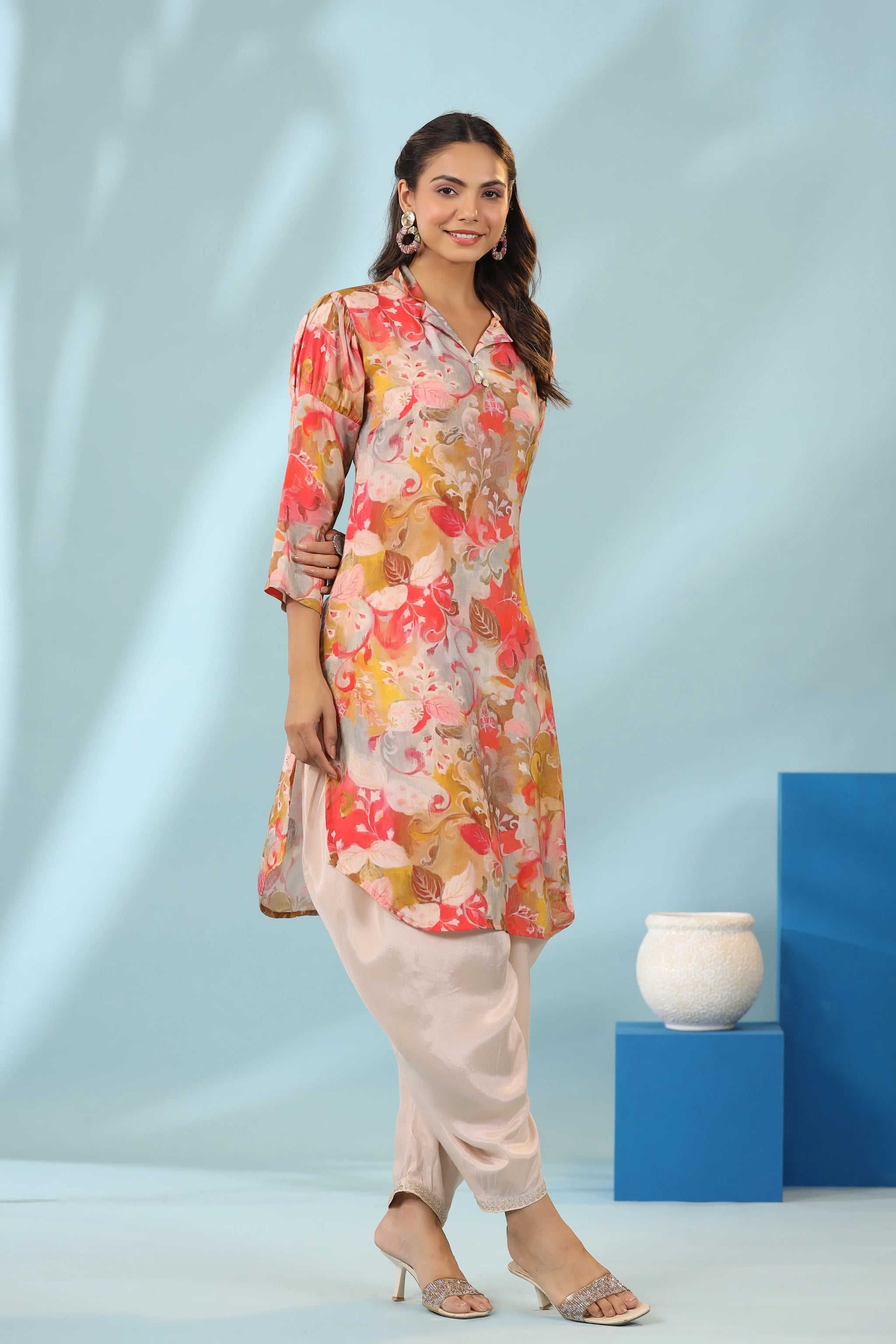 Multi-Floral Printed Muslin Shawl Collar Kurta with Tulip Dhoti Pants: Effortless Elegance