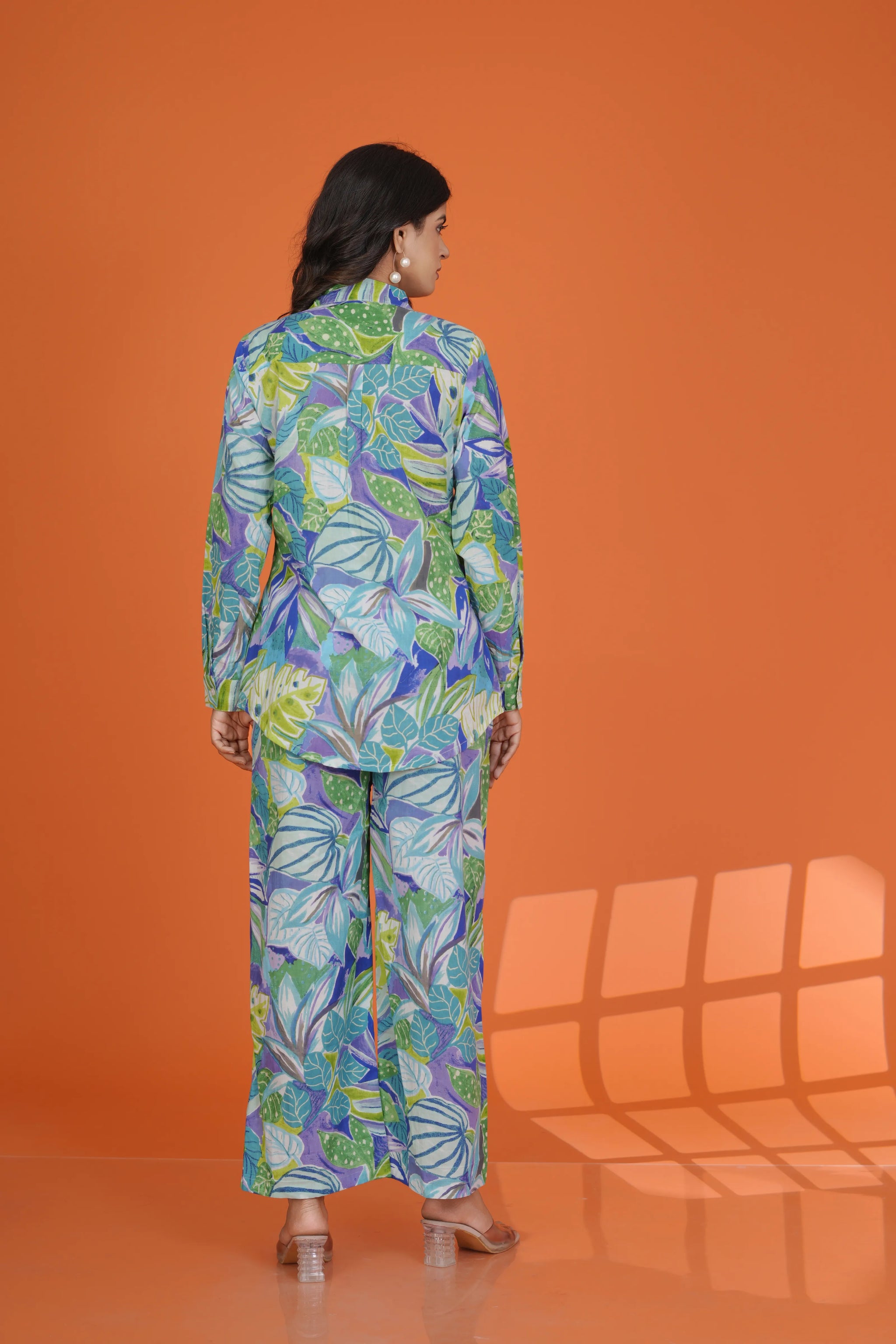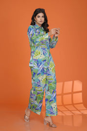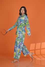 The shirt-style top features a classic collar, 3/4th sleeves, and a button-down front, tailored in a flattering relaxed fit. The print bursts with oversized tropical leaves in vibrant shades of green, blue, lavender, and citrus—rendered in a painterly, abstract style. Coordinated straight-fit pants continue the motif, making this set feel like a curated work of botanical art.