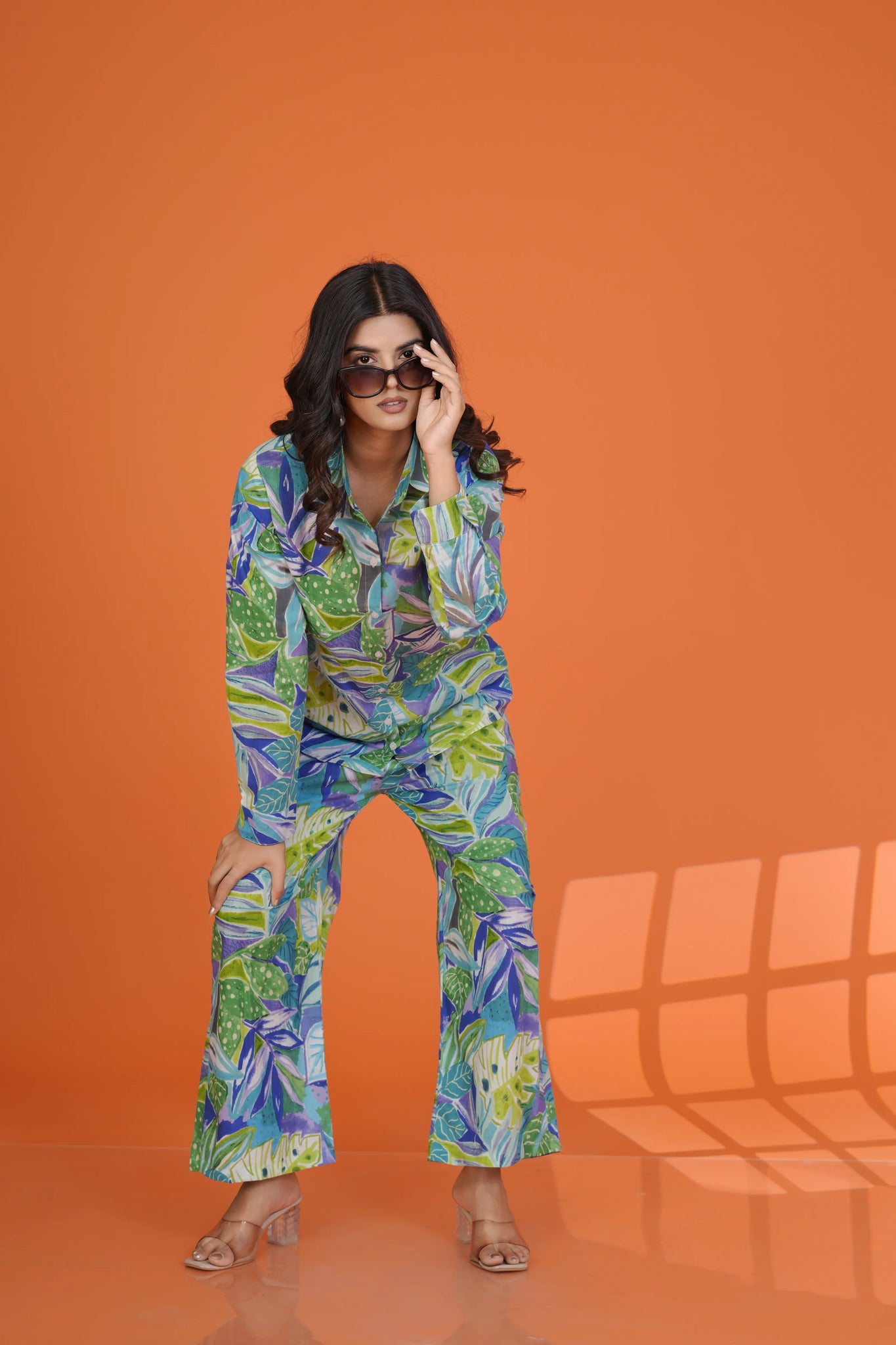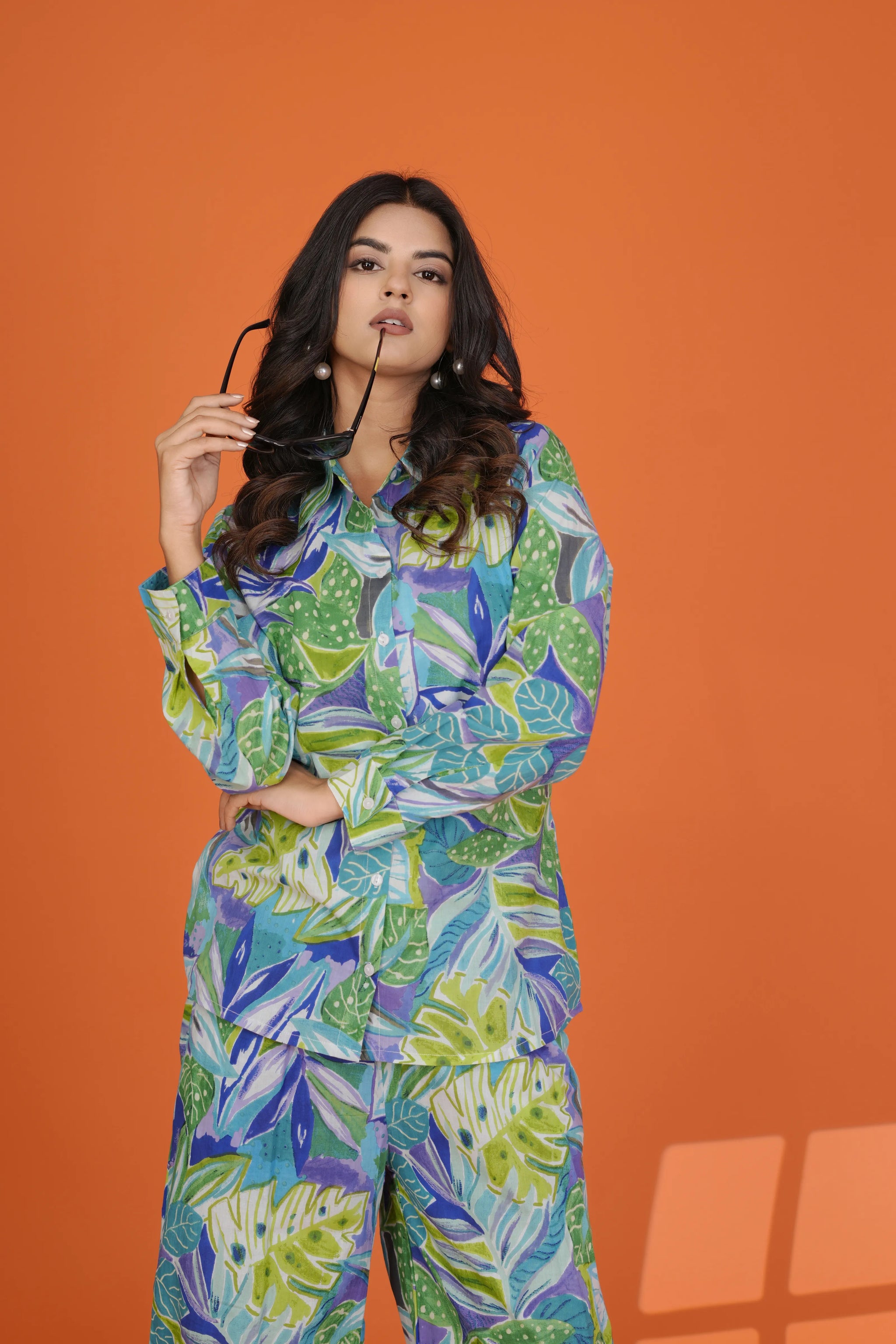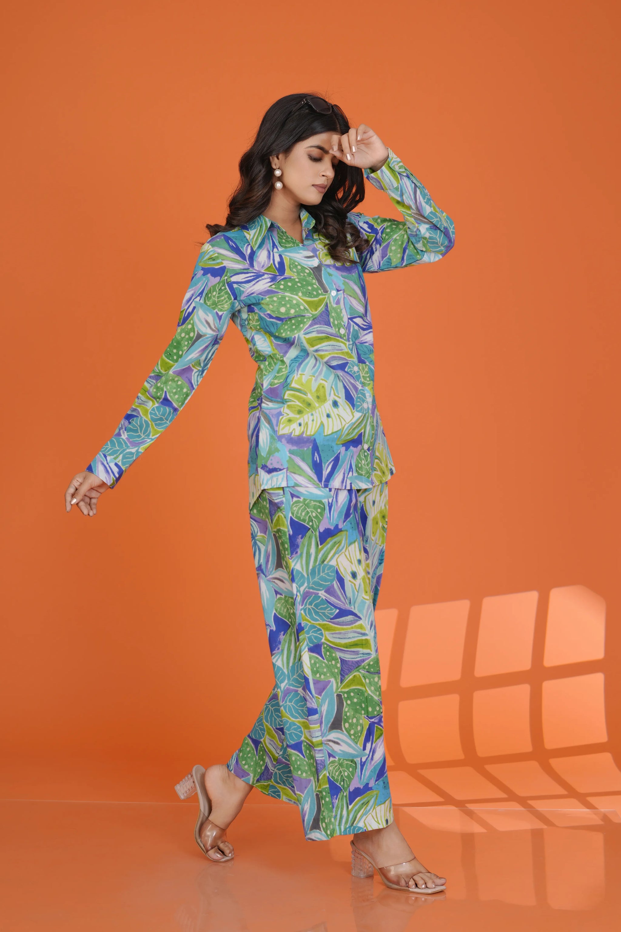 Tropical Pulse: Multicolor Leaf Print Co-Ord Set in Cotton Cambric