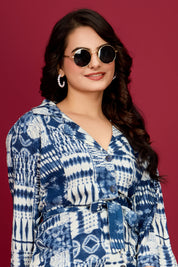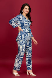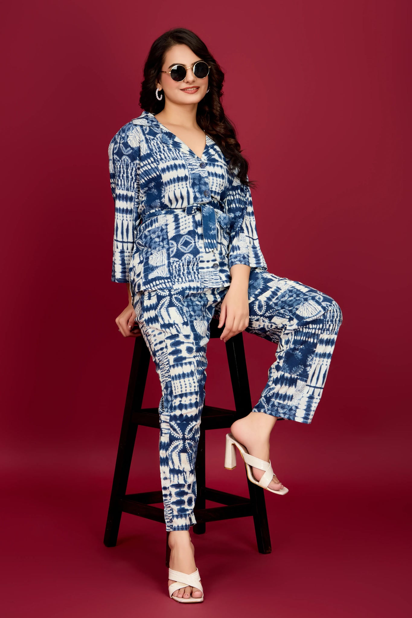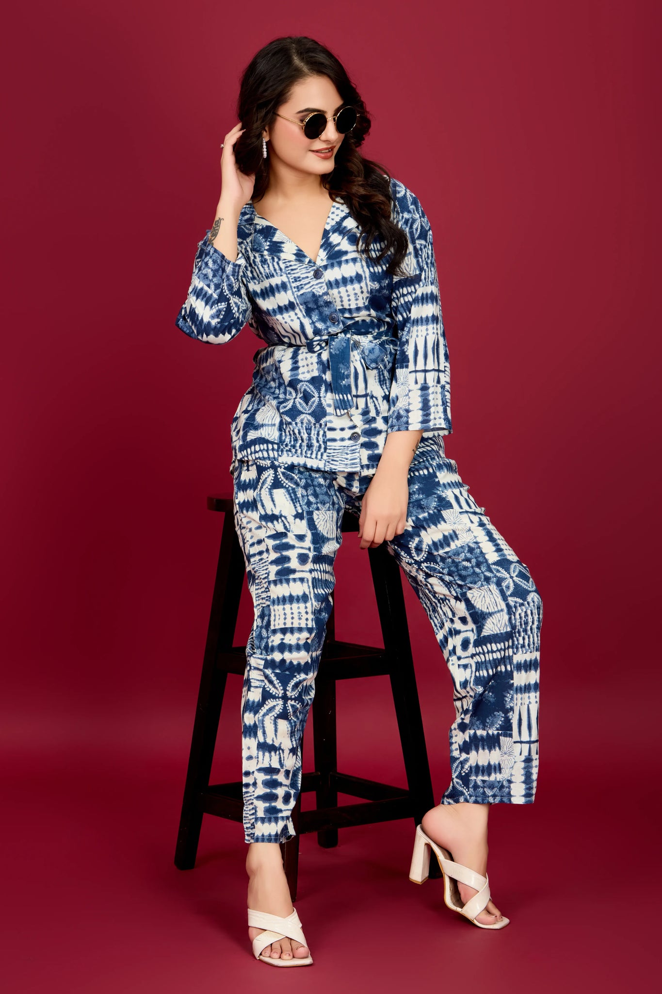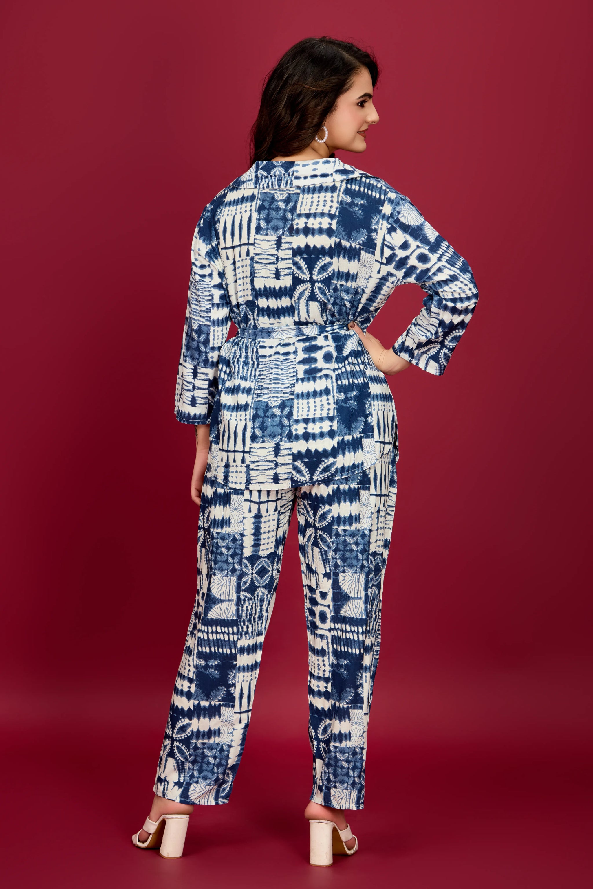 Navy Blue & Cream Abstract Viscose Flex Print Tie-Front Co-Ord Set