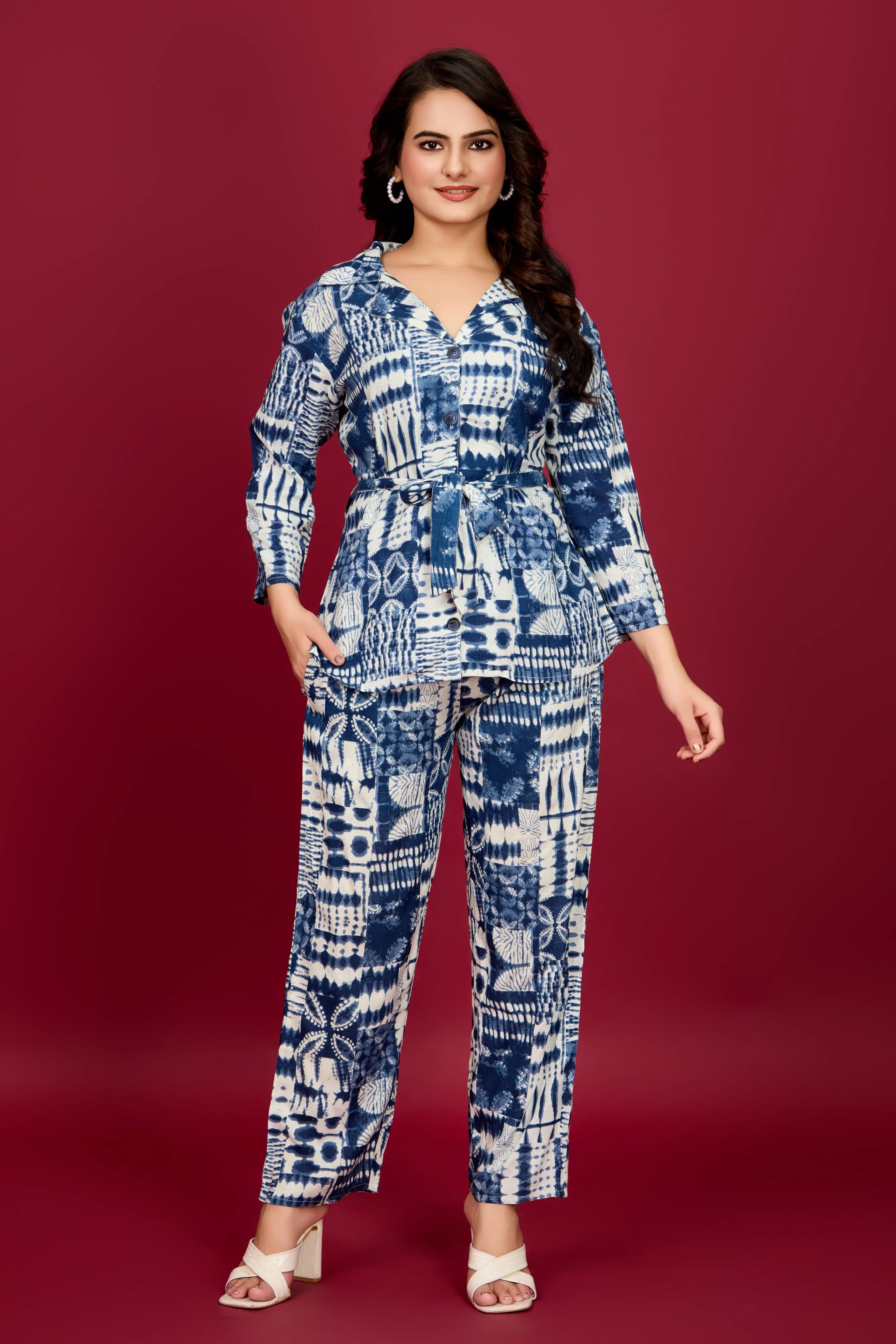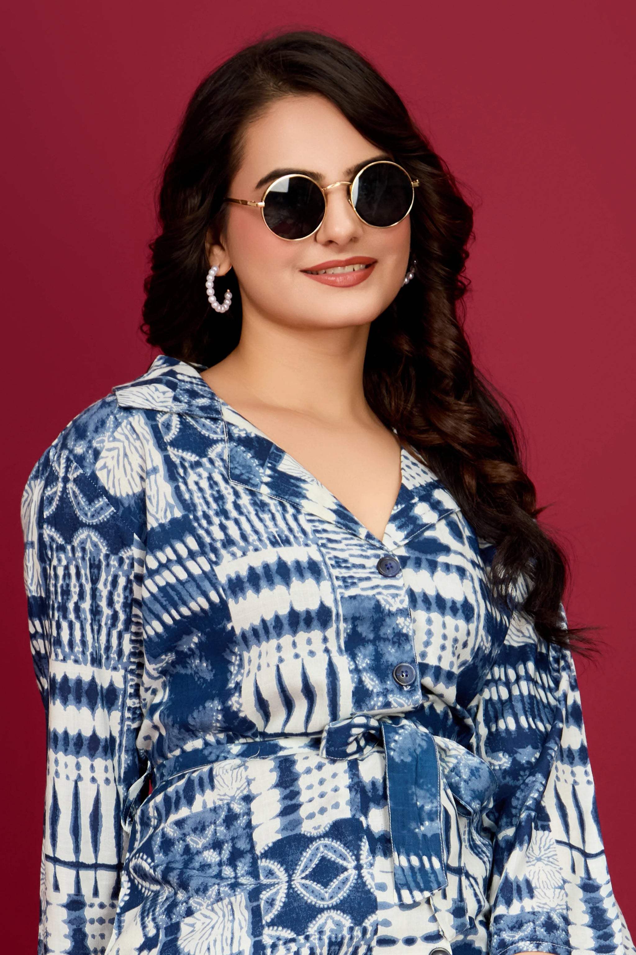 This Navy Blue & Cream Abstract Viscose Flex Print Tie-Front Co-Ord Set offers a sophisticated yet comfortable style for any occasion, combining fashion-forward design with the ease of viscose flex fabric.