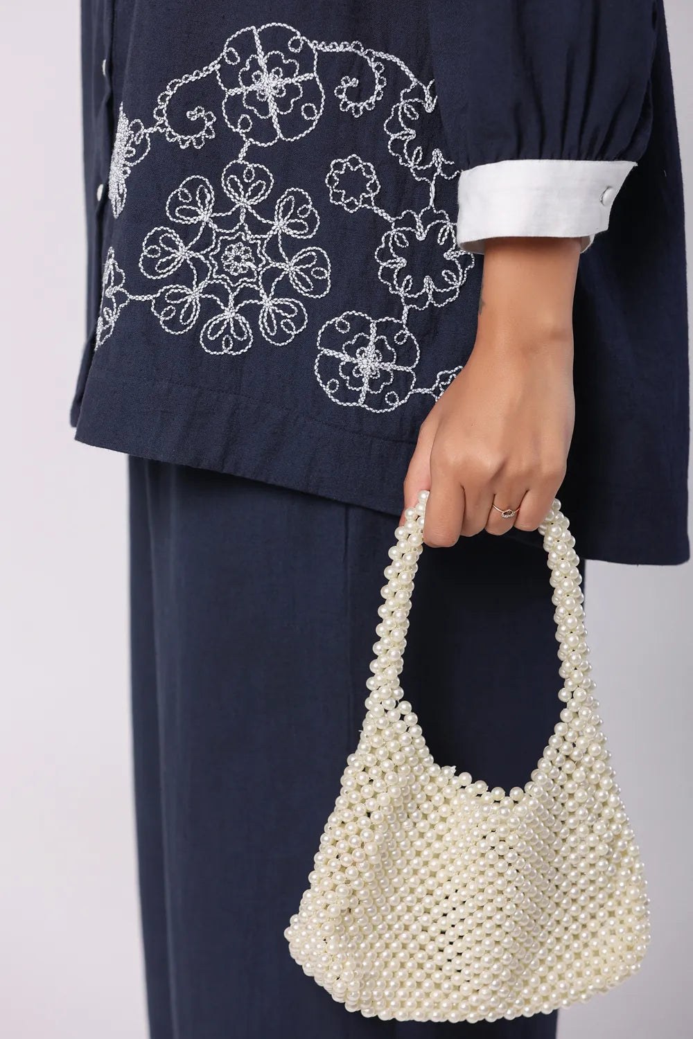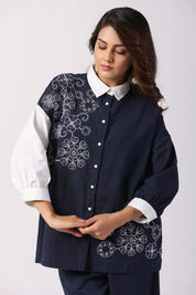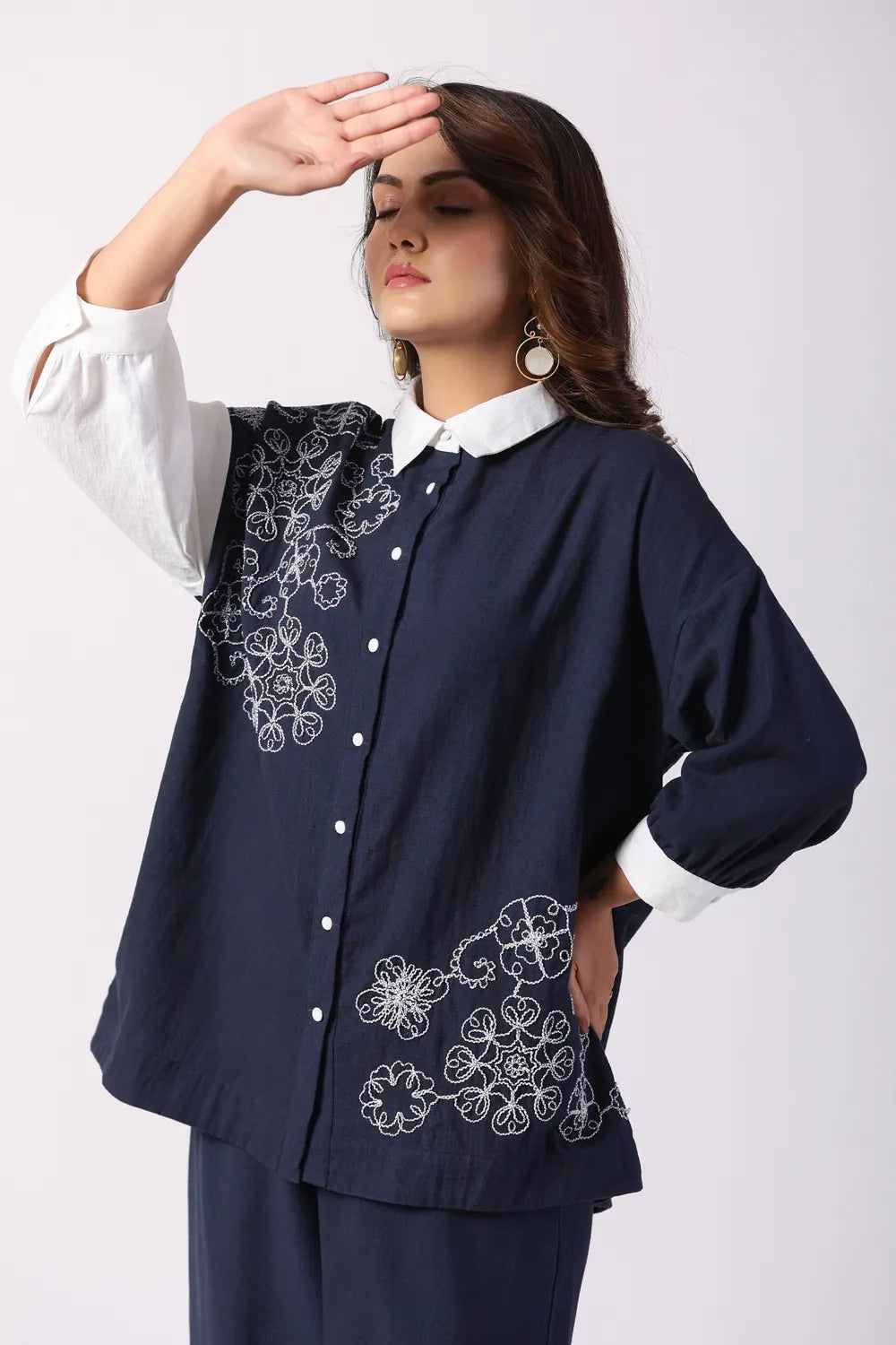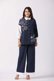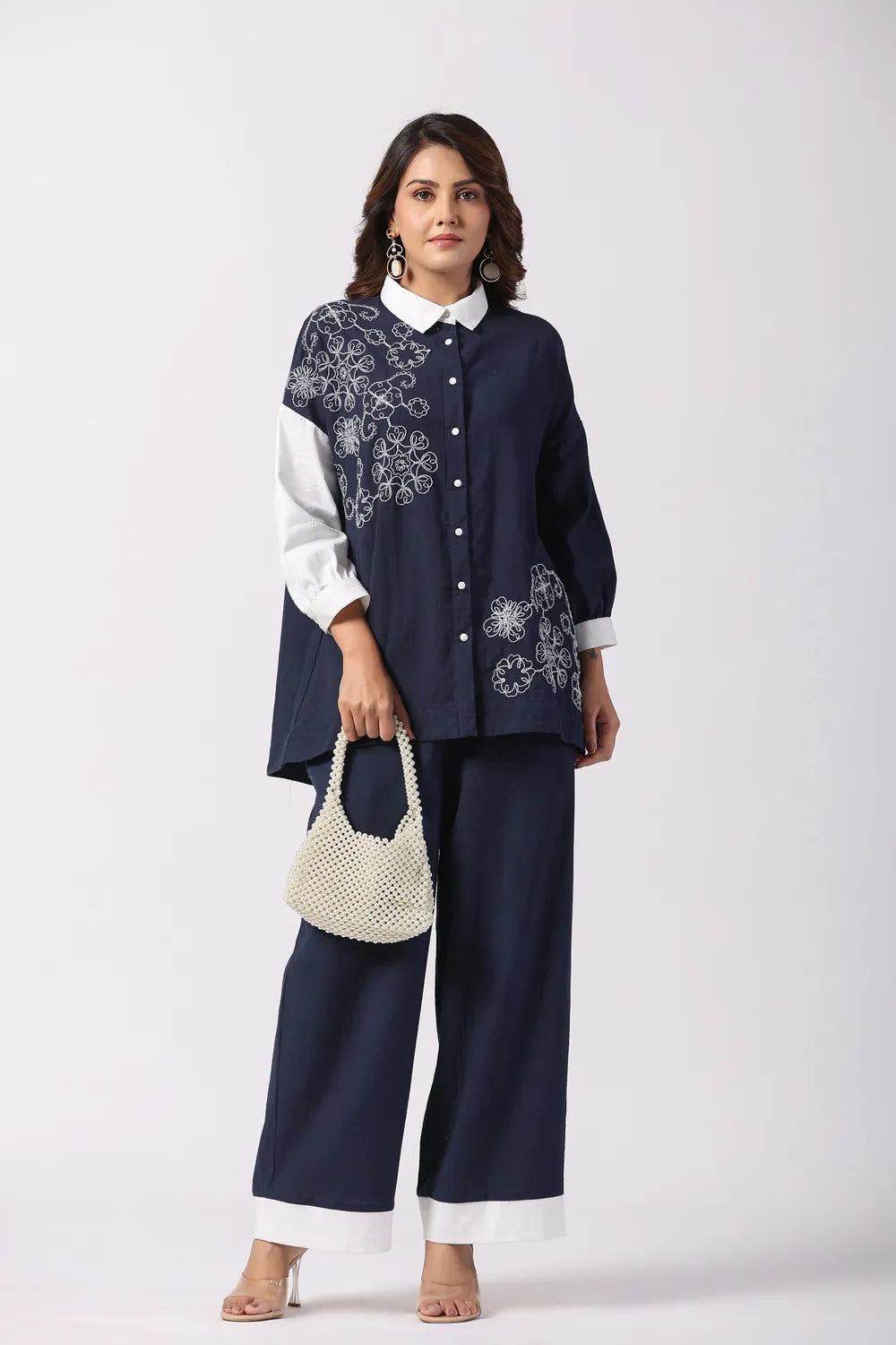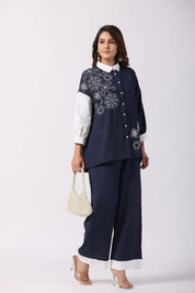 Effortlessly stylish, the Navy Blue & White Embroidered Cotton Co-Ord Set combines modern elegance with breathable comfort. Crafted from premium cotton fabric, this set features a cord-embroidered shirt and coordinated relaxed-fit trousers, making it a perfect blend of sophistication and ease.