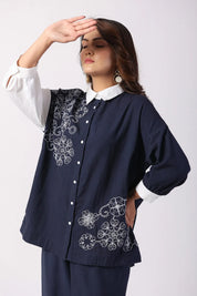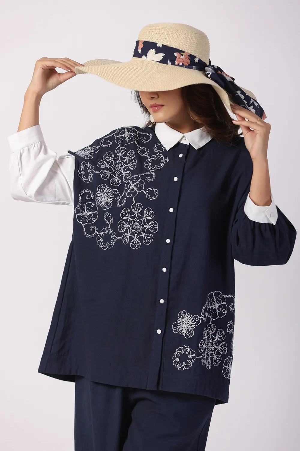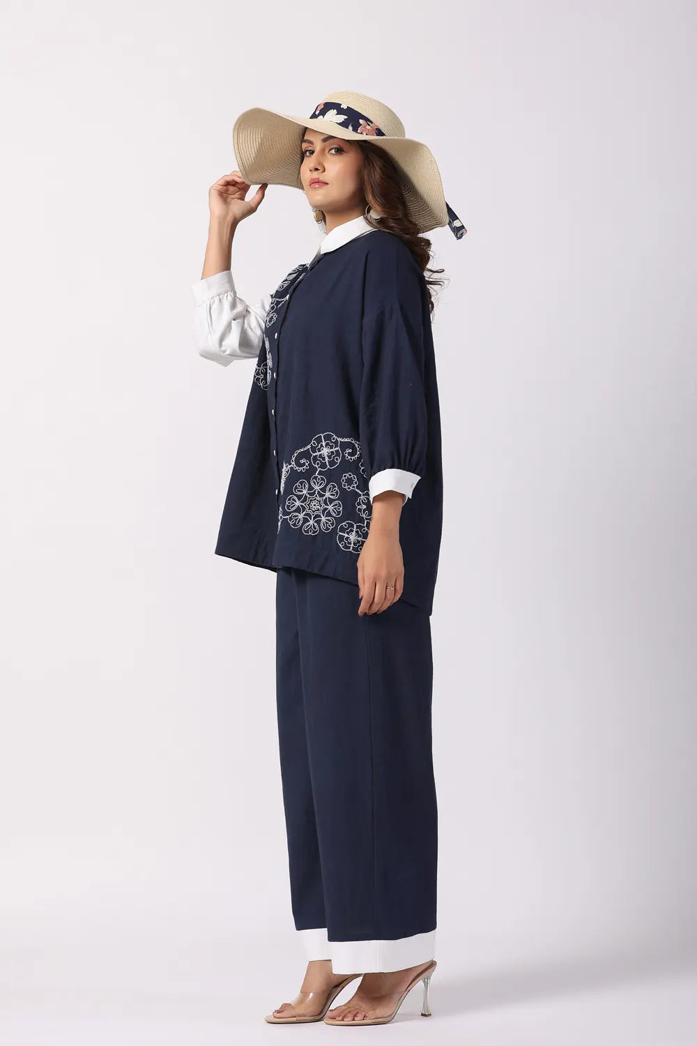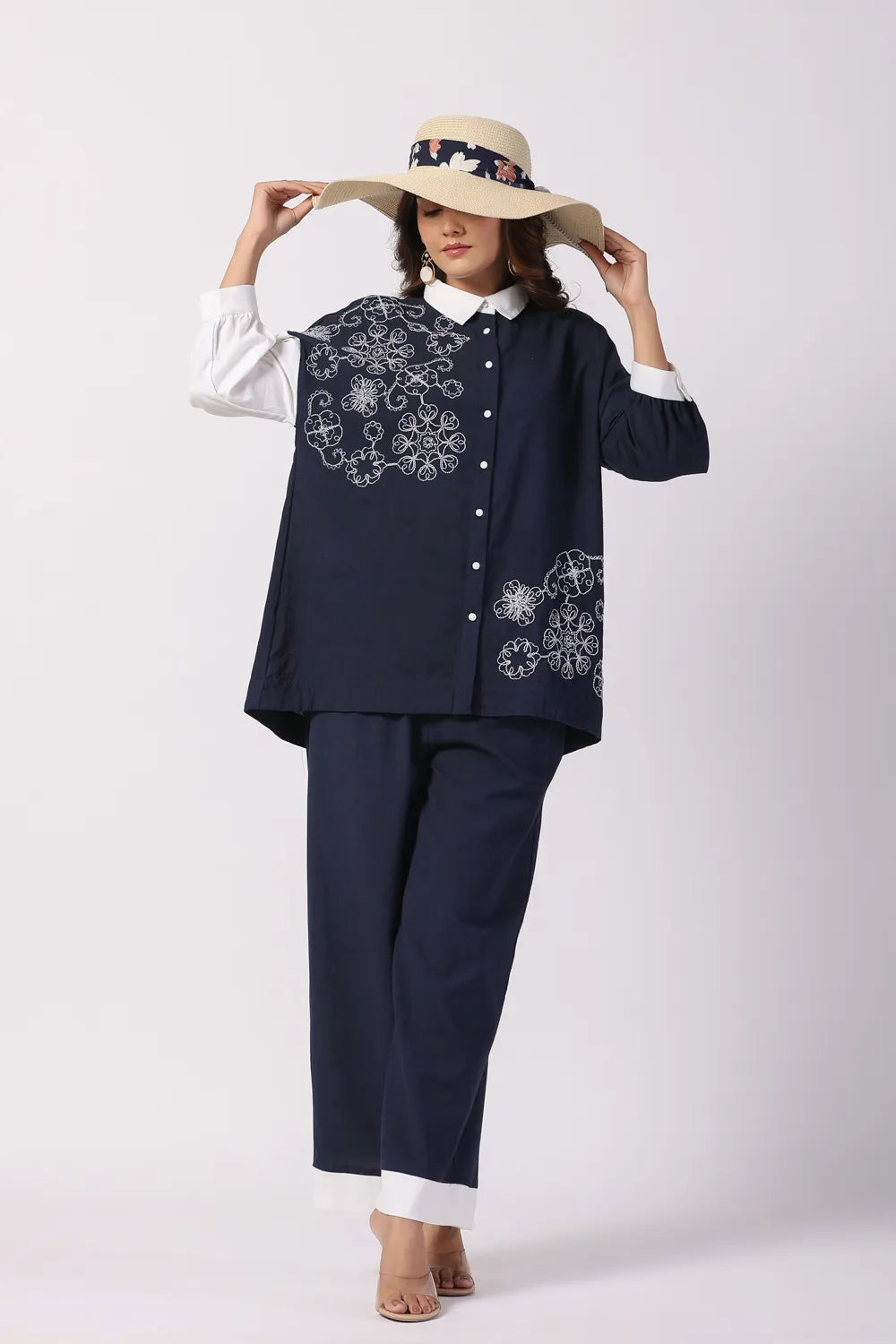 Navy Blue & White Embroidered Cotton Co-Ord Set
