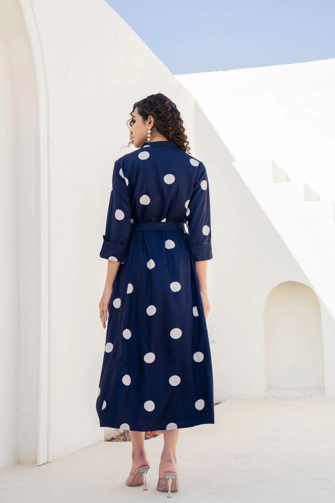 Playful Chic: Navy Polka Dot Belted Midi Dress in Viscose