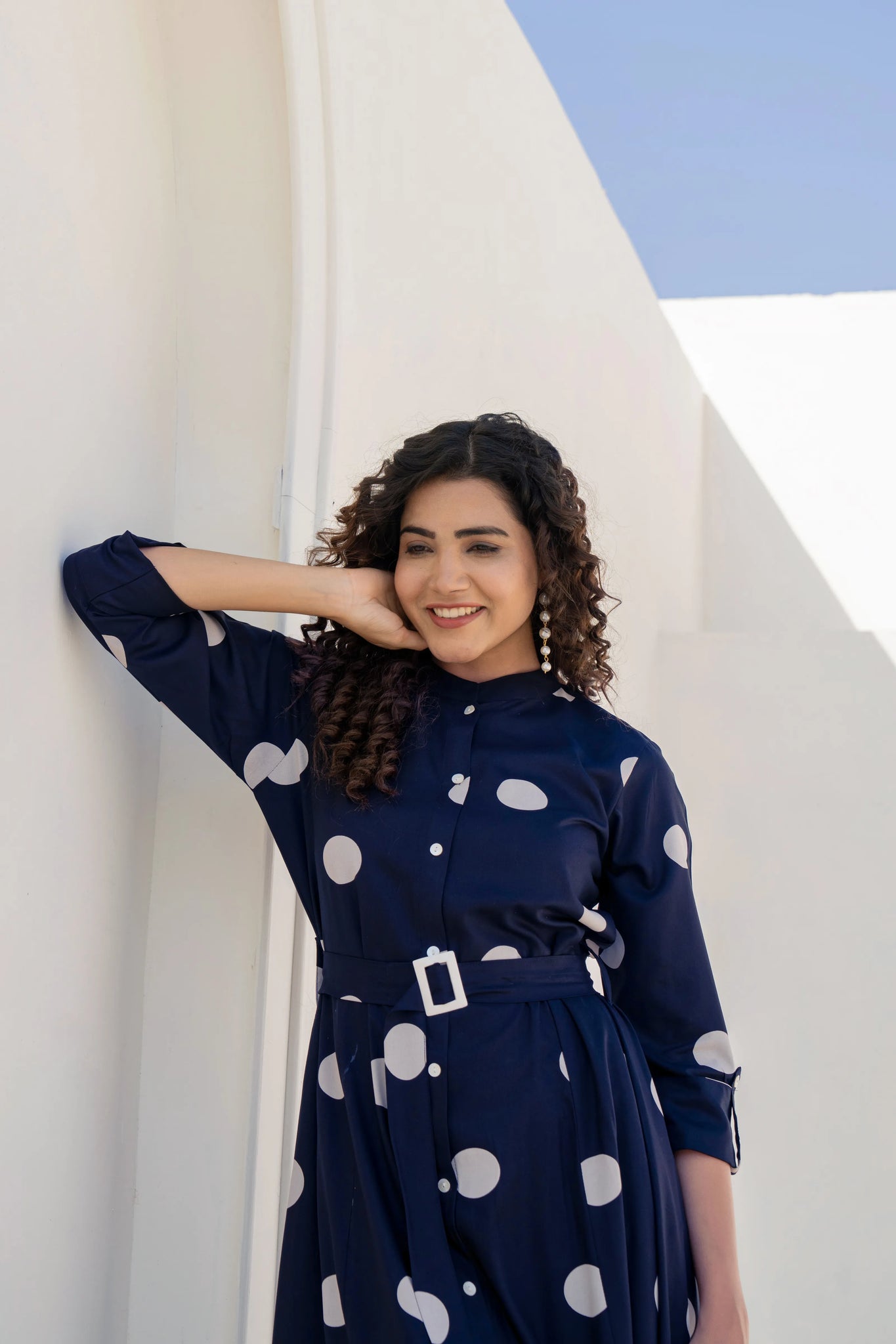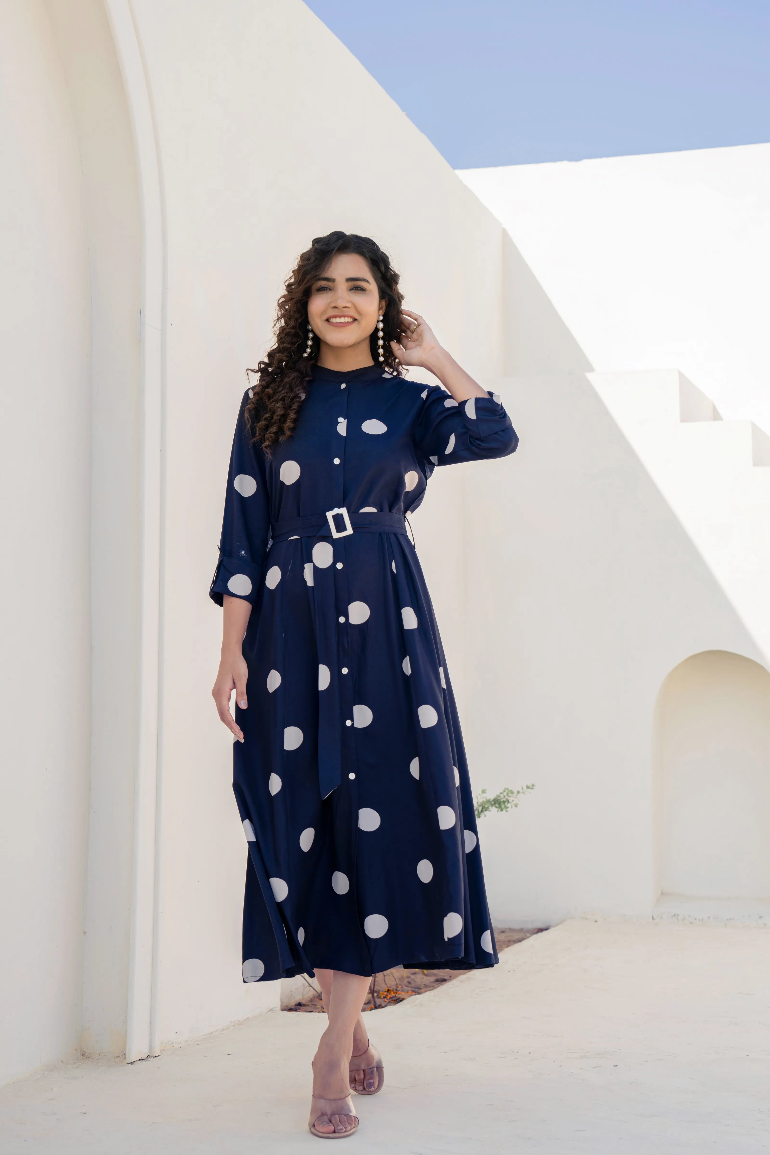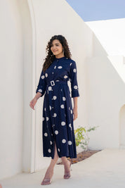 Step into timeless elegance with a playful twist in our Playful Chic midi dress. This navy blue stunner features oversized white polka dots and a flattering flared silhouette, blending retro vibes with everyday sophistication. The belted waist with a buckle detail adds structure, while side pockets offer practicality with polish.