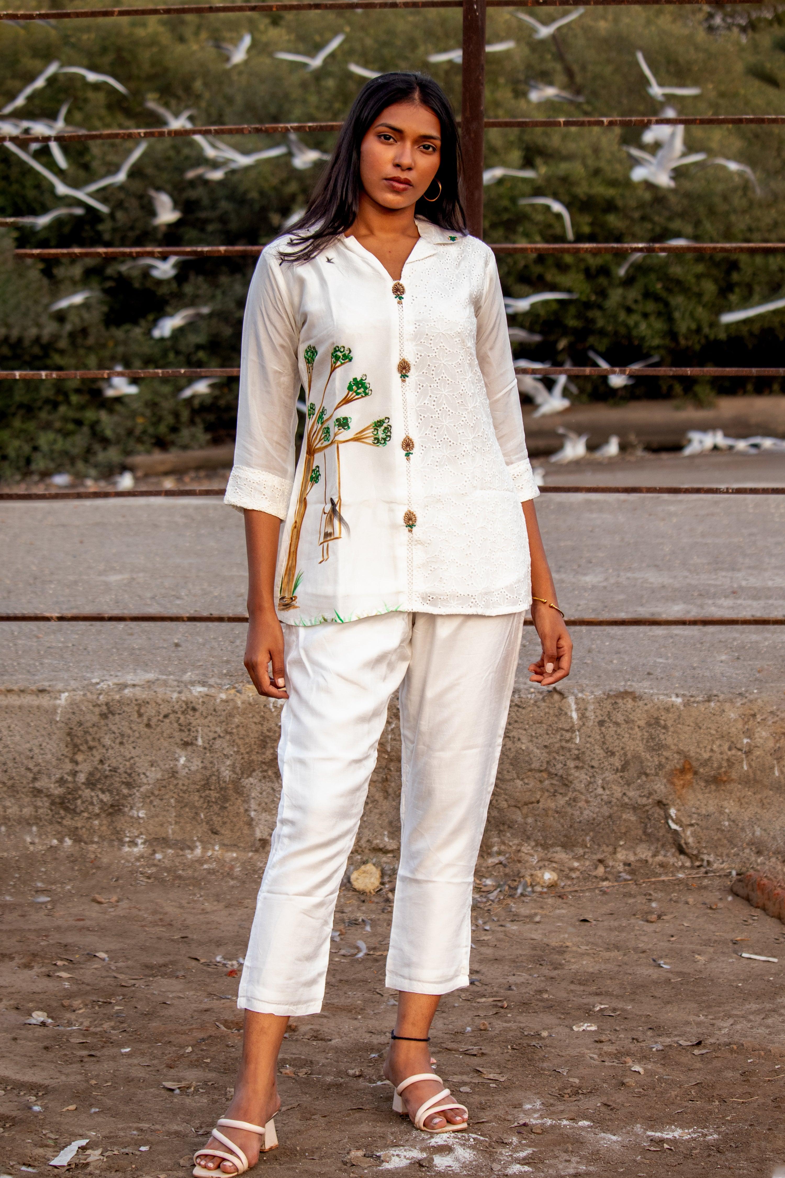 Hand-Painted White Co-Ord Set: Artful Elegance