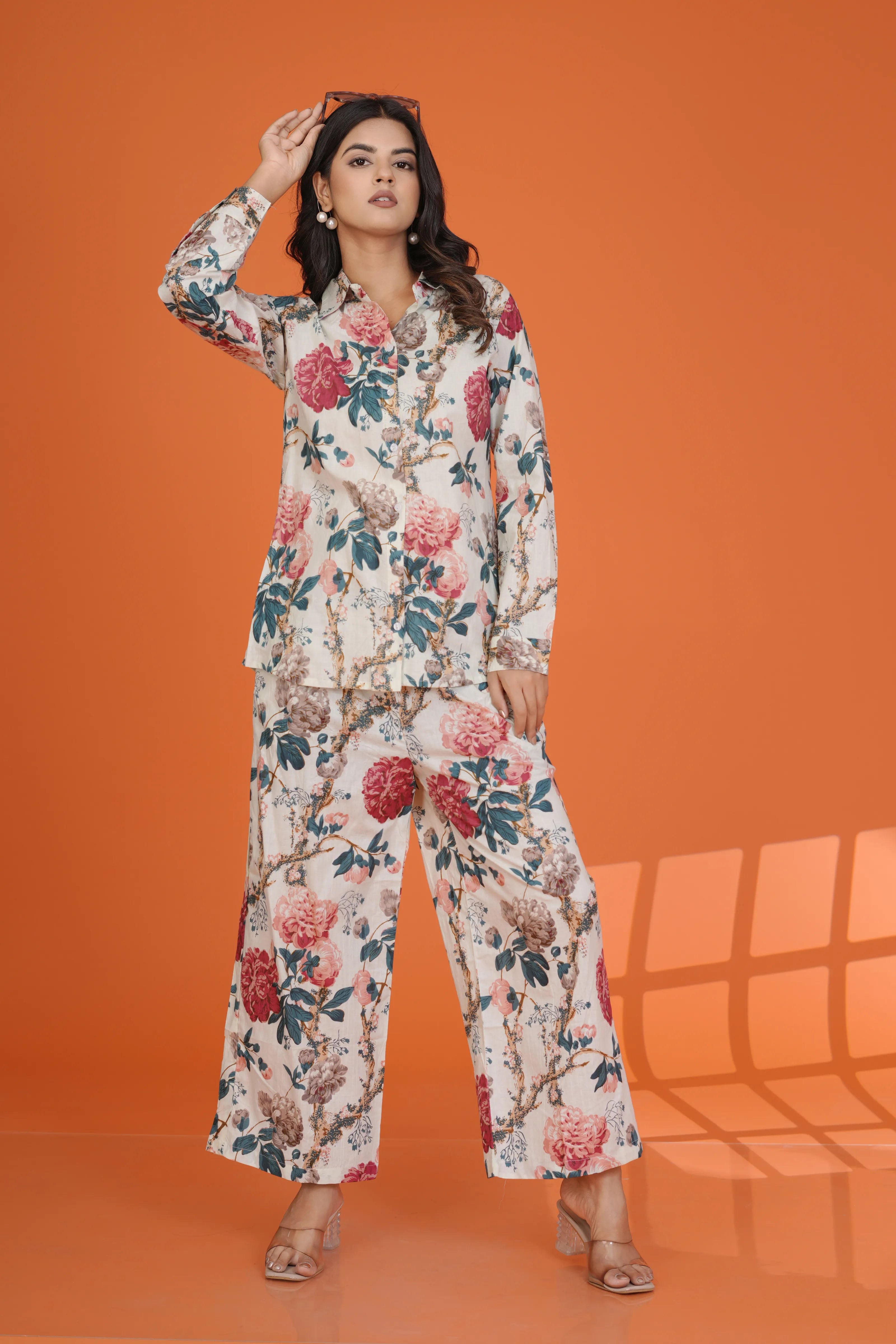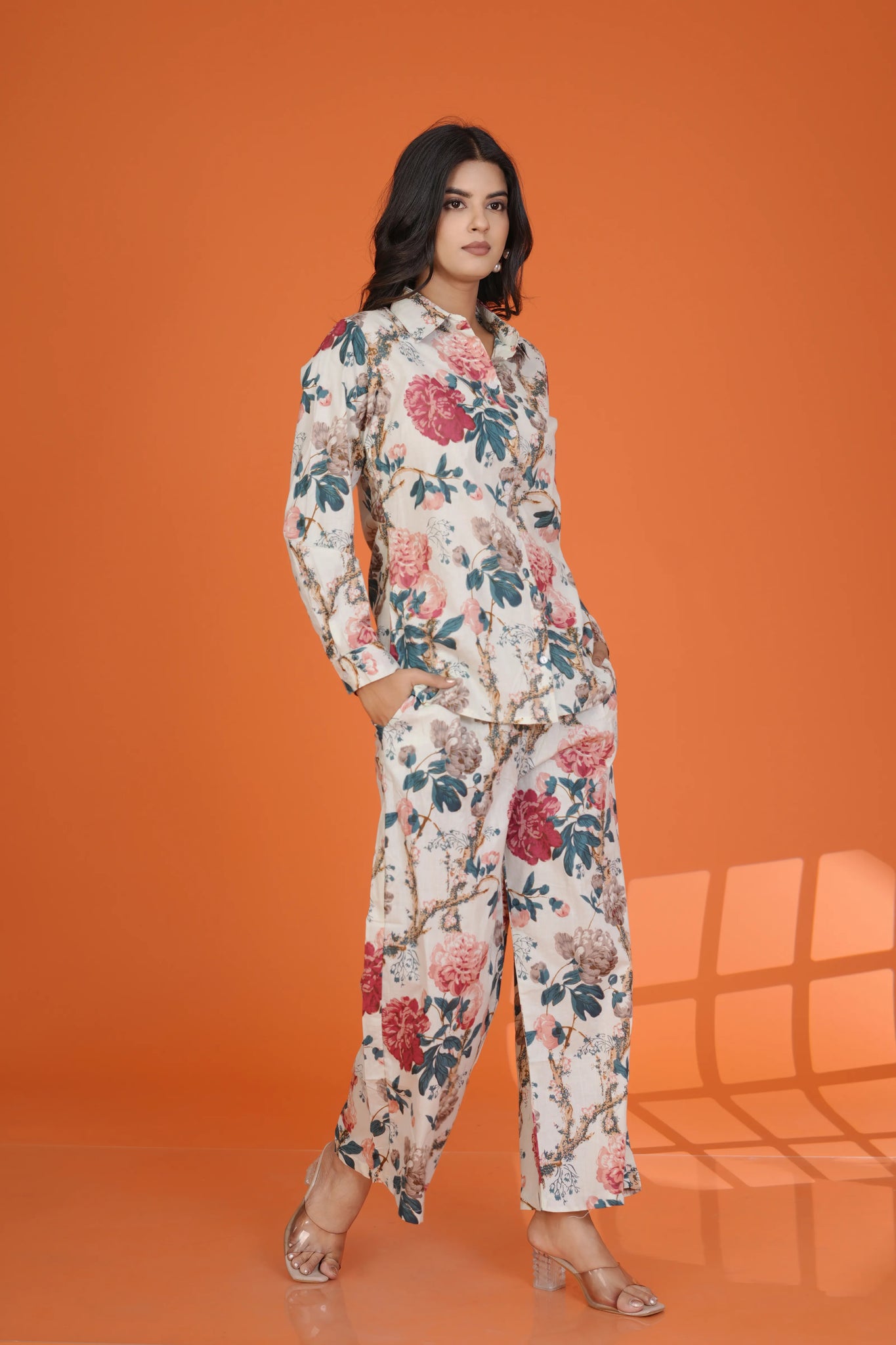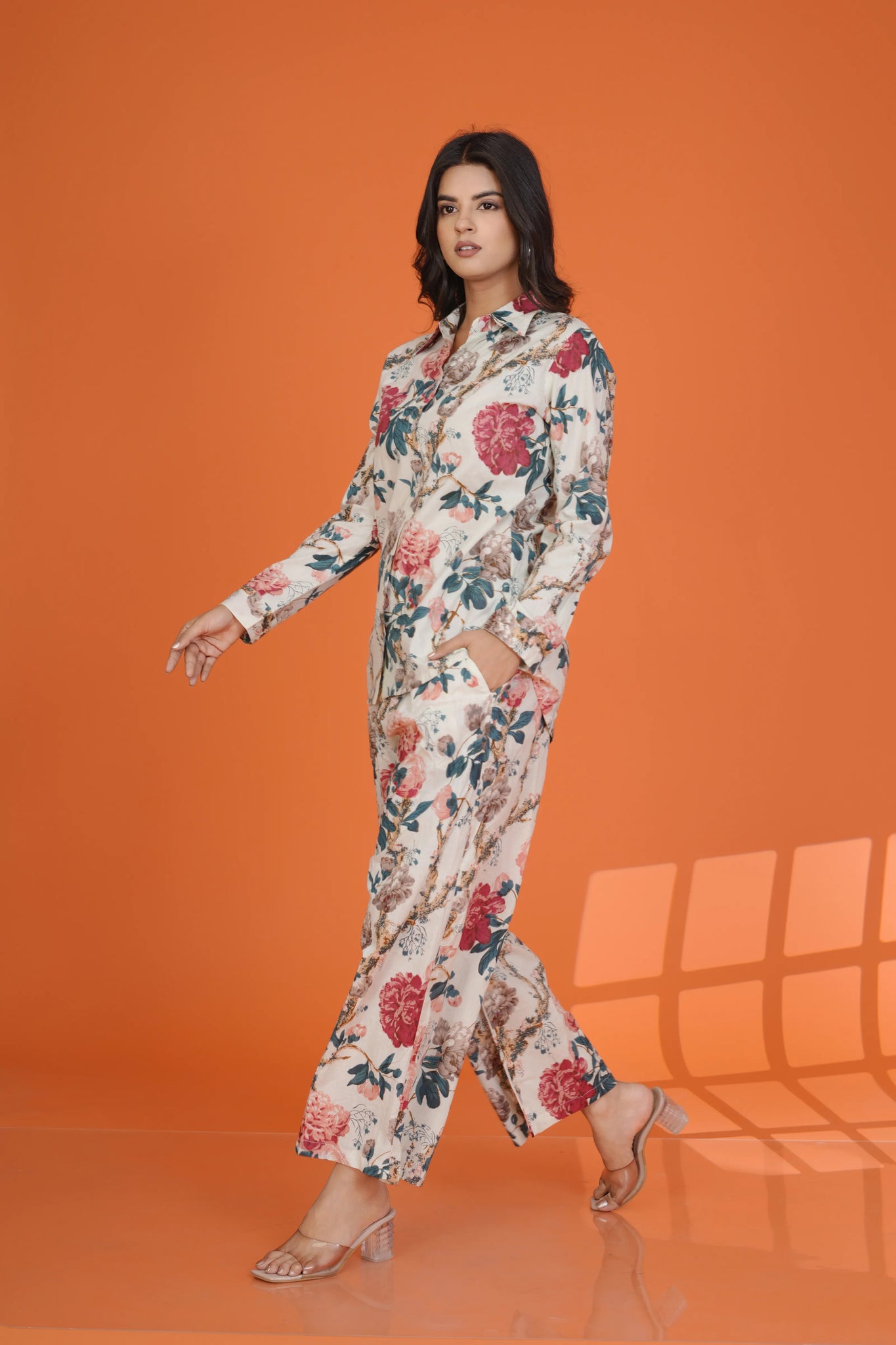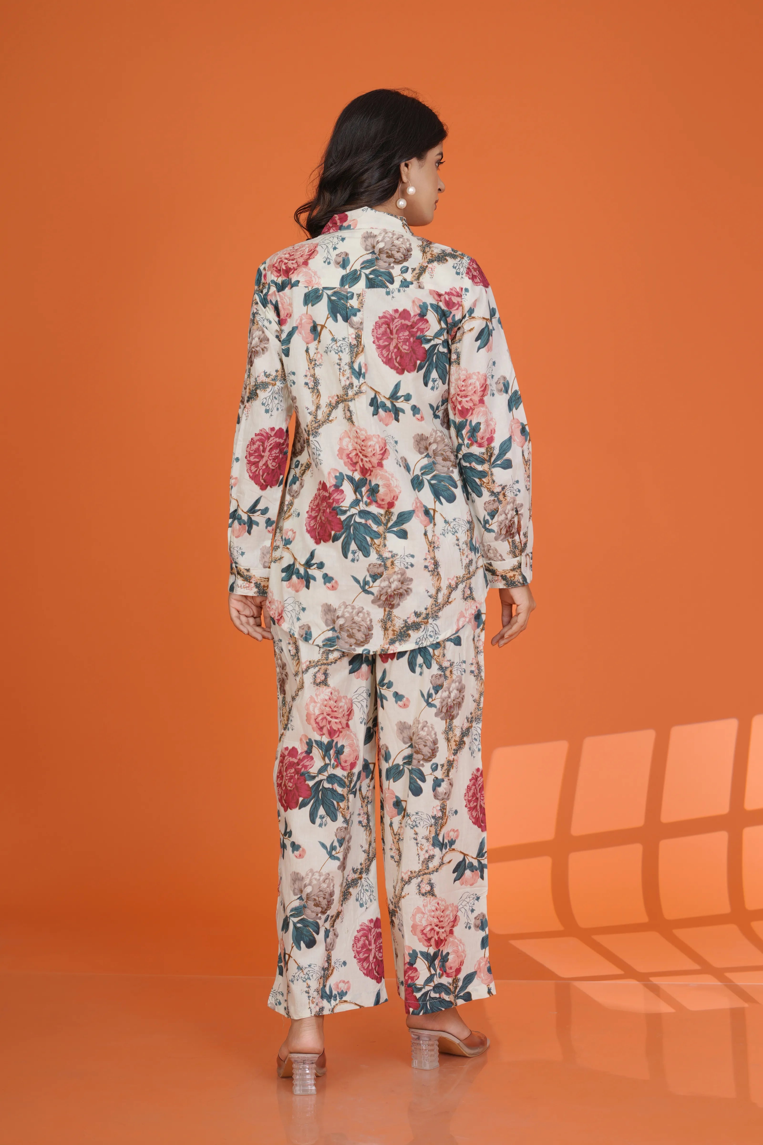 Bloom Statement: Off-White Bold Floral Printed Co-Ord Set in Cotton Cambric