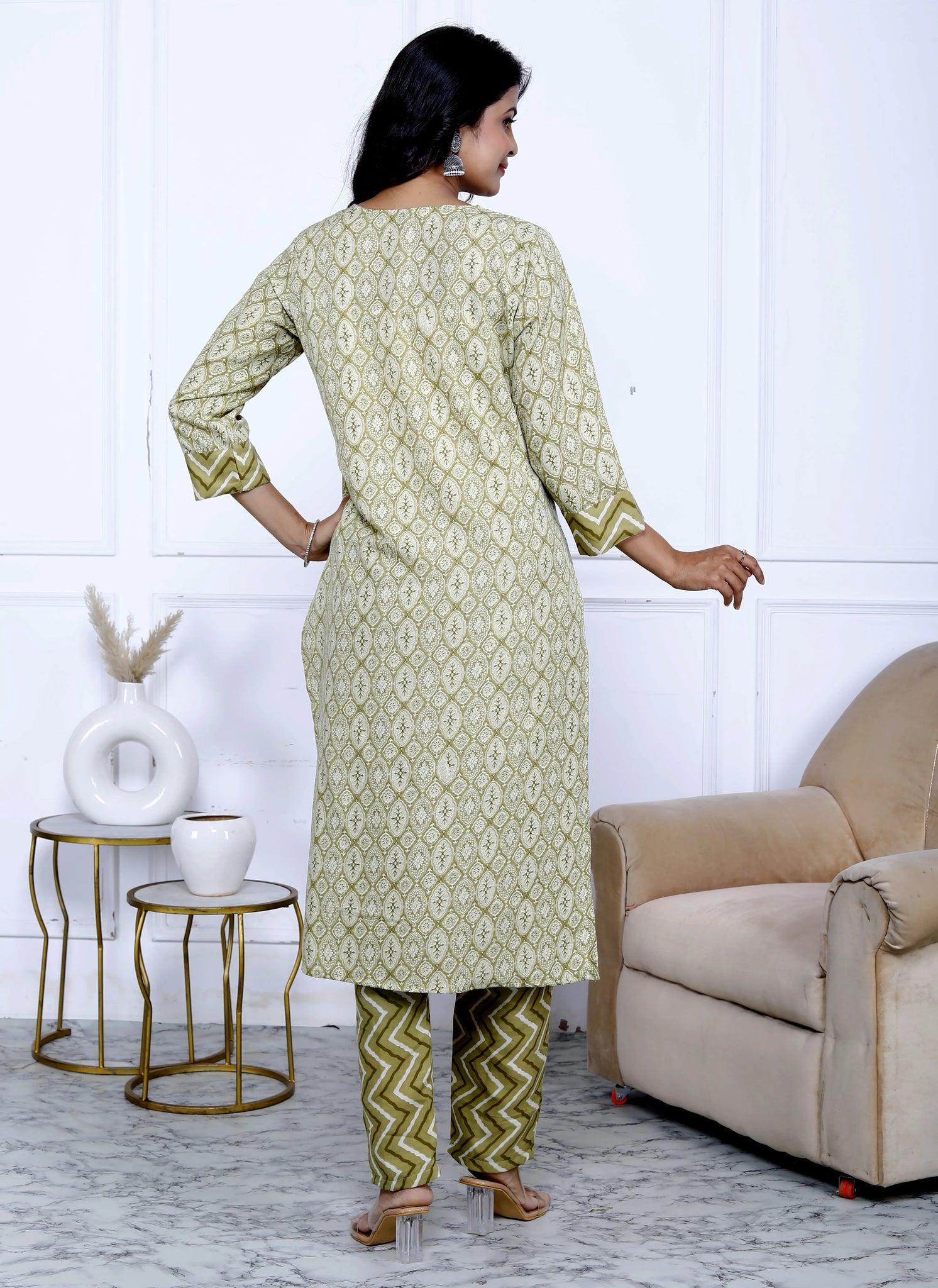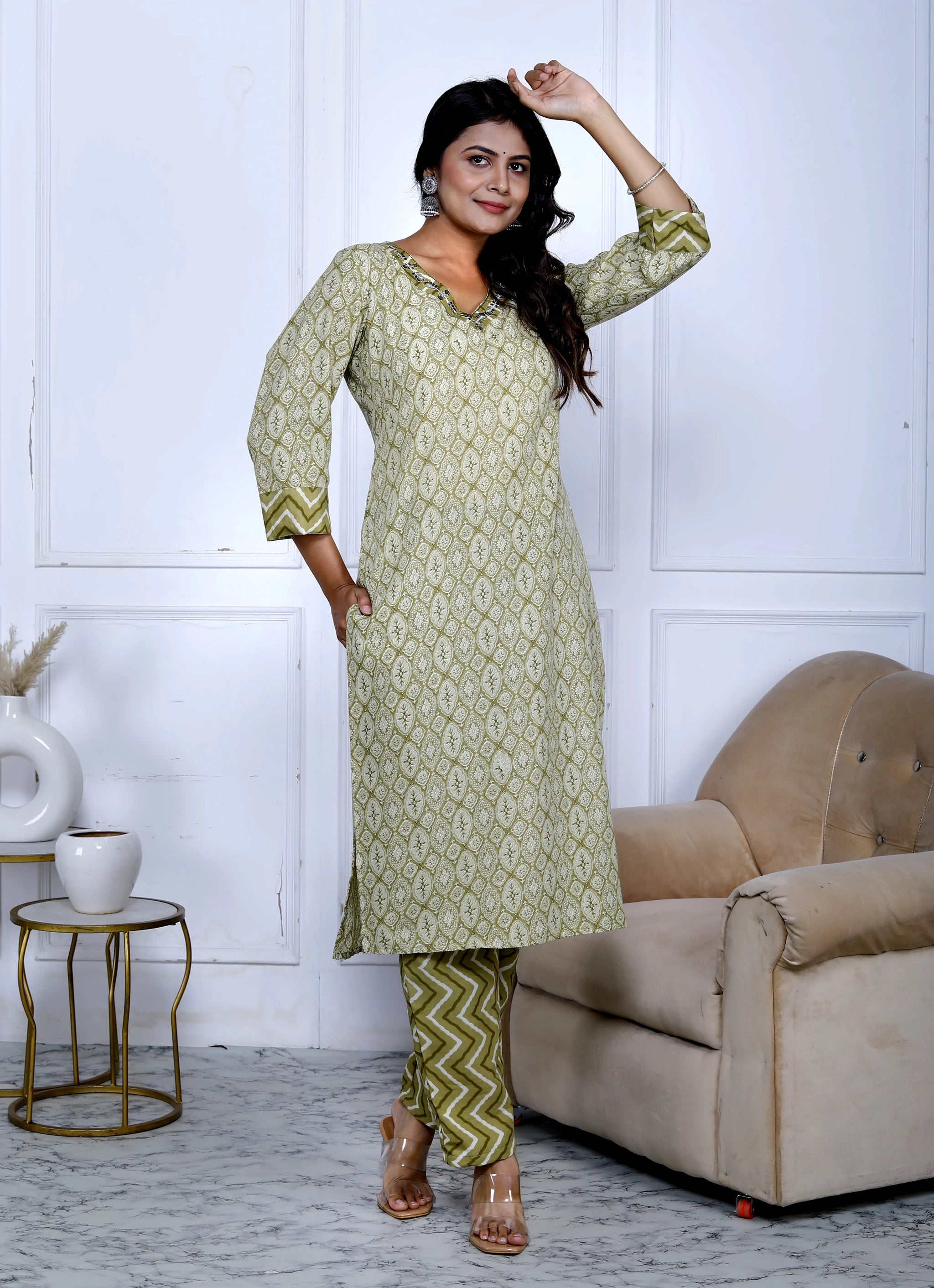 Perfect for any occasion, this Oregano Green Botanical Print Embroidered Cotton Ethnic Set offers a refreshing blend of tradition and contemporary style.
