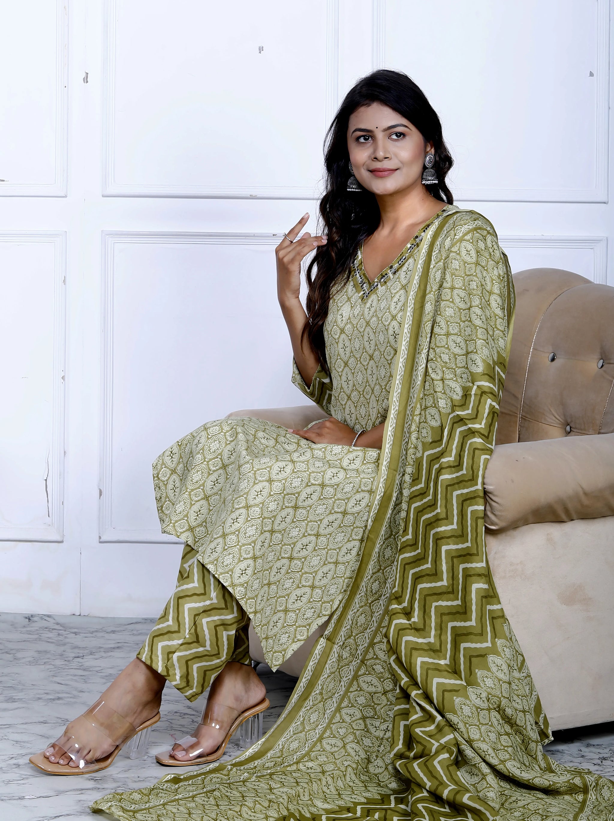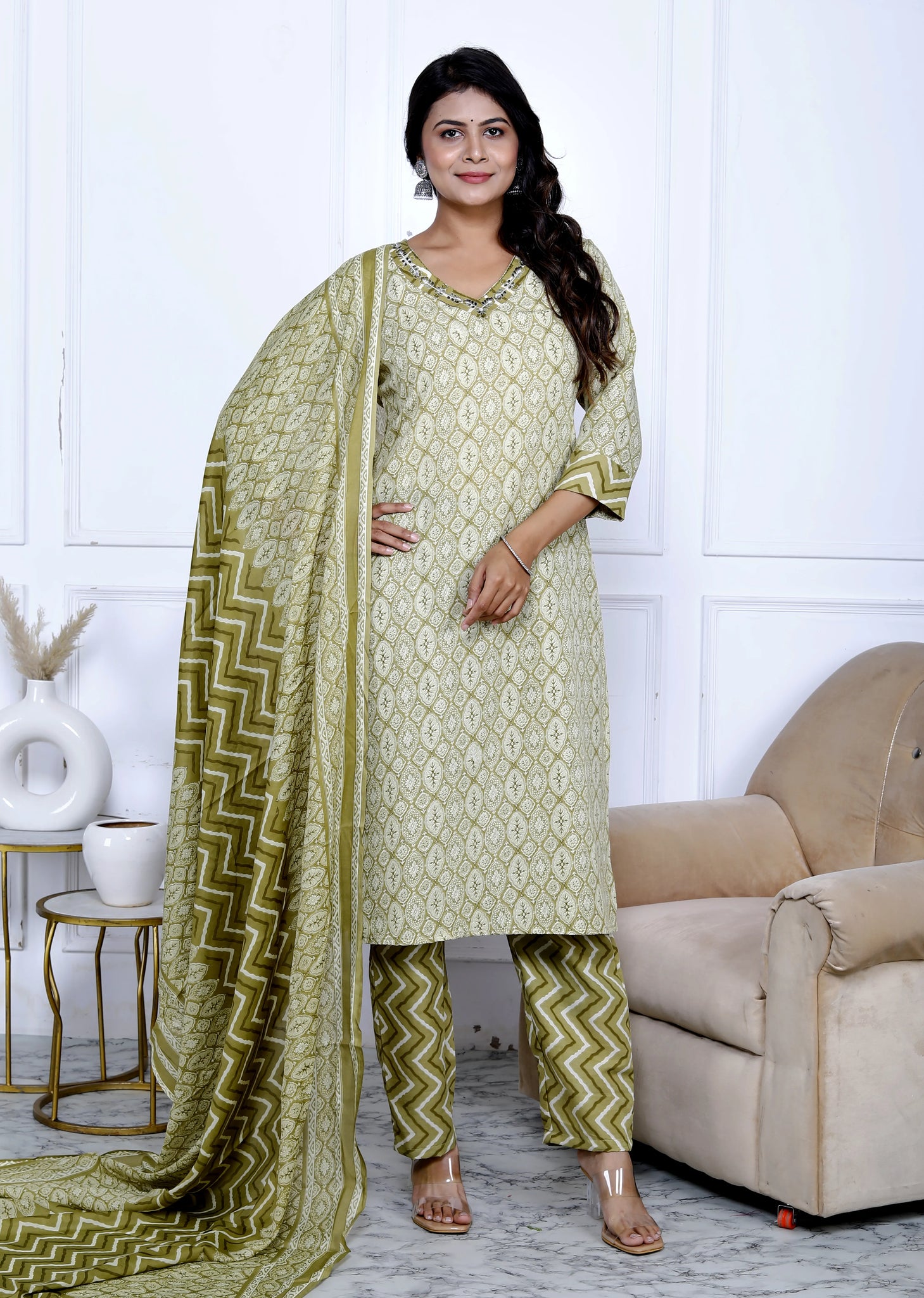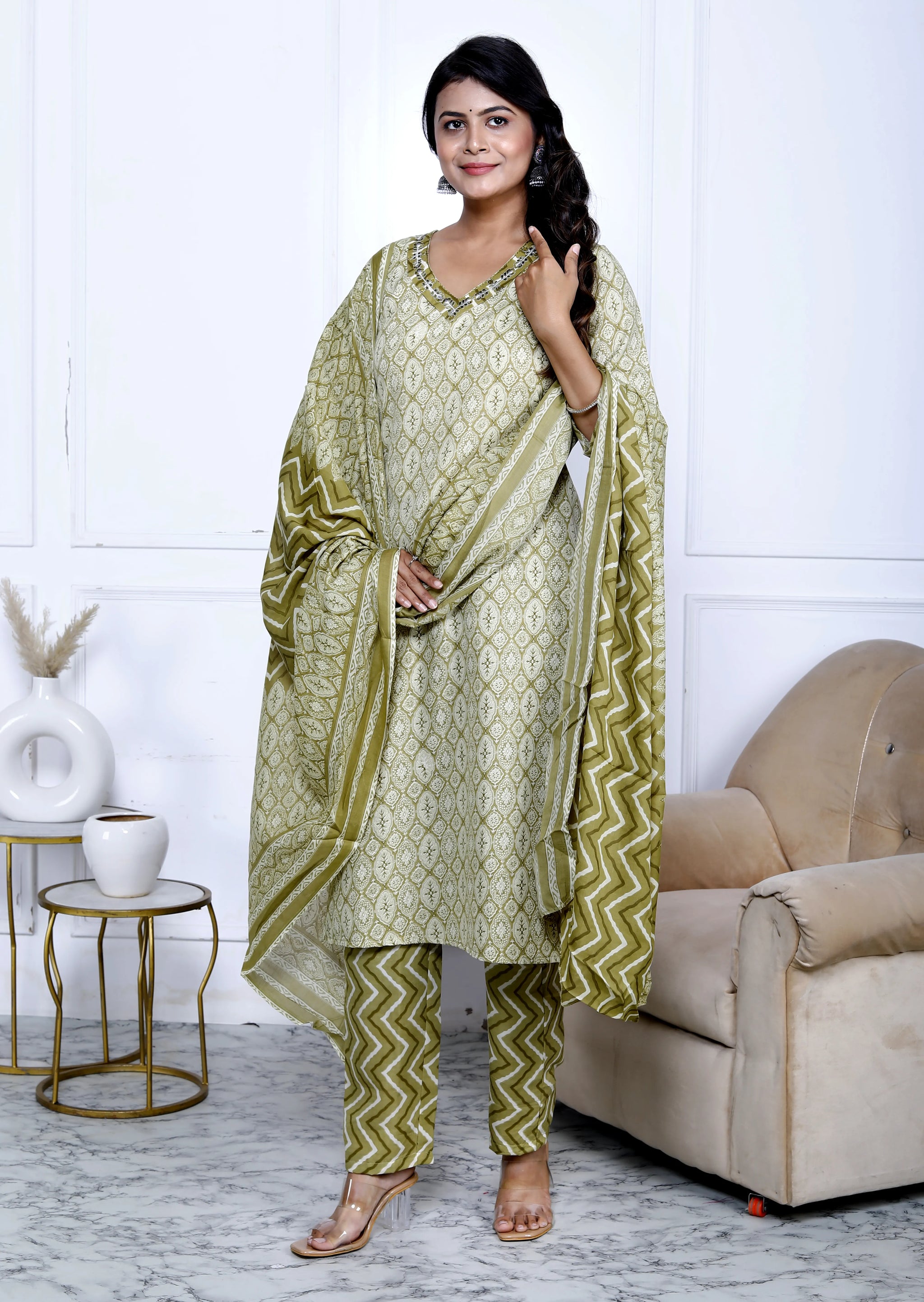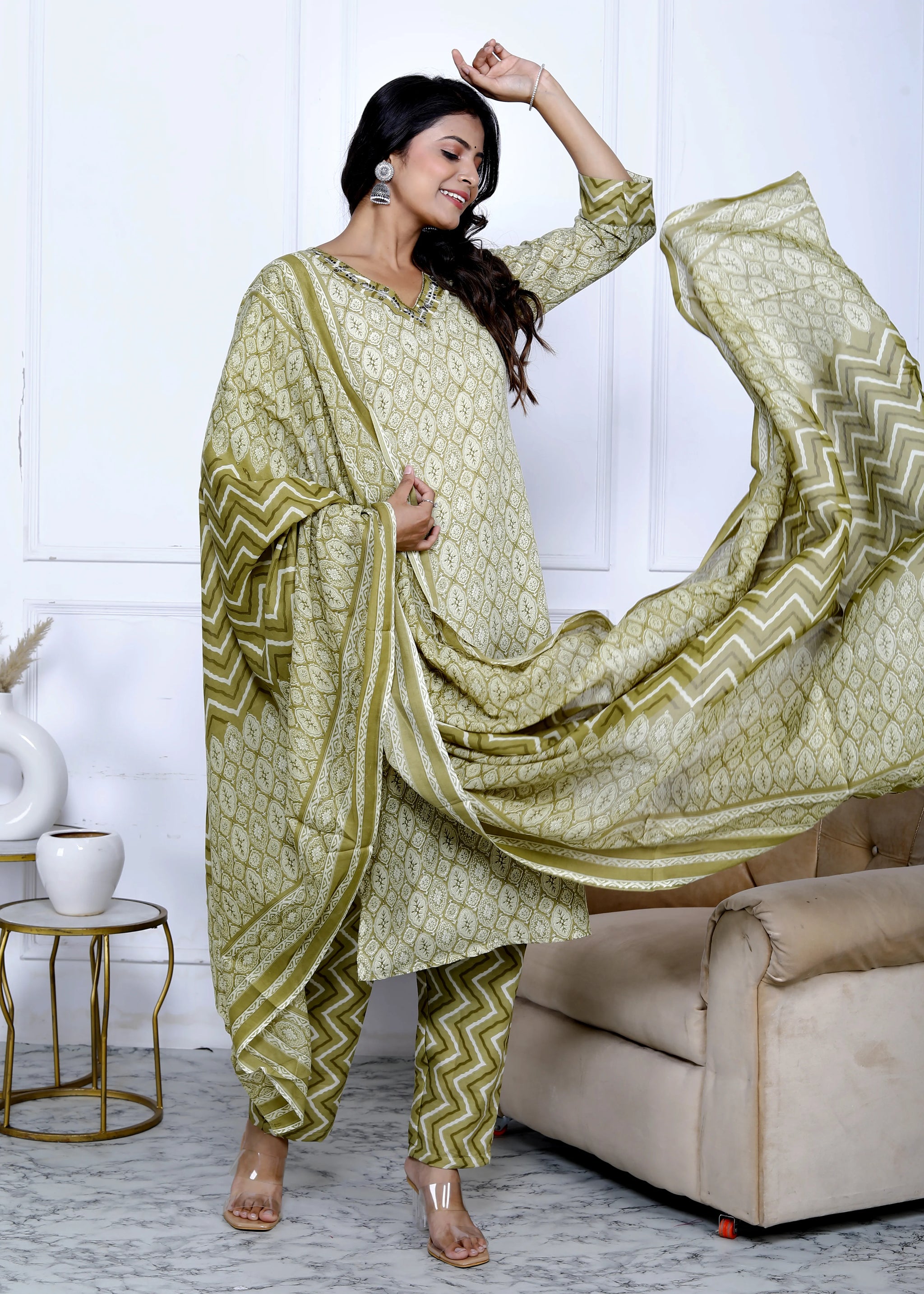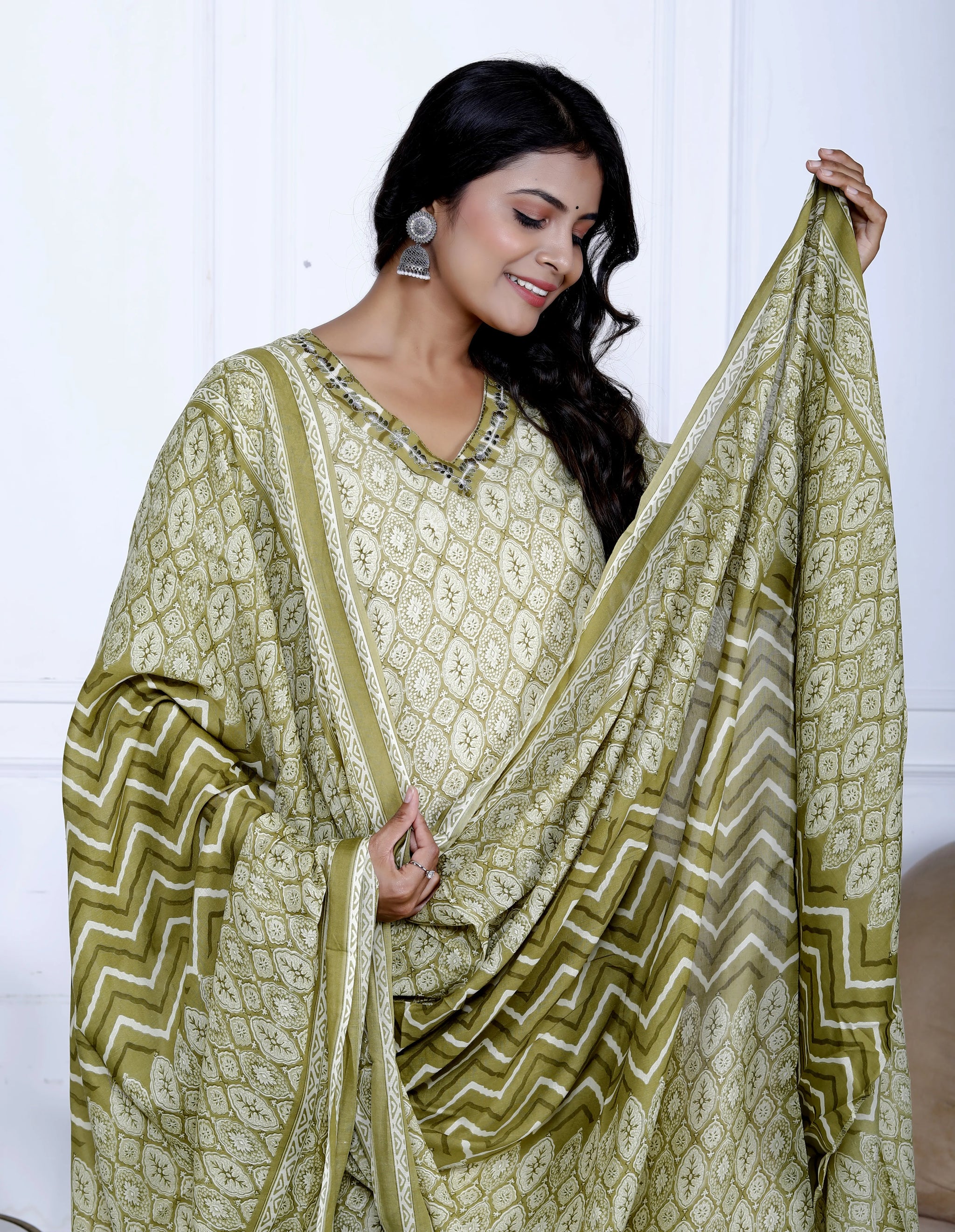 Oregano Green Botanical Print Embroidered Cotton Ethnic Set With Dupatta