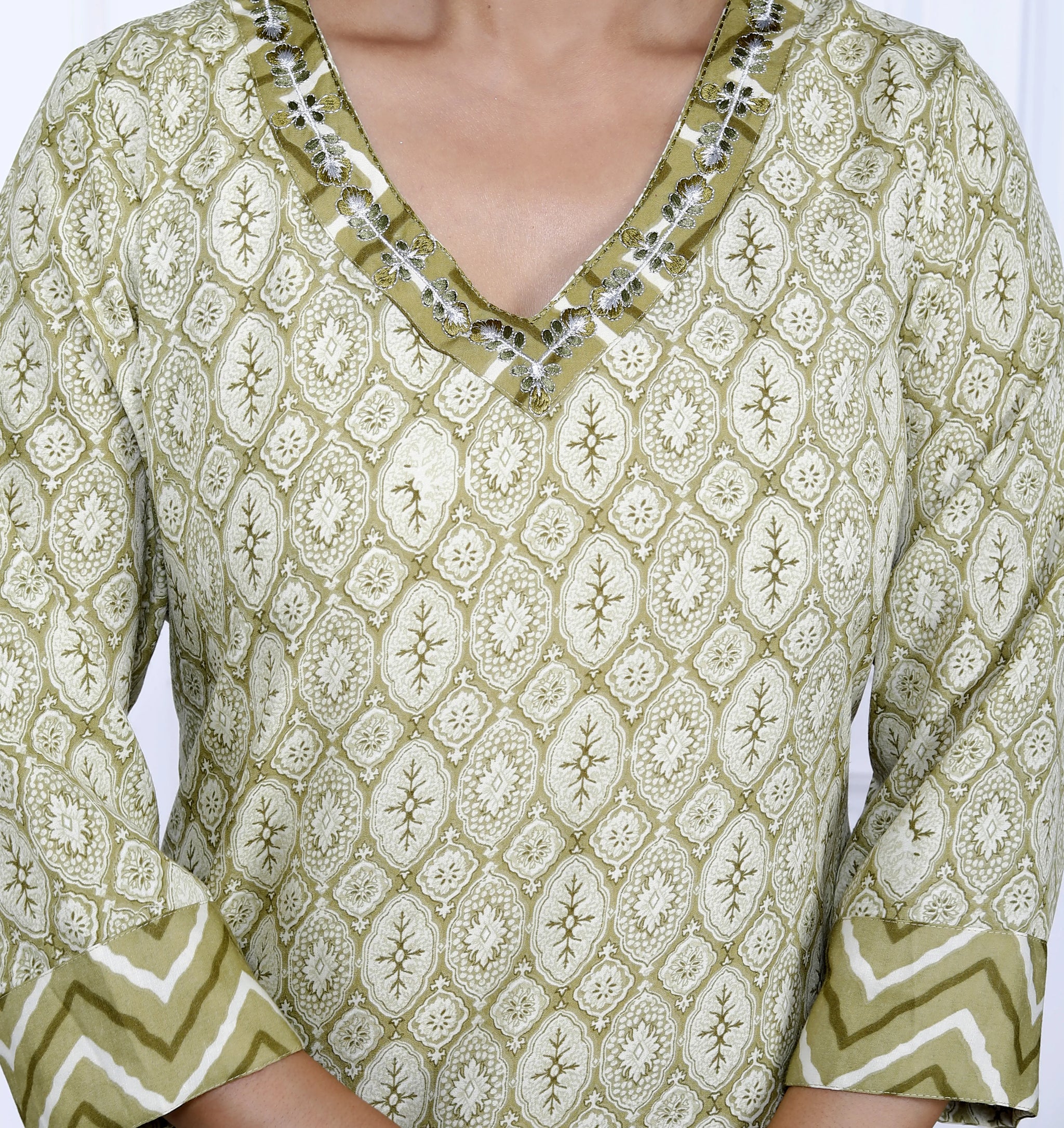Add a serene touch of elegance with this Oregano Green Botanical Print Embroidered Cotton Ethnic Set. The soft cotton fabric showcases a delicate botanical print, while the V-neck kurta is beautifully adorned with embroidery, offering a touch of subtle sophistication. Paired with comfortable matching pants and a complementary dupatta, this set strikes the perfect balance between comfort and style, making it ideal for both festive and casual occasions.