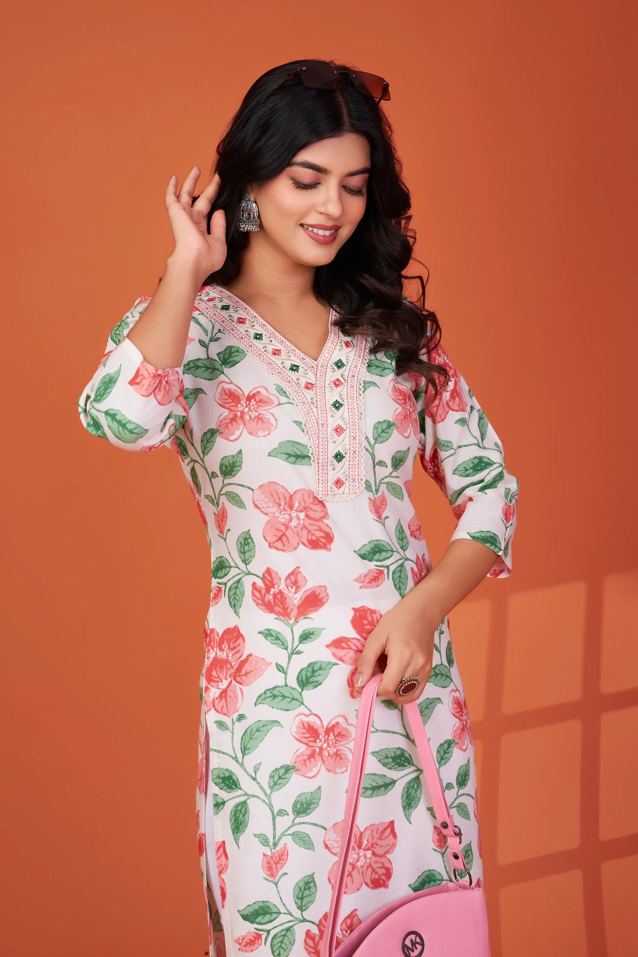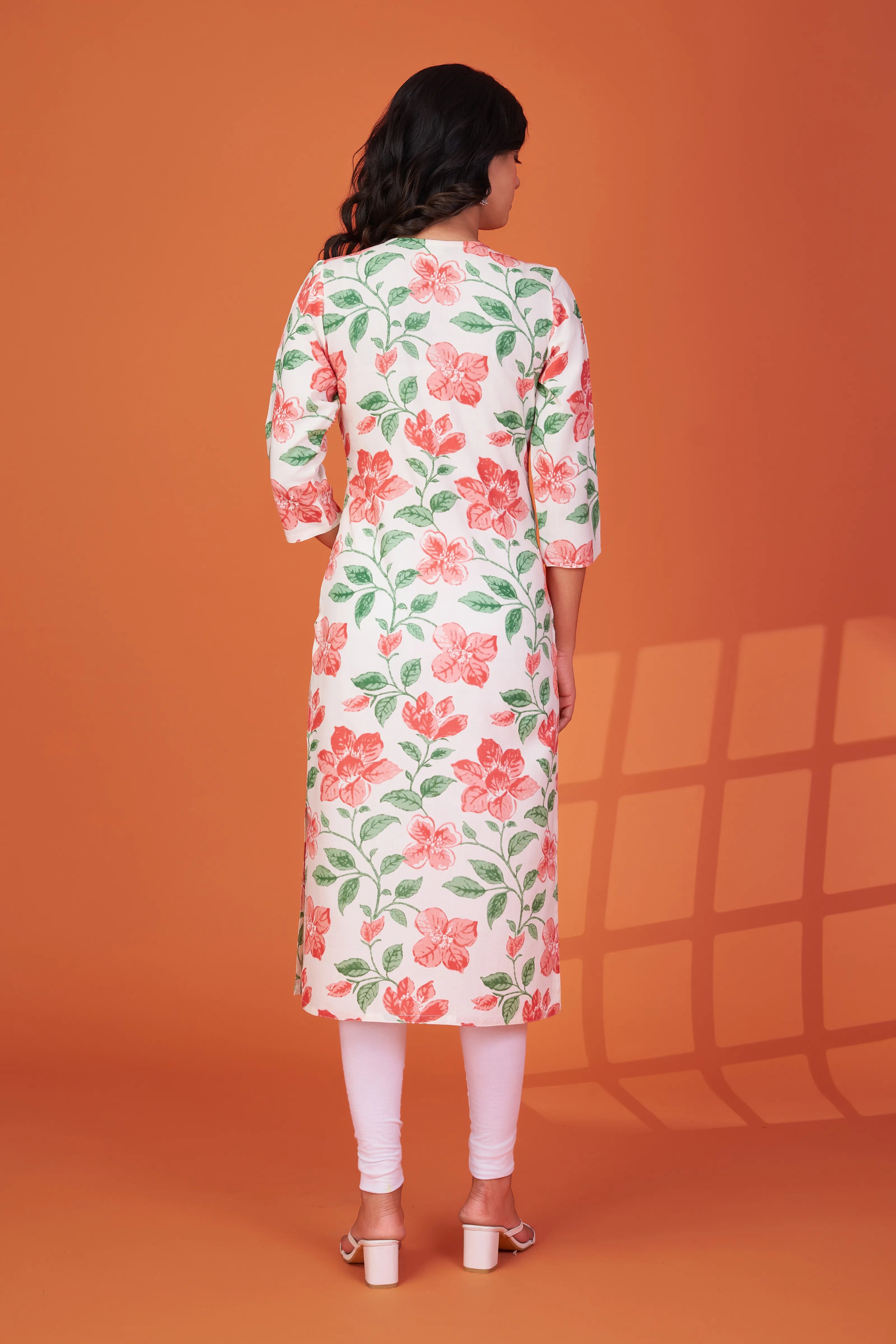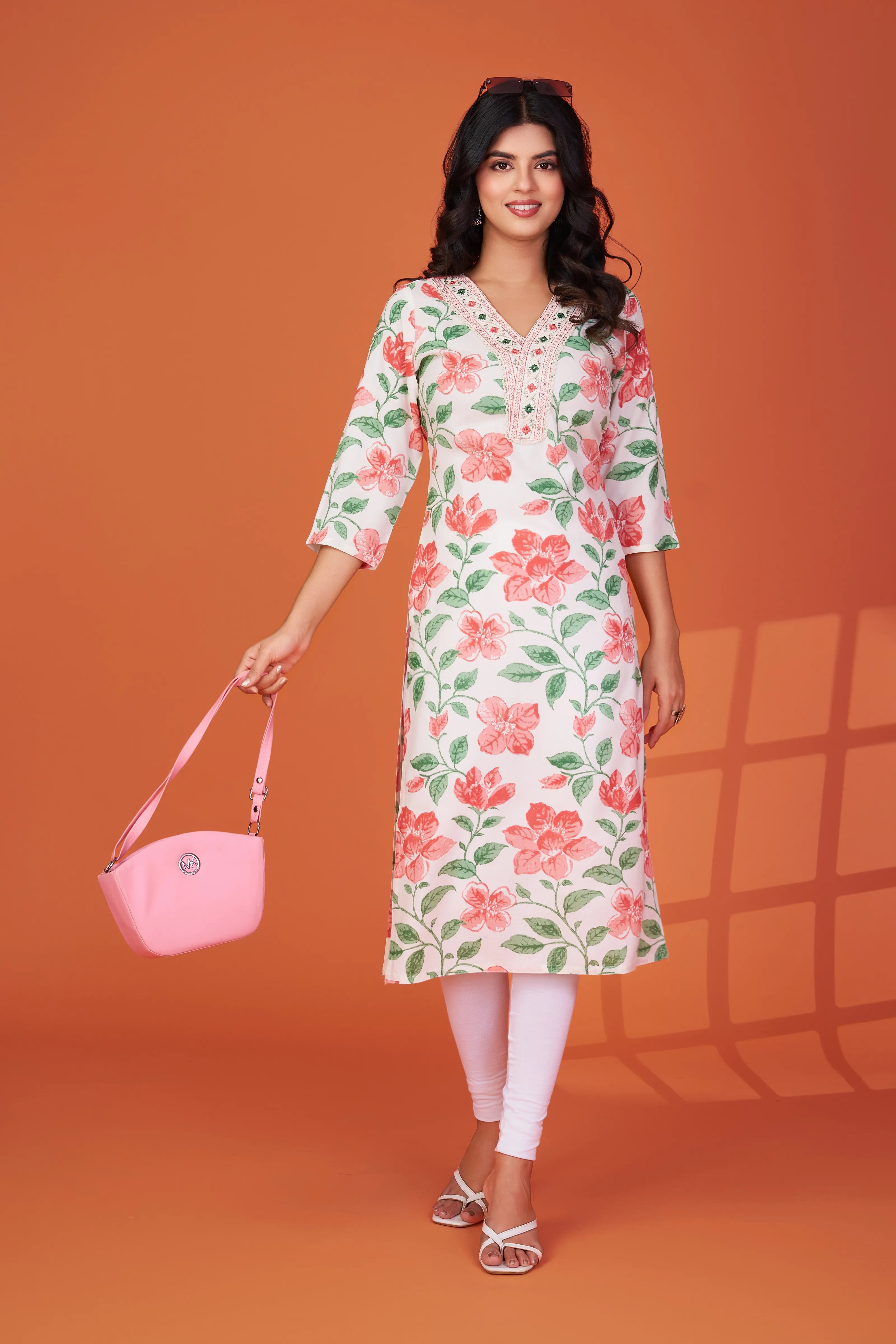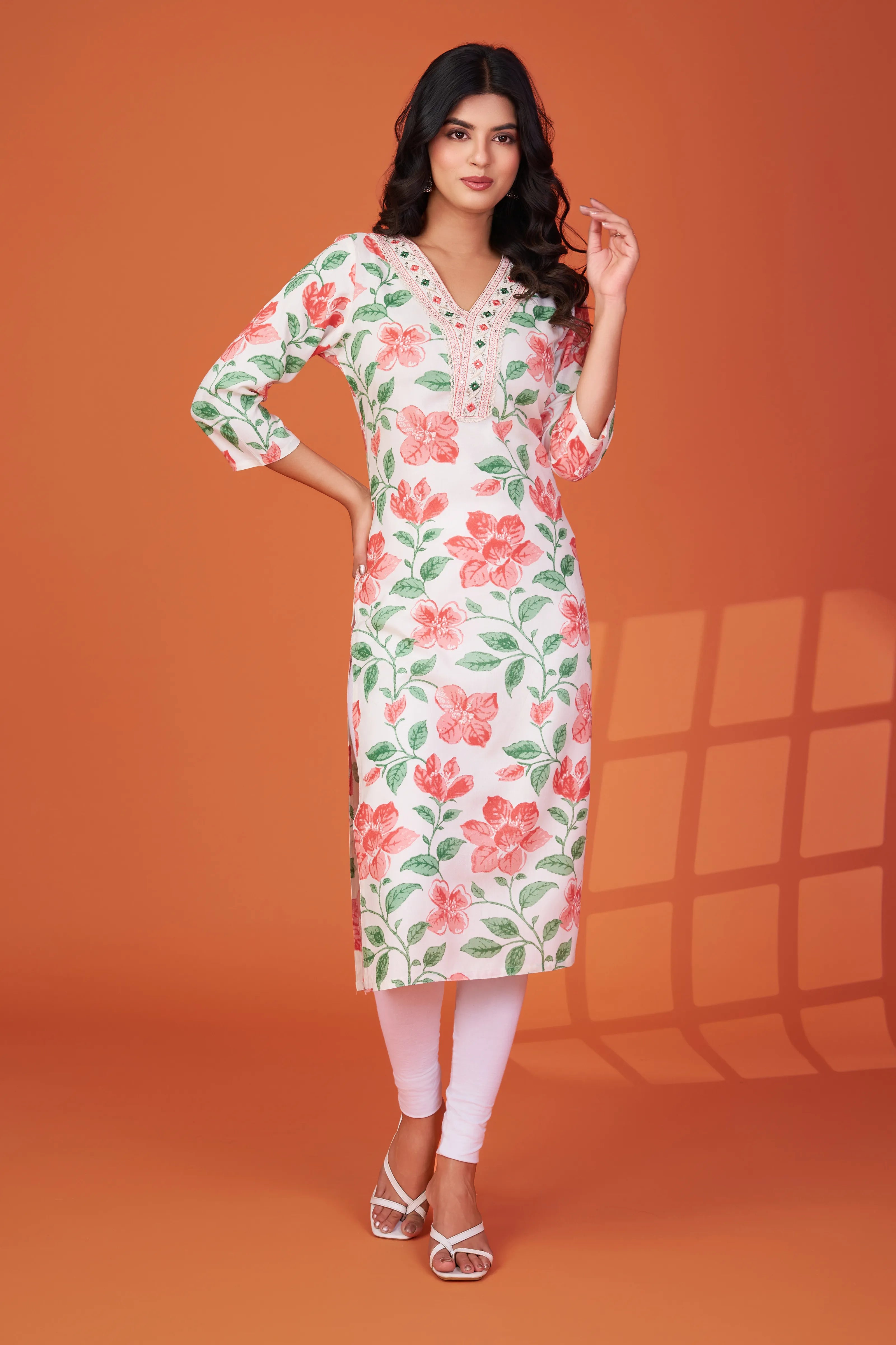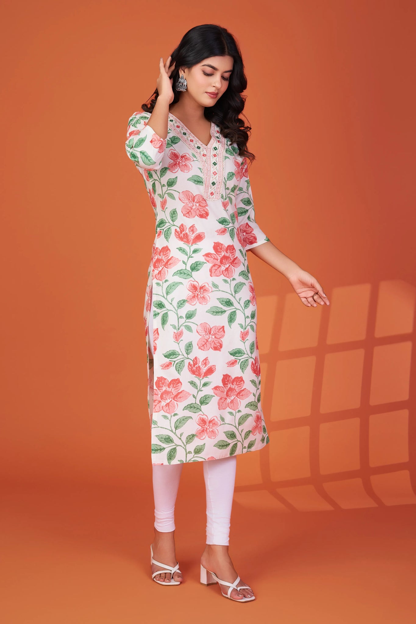Pair with white leggings or palazzos and minimal sandals. Add jhumkas or hoops and a sleek ponytail for a fresh, youthful finish.