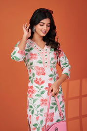Peach Bloom: Off-White Floral Printed & Embroidered Long Kurta in Viscose