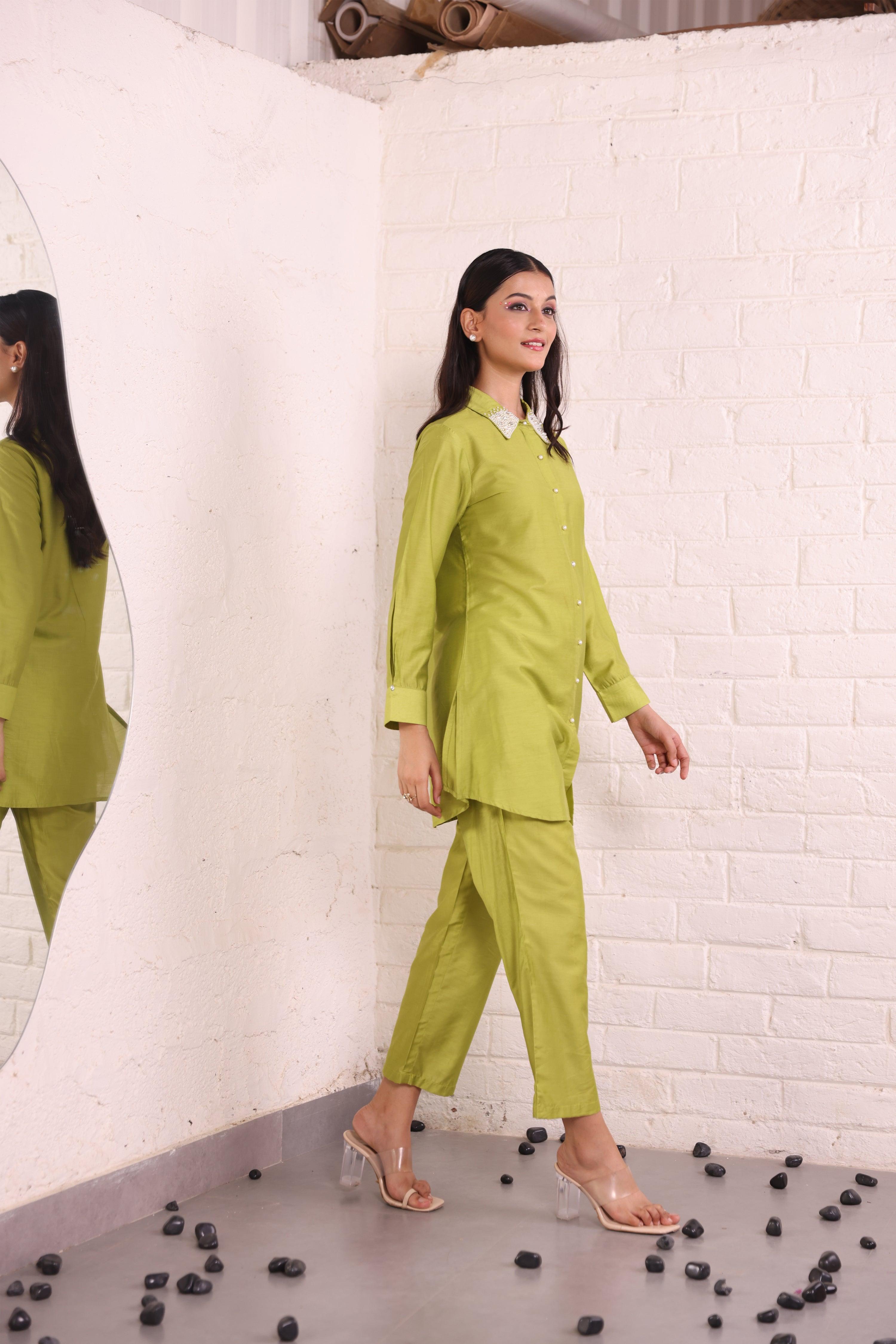 Pearl-Embellished Parrot Green Tunic and Trouser Co-Ord Set