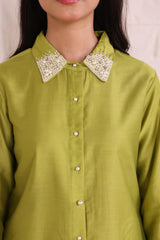 • Top: Shirt Collar, Relaxed Sleeves, Pearl Embellishments, Solid Parrot Green Color
