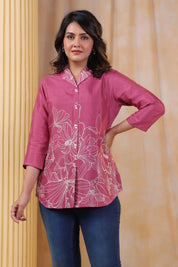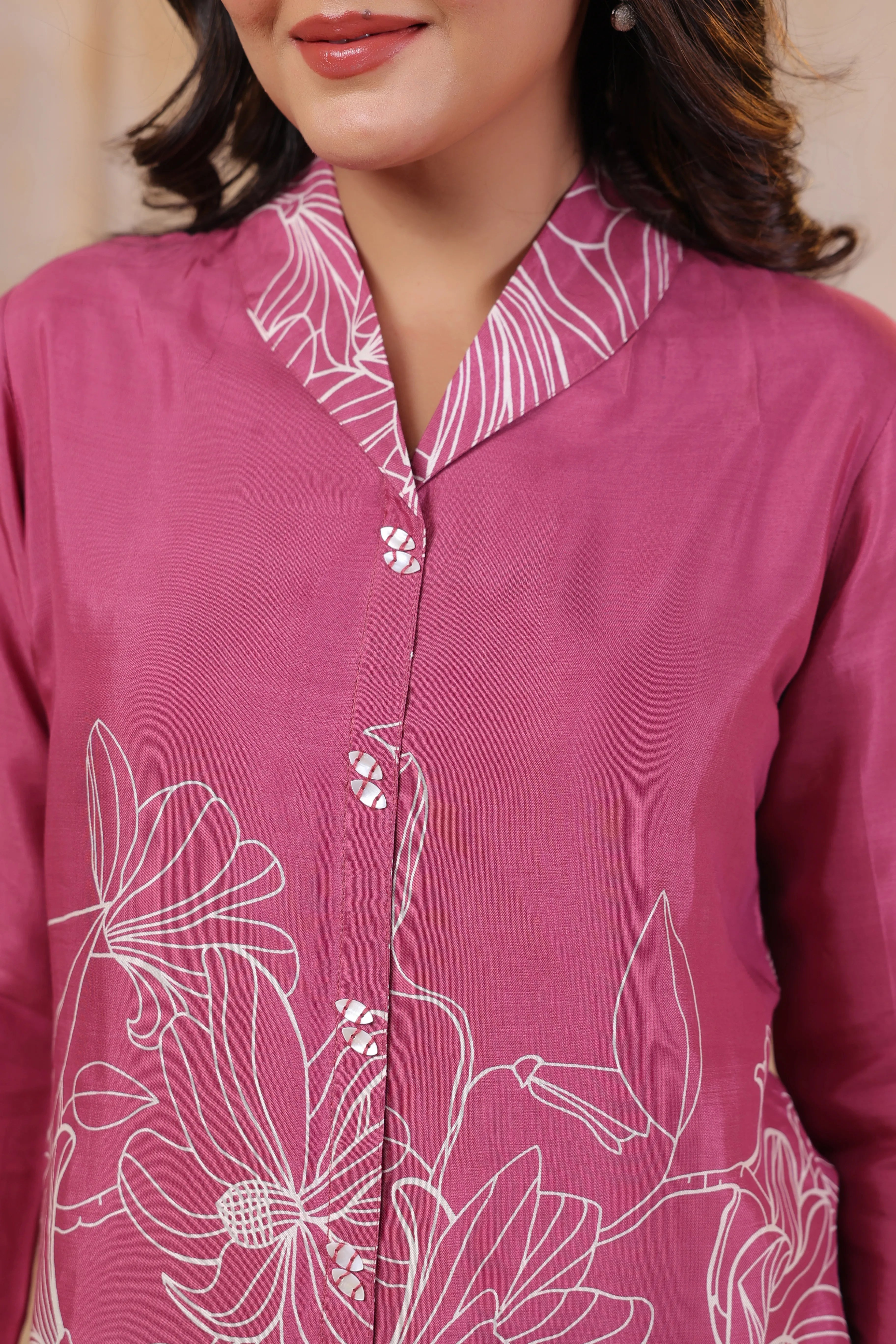 Add a touch of elegance to your wardrobe with this Pink Printed Top, crafted from luxurious Russian silk for a soft, fluid drape. Featuring a sophisticated lapel collar, 3/4th sleeves, and delicate shell buttons, this top blends timeless charm with modern refinement. The subtle yet eye-catching print enhances its versatility, making it perfect for workwear, casual outings, or stylish evenings.